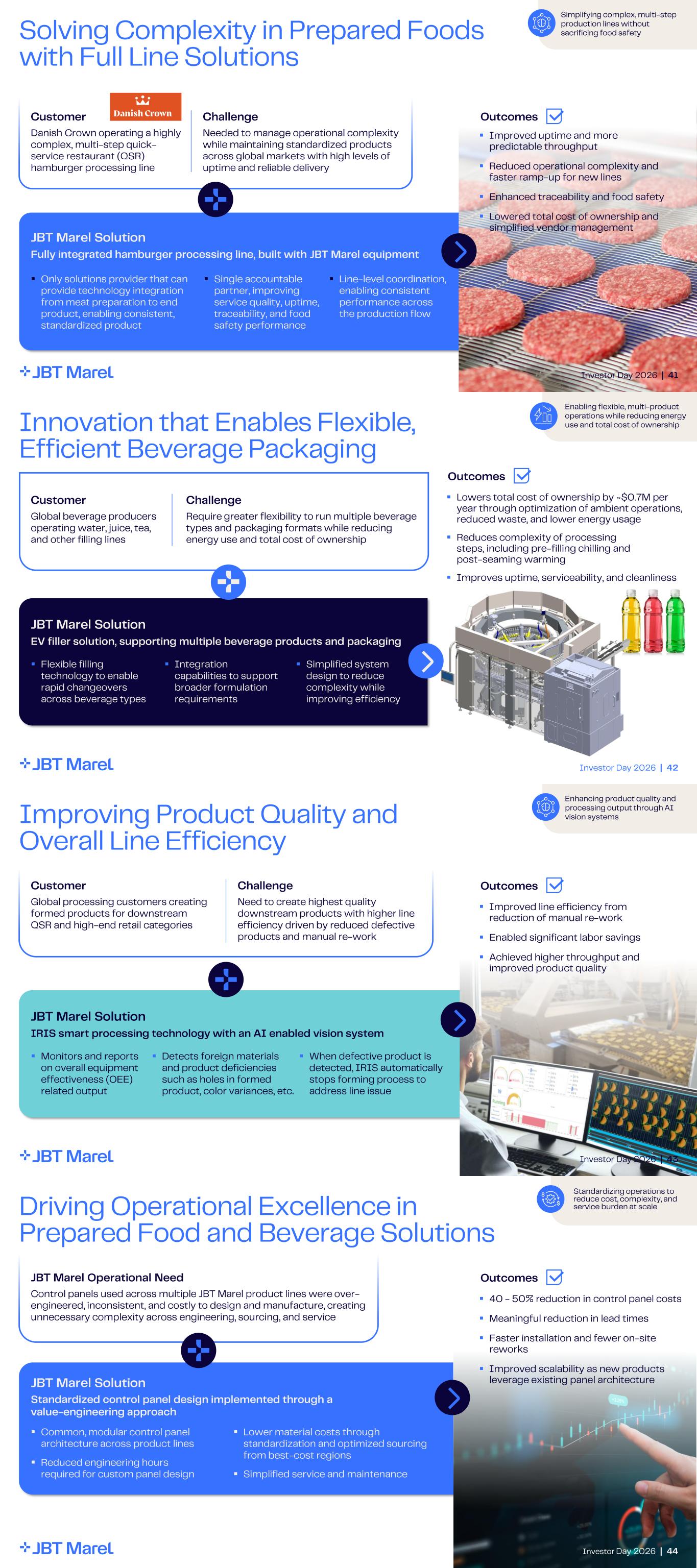 Investor Day 2026 | 41 Solving Complexity in Prepared Foods with Full Line Solutions Simplifying complex, multi - step production lines without sacrificing food safety Fully integrated hamburger processing line, built with JBT Marel equipment JBT Marel Solution Danish Crown operating a highly complex, multi - step quick - service restaurant (QSR) hamburger processing line Customer Challenge Needed to manage operational complexity while maintaining standardized products across global markets with high levels of uptime and reliable delivery ▪ Only solutions provider that can provide technology integration from meat preparation to end product, enabling consistent, standardized product ▪ Single accountable partner, improving service quality, uptime, traceability, and food safety performance Outcomes ▪ Improved uptime and more predictable throughput ▪ Reduced operational complexity and faster ramp - up for new lines ▪ Enhanced traceability and food safety ▪ Lowered total cost of ownership and simplified vendor management ▪ Line - level coordination, enabling consistent performance across the production flow Check text: should the text be the same as in the first box on slide 43? Addressing multiple customer processing applications with fuller - line and integrated solutions Investor Day 2026 | 42 Innovation that Enables Flexible, Efficient Beverage Packaging Enabling flexible, multi - product operations while reducing energy use and total cost of ownership EV filler solution, supporting multiple beverage products and packaging JBT Marel Solution ▪ Flexible filling technology to enable rapid changeovers across beverage types Global beverage producers operating water, juice, tea, and other filling lines Customer Challenge Require greater flexibility to run multiple beverage types and packaging formats while reducing energy use and total cost of ownership ▪ Integration capabilities to support broader formulation requirements ▪ Simplified system design to reduce complexity while improving efficiency Outcomes ▪ Lowers total cost of ownership by ~$0.7M per year through optimization of ambient operations, reduced waste, and lower energy usage ▪ Reduces complexity of processing steps, including pre - filling chilling and post - seaming warming ▪ Improves uptime, serviceability, and cleanliness Investor Day 2026 | 43 Improving Product Quality and Overall Line Efficiency Enhancing product quality and processing output through AI vision systems IRIS smart processing technology with an AI enabled vision system JBT Marel Solution ▪ Monitors and reports on overall equipment effectiveness (OEE) related output Global processing customers creating formed products for downstream QSR and high - end retail categories Customer Challenge Need to create highest quality downstream products with higher line efficiency driven by reduced defective products and manual re - work ▪ Detects foreign materials and product deficiencies such as holes in formed product, color variances, etc. ▪ When defective product is detected, IRIS automatically stops forming process to address line issue Outcomes ▪ Improved line efficiency from reduction of manual re - work ▪ Enabled significant labor savings ▪ Achieved higher throughput and improved product quality Investor Day 2026 | 44 Standardizing operations to reduce cost, complexity, and service burden at scale Investor Day 2026 | 44 Standardized control panel design implemented through a value - engineering approach JBT Marel Solution ▪ Common, modular control panel architecture across product lines ▪ Reduced engineering hours required for custom panel design Control panels used across multiple JBT Marel product lines were over - engineered, inconsistent, and costly to design and manufacture, creating unnecessary complexity across engineering, sourcing, and service JBT Marel Operational Need Outcomes ▪ 40 - 50% reduction in control panel costs ▪ Meaningful reduction in lead times ▪ Faster installation and fewer on - site reworks ▪ Improved scalability as new products leverage existing panel architecture Invest Day 2026 Driving Operational Excellence in Prepared Food and Beverage Solutions ▪ Lower material costs through standardization and optimized sourcing from best - cost regions ▪ Simplified service and maintenance