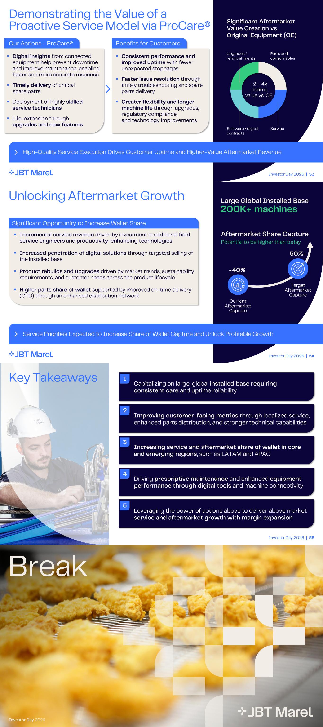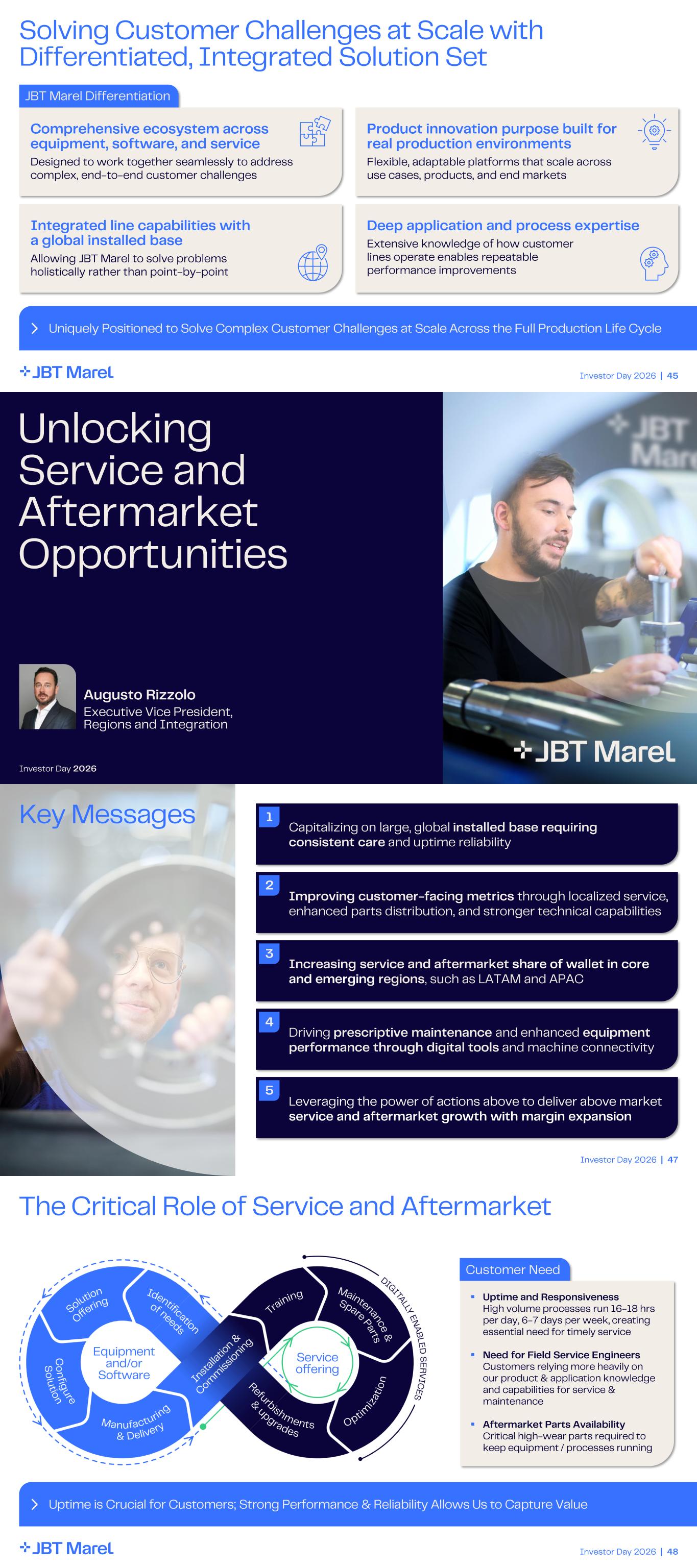 Investor Day 2026 | 45 Solving Customer Challenges at Scale with Differentiated, Integrated Solution Set Uniquely Positioned to Solve Complex Customer Challenges at Scale Across the Full Production Life Cycle JBT Marel Differentiation Comprehensive ecosystem across equipment, software, and service Designed to work together seamlessly to address complex, end - to- end customer challenges Product innovation purpose built for real production environments Flexible, adaptable platforms that scale across use cases, products, and end markets Integrated line capabilities with a global installed base Allowing JBT Marel to solve problems holistically rather than point - by - point Deep application and process expertise Extensive knowledge of how customer lines operate enables repeatable performance improvements Augusto Rizzolo Executive Vice President, Regions and Integration Unlocking Service and Aftermarket Opportunities Investor Day 2026 Investor Day 2026 | 47 2 Improving customer - facing metrics through localized service, enhanced parts distribution, and stronger technical capabilities 1 3 Increasing service and aftermarket share of wallet in core and emerging regions , such as LATAM and APAC 4 Driving prescriptive maintenance and enhanced equipment performance through digital tools and machine connectivity 5 Leveraging the power of actions above to deliver above market service and aftermarket growth with margin expansion Key Messages Capitalizing on large, global installed base requiring consistent care and uptime reliability Investor Day 2026 | 48 The Critical Role of Service and Aftermarket Uptime is Crucial for Customers; Strong Performance & Reliability Allows Us to Capture Value Customer Need ▪ Uptime and Responsiveness High volume processes run 16 - 18 hrs per day, 6 - 7 days per week, creating essential need for timely service ▪ Need for Field Service Engineers Customers relying more heavily on our product & application knowledge and capabilities for service & maintenance ▪ Aftermarket Parts Availability Critical high - wear parts required to keep equipment / processes running