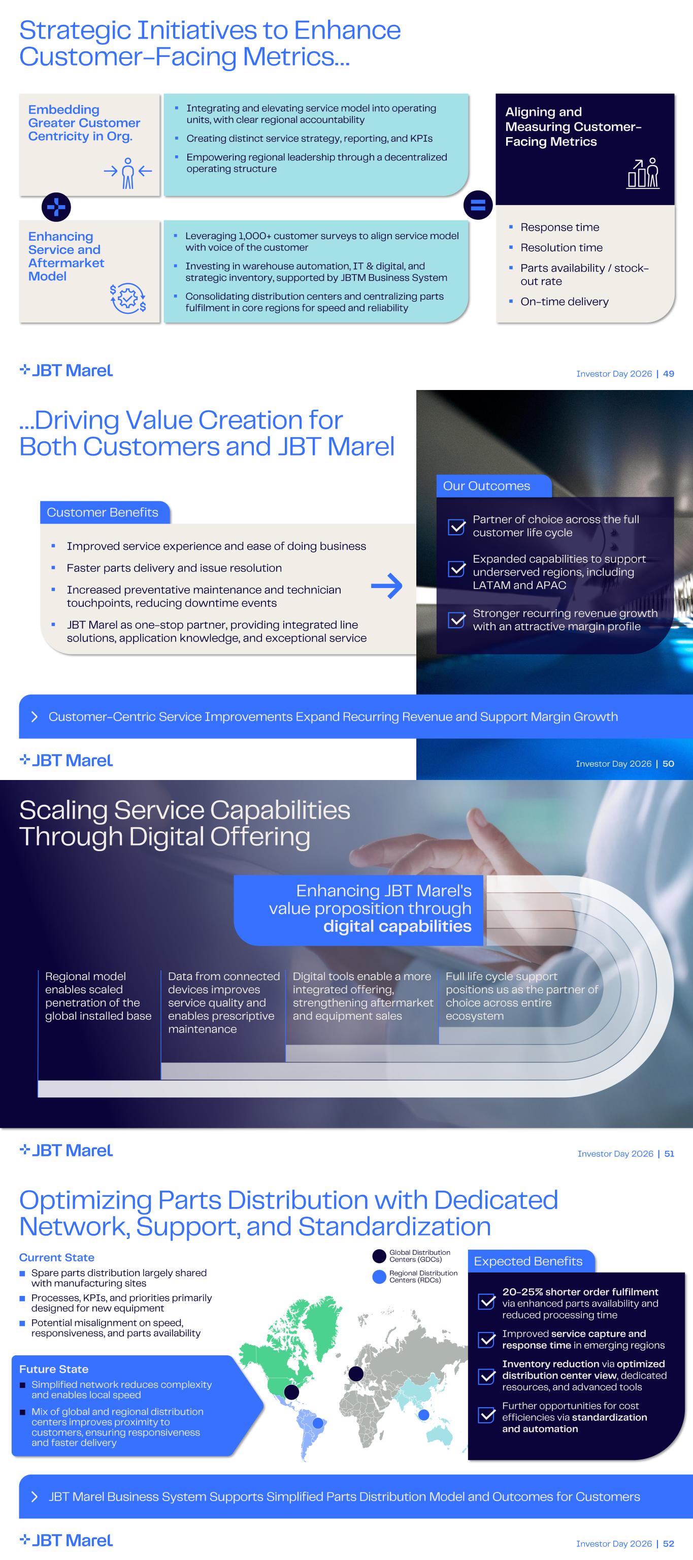 Investor Day 2026 | 49 Strategic Initiatives to Enhance Customer - Facing Metrics… ▪ Response time ▪ Resolution time ▪ Parts availability / stock - out rate ▪ On - time delivery Aligning and Measuring Customer - Facing Metrics Embedding Greater Customer Centricity in Org. Enhancing Service and Aftermarket Model ▪ Integrating and elevating service model into operating units, with clear regional accountability ▪ Creating distinct service strategy, reporting, and KPIs ▪ Empowering regional leadership through a decentralized operating structure ▪ Leveraging 1,000+ customer surveys to align service model with voice of the customer ▪ Investing in warehouse automation, IT & digital, and strategic inventory, supported by JBTM Business System ▪ Consolidating distribution centers and centralizing parts fulfilment in core regions for speed and reliability Investor Day 2026 | 50 Customer Benefits …Driving Value Creation for Both Customers and JBT Marel Customer - Centric Service Improvements Expand Recurring Revenue and Support Margin Growth ▪ Improved service experience and ease of doing business ▪ Faster parts delivery and issue resolution ▪ Increased preventative maintenance and technician touchpoints, reducing downtime events ▪ JBT Marel as one - stop partner, providing integrated line solutions, application knowledge, and exceptional service Our Outcomes Partner of choice across the full customer life cycle Expanded capabilities to support underserved regions, including LATAM and APAC Stronger recurring revenue growth with an attractive margin profile Investor Day 2026 | 51 Scaling Service Capabilities Through Digital Offering Enhancing JBT Marel's value proposition through digital capabilities Full life cycle support positions us as the partner of choice across entire ecosystem Digital tools enable a more integrated offering, strengthening aftermarket and equipment sales Data from connected devices improves service quality and enables prescriptive maintenance Regional model enables scaled penetration of the global installed base Investor Day 2026 | 52 Optimizing Parts Distribution with Dedicated Network, Support, and Standardization JBT Marel Business System Supports Simplified Parts Distribution Model and Outcomes for Customers Current State ■ Spare parts distribution largely shared with manufacturing sites ■ Processes, KPIs, and priorities primarily designed for new equipment ■ Potential misalignment on speed, responsiveness, and parts availability Expected Benefits 20 - 25% shorter order fulfilment via enhanced parts availability and reduced processing time Improved service capture and response time in emerging regions Inventory reduction via optimized distribution center view , dedicated resources, and advanced tools Further opportunities for cost efficiencies via standardization and automation Future State ■ Simplified network reduces complexity and enables local speed ■ Mix of global and regional distribution centers improves proximity to customers, ensuring responsiveness and faster delivery Global Distribution Centers (GDCs) Regional Distribution Centers (RDCs)
