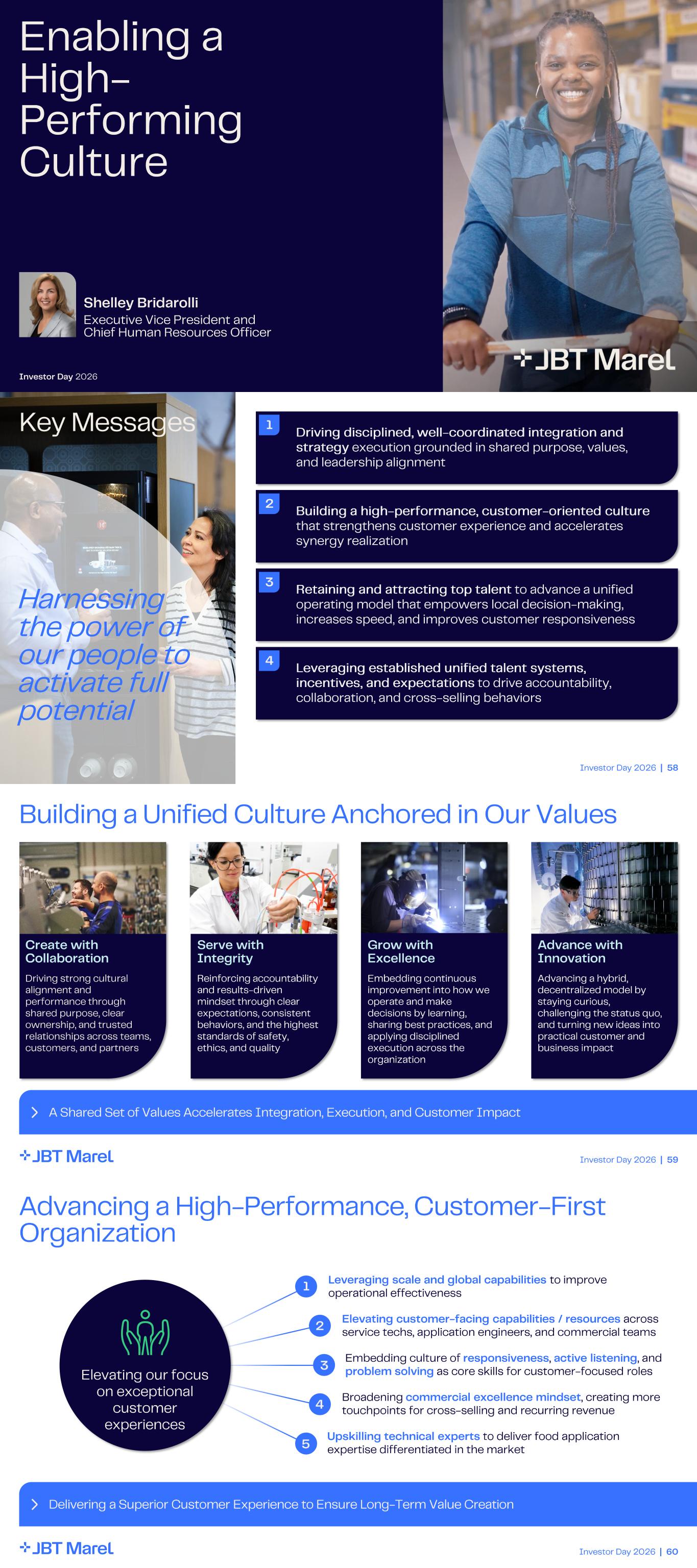 Shelley Bridarolli Executive Vice President and Chief Human Resources Officer Enabling a High - Performing Culture Investor Day 2026 Investor Day 2026 | 58 Key Messages 2 1 Driving disciplined, well - coordinated integration and strategy execution grounded in shared purpose, values, and leadership alignment 3 Retaining and attracting top talent to advance a unified operating model that empowers local decision - making, increases speed, and improves customer responsiveness 4 Leveraging established unified talent systems, incentives, and expectations to drive accountability, collaboration, and cross - selling behaviors Building a high - performance, customer - oriented culture that strengthens customer experience and accelerates synergy realization Harnessing the power of our people to activate full potential Investor Day 2026 | 59 Building a Unified Culture Anchored in Our Values A Shared Set of Values Accelerates Integration, Execution, and Customer Impact Serve with Integrity Reinforcing accountability and results - driven mindset through clear expectations, consistent behaviors, and the highest standards of safety, ethics, and quality Grow with Excellence Embedding continuous improvement into how we operate and make decisions by learning, sharing best practices, and applying disciplined execution across the organization Create with Collaboration Driving strong cultural alignment and performance through shared purpose, clear ownership, and trusted relationships across teams, customers, and partners Advance with Innovation Advancing a hybrid, decentralized model by staying curious, challenging the status quo, and turning new ideas into practical customer and business impact Investor Day 2026 | 60 Advancing a High - Performance, Customer - First Organization Leveraging scale and global capabilities to improve operational effectiveness Delivering a Superior Customer Experience to Ensure Long - Term Value Creation Elevating customer - facing capabilities / resources across service techs, application engineers, and commercial teams Embedding culture of responsiveness , active listening , and problem solving as core skills for customer - focused roles Broadening commercial excellence mindset , creating more touchpoints for cross - selling and recurring revenue Upskilling technical experts to deliver food application expertise differentiated in the market 1 2 3 4 5 Elevating our focus on exceptional customer experiences