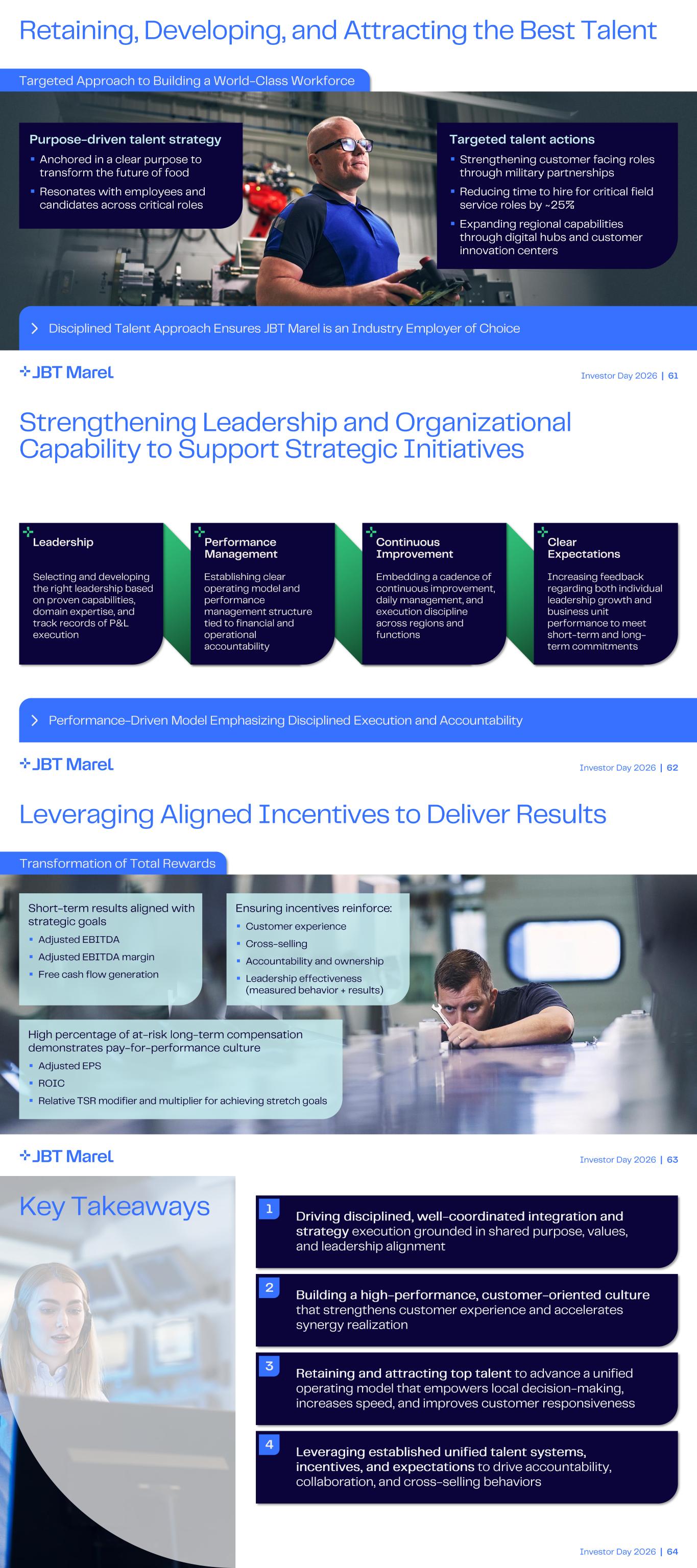 Investor Day 2026 | 61 Targeted Approach to Building a World - Class Workforce Disciplined Talent Approach Ensures JBT Marel is an Industry Employer of Choice Purpose - driven talent strategy ▪ Anchored in a clear purpose to transform the future of food ▪ Resonates with employees and candidates across critical roles Targeted talent actions ▪ Strengthening customer facing roles through military partnerships ▪ Reducing time to hire for critical field service roles by ~ 25 % ▪ Expanding regional capabilities through digital hubs and customer innovation centers Retaining, Developing, and Attracting the Best Talent Investor Day 2026 | 62 Strengthening Leadership and Organizational Capability to Support Strategic Initiatives Performance - Driven Model Emphasizing Disciplined Execution and Accountability Leadership Selecting and developing the right leadership based on proven capabilities, domain expertise, and track records of P&L execution Performance Management Continuous Improvement Clear Expectations Establishing clear operating model and performance management structure tied to financial and operational accountability Embedding a cadence of continuous improvement, daily management, and execution discipline across regions and functions Increasing feedback regarding both individual leadership growth and business unit performance to meet short - term and long - term commitments Investor Day 2026 | 63 Transformation of Total Rewards Leveraging Aligned Incentives to Deliver Results Short - term results aligned with strategic goals ▪ Adjusted EBITDA ▪ Adjusted EBITDA margin ▪ Free cash flow generation Ensuring incentives reinforce: ▪ Customer experience ▪ Cross - selling ▪ Accountability and ownership ▪ Leadership effectiveness (measured behavior + results) High percentage of at - risk long - term compensation demonstrates pay - for - performance culture ▪ Adjusted EPS ▪ ROIC ▪ Relative TSR modifier and multiplier for achieving stretch goals Investor Day 2026 | 64 Key Takeaways 2 1 Driving disciplined, well - coordinated integration and strategy execution grounded in shared purpose, values, and leadership alignment 3 Retaining and attracting top talent to advance a unified operating model that empowers local decision - making, increases speed, and improves customer responsiveness 4 Leveraging established unified talent systems, incentives, and expectations to drive accountability, collaboration, and cross - selling behaviors Building a high - performance, customer - oriented culture that strengthens customer experience and accelerates synergy realization