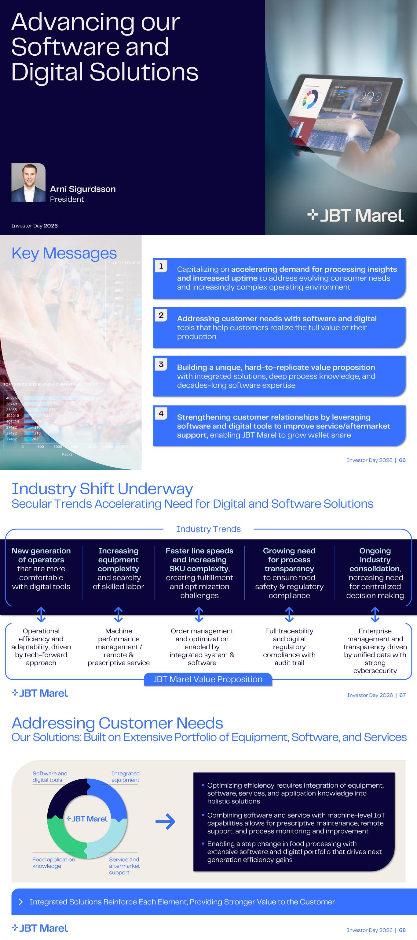 Arni Sigurdsson President Advancing our Software and Digital Solutions Investor Day 2026 Investor Day 2026 | 66 Key Messages 1 Capitalizing on accelerating demand for processing insights and increased uptime to address evolving consumer needs and increasingly complex operating environment 2 Addressing customer needs with software and digital tools that help customers realize the full value of their production 3 Building a unique, hard - to - replicate value proposition with integrated solutions, deep process knowledge, and decades - long software expertise 4 Strengthening customer relationships by leveraging software and digital tools to improve service/aftermarket support, enabling JBT Marel to grow wallet share Investor Day 2026 | 67 Industry Shift Underway Secular Trends Accelerating Need for Digital and Software Solutions Industry Trends Secular Trends Accelerating Demand for Digital & Software Solutions Operational efficiency and adaptability, driven by tech - forward approach Machine performance management / remote & prescriptive service Order management and optimization enabled by integrated system & software Full traceability and digital regulatory compliance with audit trail Enterprise management and transparency driven by unified data with strong cybersecurity Increasing equipment complexity and scarcity of skilled labor Faster line speeds and increasing SKU complexity , creating fulfillment and optimization challenges Growing need for process transparency to ensure food safety & regulatory compliance Ongoing industry consolidation , increasing need for centralized decision making New generation of operators that are more comfortable with digital tools JBT Marel Value Proposition Investor Day 2026 | 68 Integrated Solutions Reinforce Each Element, Providing Stronger Value to the Customer Addressing Customer Needs Our Solutions: Built on Extensive Portfolio of Equipment, Software, and Services ▪ Optimizing efficiency requires integration of equipment, software, services, and application knowledge into holistic solutions ▪ Combining software and service with machine - level IoT capabilities allows for prescriptive maintenance, remote support, and process monitoring and improvement ▪ Enabling a step change in food processing with extensive software and digital portfolio that drives next generation efficiency gains Integrated equipment Food application knowledge Software and digital tools Service and aftermarket support Integrated equipment Food application knowledge Software and digital tools Service and aftermarket support