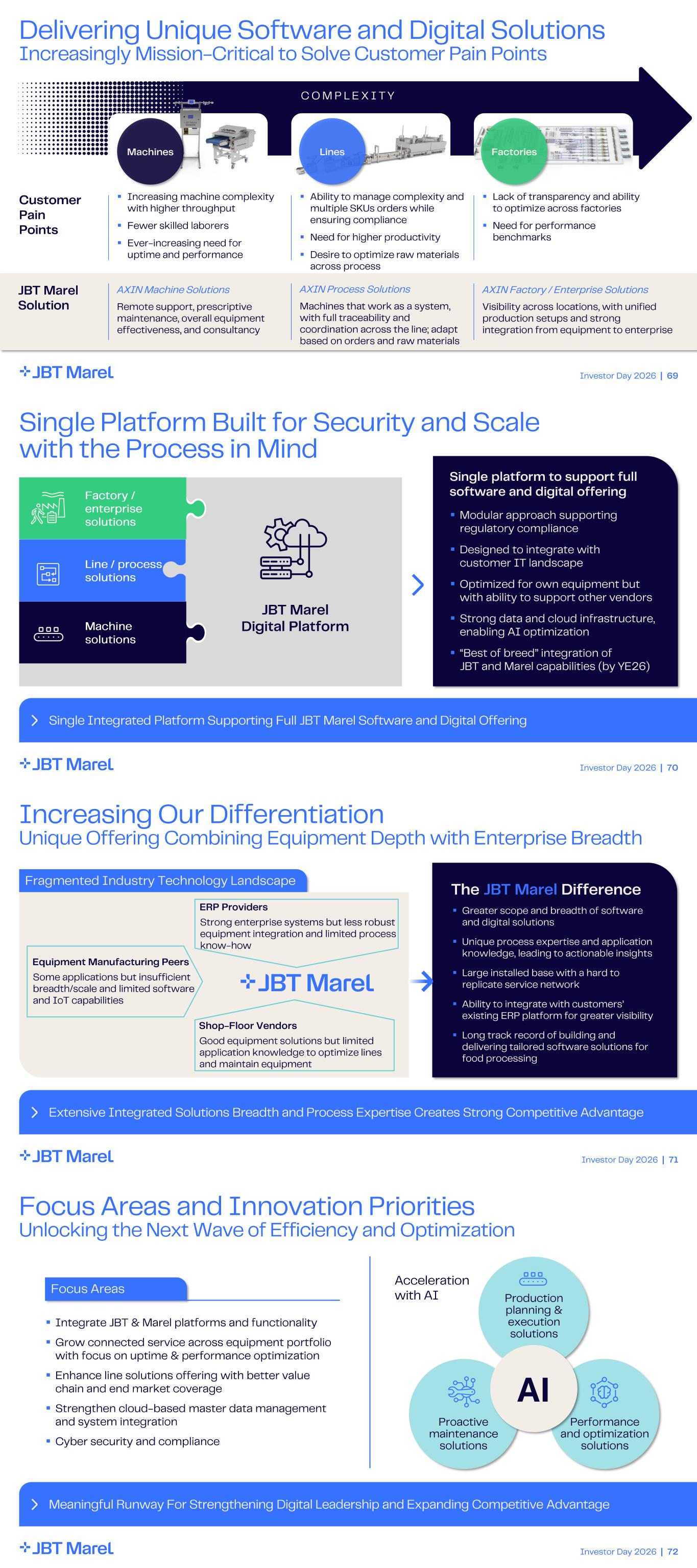 Investor Day 2026 | 69 Delivering Unique Software and Digital Solutions Increasingly Mission - Critical to Solve Customer Pain Points ▪ Increasing machine complexity with higher throughput ▪ Fewer skilled laborers ▪ Ever - increasing need for uptime and performance Customer Pain Points JBT Marel Solution ▪ Ability to manage complexity and multiple SKUs orders while ensuring compliance ▪ Need for higher productivity ▪ Desire to optimize raw materials across process ▪ Lack of transparency and ability to optimize across factories ▪ Need for performance benchmarks AXIN Machine Solutions Remote support, prescriptive maintenance, overall equipment effectiveness, and consultancy AXIN Process Solutions Machines that work as a system, with full traceability and coordination across the line; adapt based on orders and raw materials AXIN Factory / Enterprise Solutions Visibility across locations, with unified production setups and strong integration from equipment to enterprise COMPLEXITY Lines FactoriesMachines Investor Day 2026 | 70 Single Integrated Platform Supporting Full JBT Marel Software and Digital Offering Single Platform Built for Security and Scale with the Process in Mind JBT Marel Digital Platform Single platform to support full software and digital offering ▪ Modular approach supporting regulatory compliance ▪ Designed to integrate with customer IT landscape ▪ Optimized for own equipment but with ability to support other vendors ▪ Strong data and cloud infrastructure, enabling AI optimization ▪ “Best of breed” integration of JBT and Marel capabilities (by YE26) Line / process solutions Factory / enterprise solutions Machine solutions Investor Day 2026 | 71 Fragmented Industry Technology Landscape Extensive Integrated Solutions Breadth and Process Expertise Creates Strong Competitive Advantage Increasing Our Differentiation Unique Offering Combining Equipment Depth with Enterprise Breadth ERP Providers Strong enterprise systems but less robust equipment integration and limited process know - how Shop - Floor Vendors Good equipment solutions but limited application knowledge to optimize lines and maintain equipment Equipment Manufacturing Peers Some applications but insufficient breadth/scale and limited software and IoT capabilities The JBT Marel Difference ▪ Greater scope and breadth of software and digital solutions ▪ Unique process expertise and application knowledge, leading to actionable insights ▪ Large installed base with a hard to replicate service network ▪ Ability to integrate with customers’ existing ERP platform for greater visibility ▪ Long track record of building and delivering tailored software solutions for food processing Investor Day 2026 | 72 Focus Areas Focus Areas and Innovation Priorities Unlocking the Next Wave of Efficiency and Optimization Meaningful Runway For Strengthening Digital Leadership and Expanding Competitive Advantage ▪ Integrate JBT & Marel platforms and functionality ▪ Grow connected service across equipment portfolio with focus on uptime & performance optimization ▪ Enhance line solutions offering with better value chain and end market coverage ▪ Strengthen cloud - based master data management and system integration ▪ Cyber security and compliance Acceleration with AI Proactive maintenance solutions Production planning & execution solutions Performance and optimization solutions AI Acceleration with AI Proactive maintenance s olutions Production planning & execution solutions Performance and optimization s olutions AI Proactive maintenance solutions Production planning & execution solutions Performance and optimization solutions AI