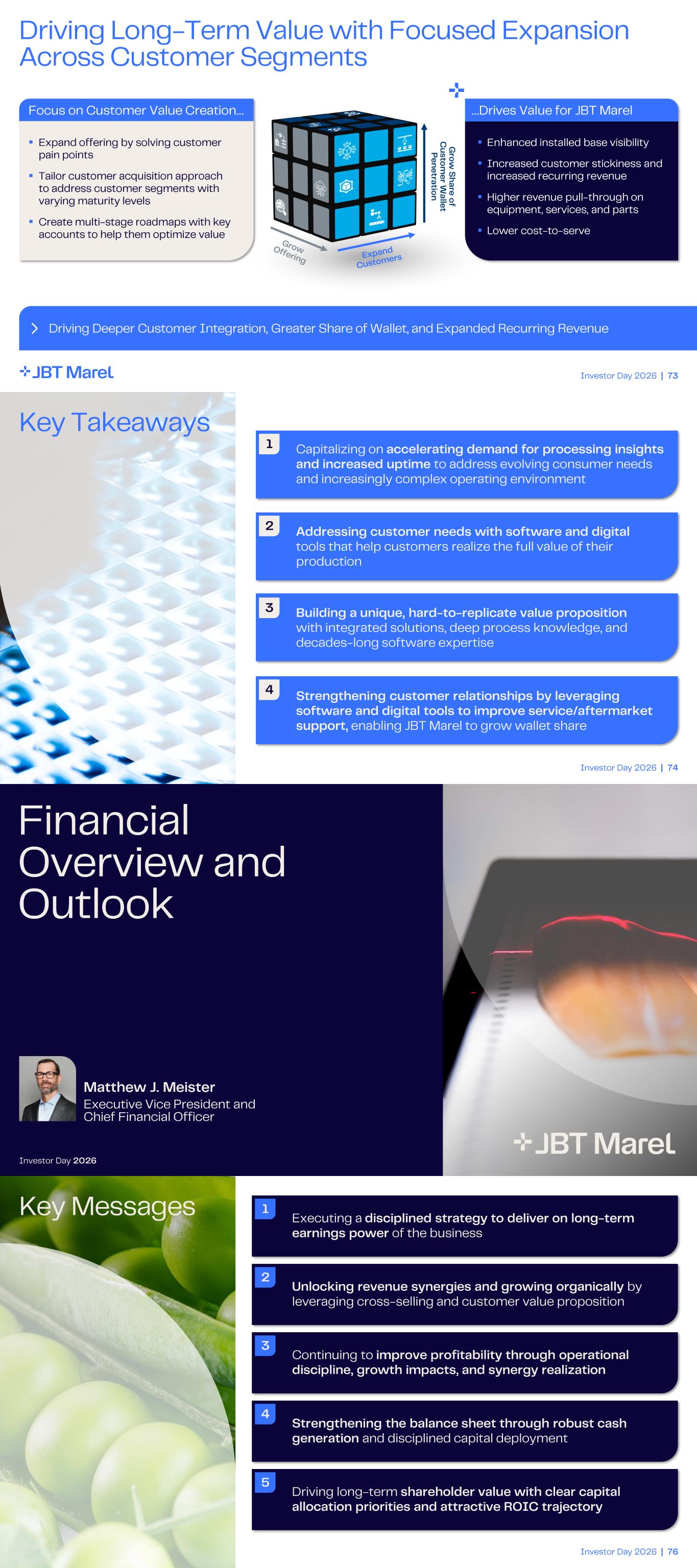 Investor Day 2026 | 73 Focus on Customer Value Creation… Driving Deeper Customer Integration, Greater Share of Wallet, and Expanded Recurring Revenue Driving Long - Term Value with Focused Expansion Across Customer Segments G ro w Sh are o f C u sto m e r W alle t P e n e tratio n ▪ Expand offering by solving customer pain points ▪ Tailor customer acquisition approach to address customer segments with varying maturity levels ▪ Create multi - stage roadmaps with key accounts to help them optimize value …Drives Value for JBT Marel ▪ Enhanced installed base visibility ▪ Increased customer stickiness and increased recurring revenue ▪ Higher revenue pull - through on equipment, services, and parts ▪ Lower cost - to- serve Investor Day 2026 | 74 Key Takeaways 1 Capitalizing on accelerating demand for processing insights and increased uptime to address evolving consumer needs and increasingly complex operating environment 2 Addressing customer needs with software and digital tools that help customers realize the full value of their production 3 Building a unique, hard - to - replicate value proposition with integrated solutions, deep process knowledge, and decades - long software expertise 4 Strengthening customer relationships by leveraging software and digital tools to improve service/aftermarket support, enabling JBT Marel to grow wallet share Matthew J. Meister Executive Vice President and Chief Financial Officer Financial Overview and Outlook Investor Day 2026 Investor Day 2026 | 76 Key Messages 2 Unlocking revenue synergies and growing organically by leveraging cross - selling and customer value proposition 1 Executing a disciplined strategy to deliver on long - term earnings power of the business 3 Continuing to improve profitability through operational discipline, growth impacts, and synergy realization 4 Strengthening the balance sheet through robust cash generation and disciplined capital deployment 5 Driving long - term shareholder value with clear capital allocation priorities and attractive ROIC trajectory