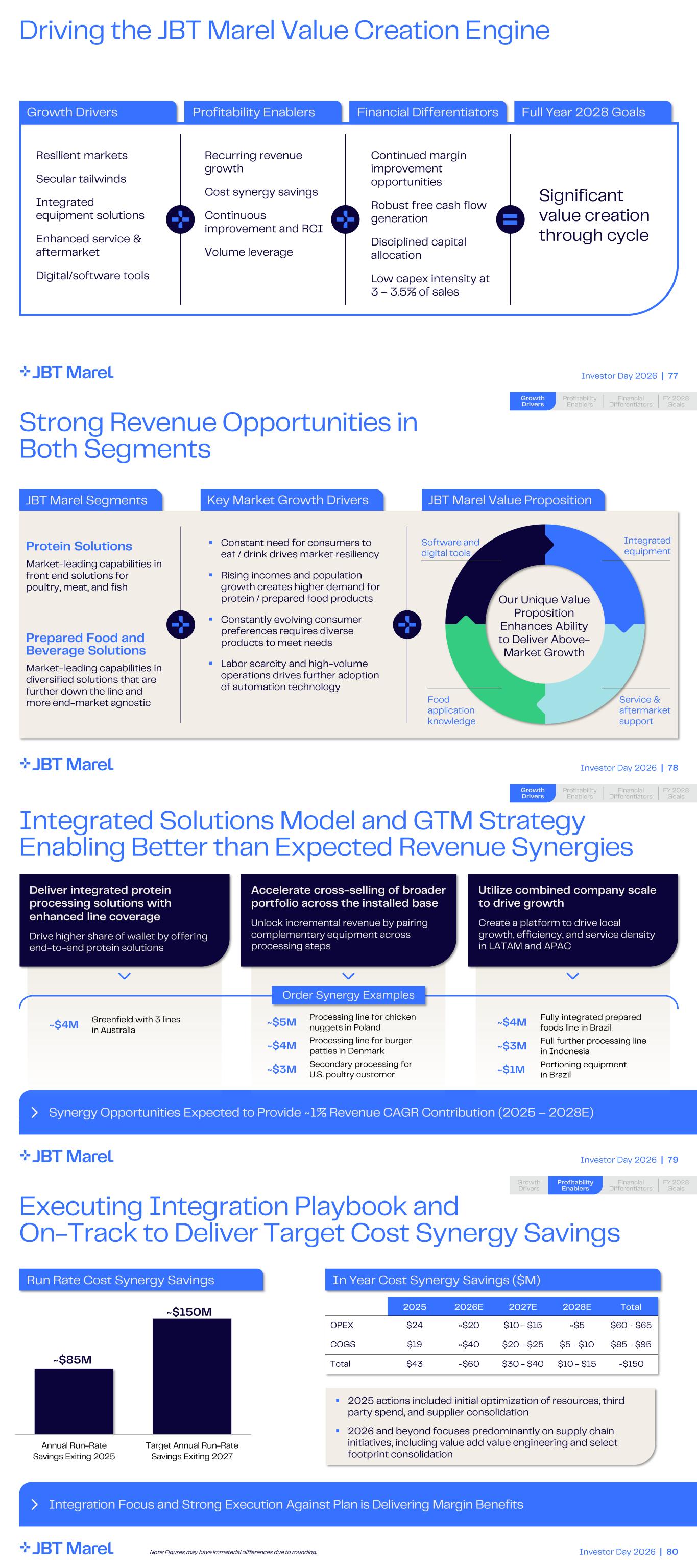 Investor Day 2026 | 77 Driving the JBT Marel Value Creation Engine Resilient markets Secular tailwinds Integrated equipment solutions Enhanced service & aftermarket Digital/software tools Recurring revenue growth Cost synergy savings Continuous improvement and RCI Volume leverage Continued margin improvement opportunities Robust free cash flow generation Disciplined capital allocation Low capex intensity at 3 – 3.5% of sales Significant value creation through cycle Financial Differentiators Full Year 2028 GoalsGrowth Drivers Profitability Enablers Investor Day 2026 | 78 Key Market Growth Drivers Strong Revenue Opportunities in Both Segments ▪ Constant need for consumers to eat / drink drives market resiliency ▪ Rising incomes and population growth creates higher demand for protein / prepared food products ▪ Constantly evolving consumer preferences requires diverse products to meet needs ▪ Labor scarcity and high - volume operations drives further adoption of automation technology JBT Marel Value Proposition Our Unique Value Proposition Enhances Ability to Deliver Above - Market Growth JBT Marel Segments Protein Solutions Prepared Food and Beverage Solutions Market - leading capabilities in front end solutions for poultry, meat, and fish Market - leading capabilities in diversified solutions that are further down the line and more end - market agnostic Integrated equipment Food application knowledge Software and digital tools Service & aftermarket support Financial Differentiators Profitability Enablers FY 2028 Goals Growth Drivers Investor Day 2026 | 79 Integrated Solutions Model and GTM Strategy Enabling Better than Expected Revenue Synergies Synergy Opportunities Expected to Provide ~1% Revenue CAGR Contribution (2025 – 2028E) Financial Differentiators Profitability Enablers FY 2028 Goals Growth Drivers Deliver integrated protein processing solutions with enhanced line coverage Drive higher share of wallet by offering end - to- end protein solutions Order Synergy Examples Accelerate cross - selling of broader portfolio across the installed base Unlock incremental revenue by pairing complementary equipment across processing steps Utilize combined company scale to drive growth Create a platform to drive local growth, efficiency, and service density in LATAM and APAC ~$4M Greenfield with 3 lines in Australia ~$4M Fully integrated prepared foods line in Brazil ~$3M Full further processing line in Indonesia ~$1M Portioning equipment in Brazil ~$5M Processing line for chicken nuggets in Poland ~$4M Processing line for burger patties in Denmark ~$3M Secondary processing for U.S. poultry customer Investor Day 2026 | 80 Executing Integration Playbook and On - Track to Deliver Target Cost Synergy Savings Integration Focus and Strong Execution Against Plan is Delivering Margin Benefits Annual Run - Rate Savings Exiting 2025 Target Annual Run - Rate Savings Exiting 2027 ~$85M ~$150M Run Rate Cost Synergy Savings Financial Differentiators Profitability Enablers FY 2028 Goals Growth Drivers In Year Cost Synergy Savings ($M) 2025 2026E 2027E 2028E Total OPEX $24 ~$20 $10 - $15 ~$5 $60 - $65 COGS $19 ~$40 $20 - $25 $5 - $10 $85 - $95 Total $43 ~$60 $30 - $40 $10 - $15 ~$150 ▪ 2025 actions included initial optimization of resources, third party spend, and supplier consolidation ▪ 2026 and beyond focuses predominantly on supply chain initiatives, including value add value engineering and select footprint consolidation Note: Figures may have immaterial differences due to rounding.