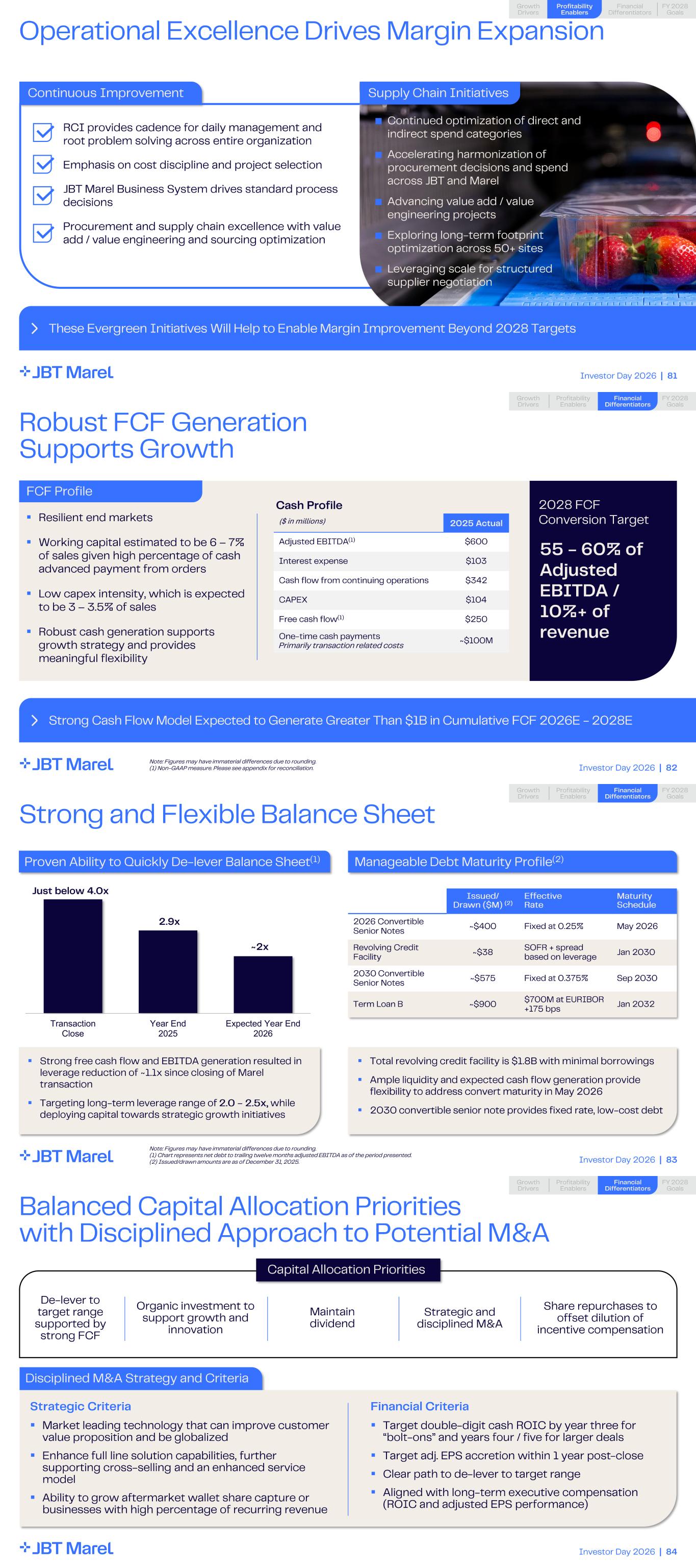 Investor Day 2026 | 81 Continuous Improvement Operational Excellence Drives Margin Expansion These Evergreen Initiatives Will Help to Enable Margin Improvement Beyond 2028 Targets Profitability Enablers RCI provides cadence for daily management and root problem solving across entire organization Emphasis on cost discipline and project selection JBT Marel Business System drives standard process decisions Procurement and supply chain excellence with value add / value engineering and sourcing optimization Supply Chain Initiatives Financial Differentiators Profitability Enablers FY 2028 Goals Growth Drivers ■ Continued optimization of direct and indirect spend categories ■ Accelerating harmonization of procurement decisions and spend across JBT and Marel ■ Advancing value add / value engineering projects ■ Exploring long - term footprint optimization across 50+ sites ■ Leveraging scale for structured supplier negotiation Investor Day 2026 | 82 Robust FCF Generation Supports Growth Strong Cash Flow Model Expected to Generate Greater Than $1B in Cumulative FCF 2026E - 2028E ▪ Resilient end markets ▪ Working capital estimated to be 6 – 7% of sales given high percentage of cash advanced payment from orders ▪ Low capex intensity, which is expected to be 3 – 3.5% of sales ▪ Robust cash generation supports growth strategy and provides meaningful flexibility Cash Profile ($ in millions) 2025 Actual Adjusted EBITDA (1) $600 Interest expense $103 Cash flow from continuing operations $342 CAPEX $104 Free cash flow (1) $250 One - time cash payments Primarily transaction related costs ~$100M 2028 FCF Conversion Target 55 - 60% of Adjusted EBITDA / 10%+ of revenue FCF Profile Financial Differentiators Profitability Enablers FY 2028 Goals Growth Drivers Note: Figures may have immaterial differences due to rounding. (1) Non-GAAP measure. Please see appendix for reconciliation. Investor Day 2026 | 83 Strong and Flexible Balance Sheet ▪ Total revolving credit facility is $1.8B with minimal borrowings ▪ Ample liquidity and expected cash flow generation provide flexibility to address convert maturity in May 2026 ▪ 2030 convertible senior note provides fixed rate, low - cost debt ▪ Strong free cash flow and EBITDA generation resulted in leverage reduction of ~1.1x since closing of Marel transaction ▪ Targeting long - term leverage range of 2.0 - 2.5x, while deploying capital towards strategic growth initiatives Transaction Close Year End 2025 Expected Year End 2026 Issued/ Drawn ($ M) (2) Effective Rate Maturity Schedule 2026 Convertible Senior Notes ~$400 Fixed at 0.25% May 2026 Revolving Credit Facility ~$38 SOFR + spread based on leverage Jan 2030 2030 Convertible Senior Notes ~$575 Fixed at 0.375% Sep 2030 Term Loan B ~$900 $700M at EURIBOR +175 bps Jan 2032 Proven Ability to Quickly De - lever Balance Sheet (1) Manageable Debt Maturity Profile (2) Financial Differentiators Financial Differentiators Profitability Enablers FY 2028 Goals Growth Drivers Just below 4.0x 2.9x ~2x Note: Figures may have immaterial differences due to rounding. (1) Chart represents net debt to trailing twelve months adjusted EBITDA as of the period presented. (2) Issued/drawn amounts are as of December 31, 2025. Investor Day 2026 | 84 Balanced Capital Allocation Priorities with Disciplined Approach to Potential M&A De - lever to target range supported by strong FCF Financial Differentiators Strategic and disciplined M&A Organic investment to support growth and innovation Share repurchases to offset dilution of incentive compensation Disciplined M&A Strategy and Criteria Capital Allocation Priorities Financial Differentiators Profitability Enablers FY 2028 Goals Growth Drivers Maintain dividend Financial Criteria ▪ Target double - digit cash ROIC by year three for “bolt- ons ” and years four / five for larger deals ▪ Target adj. EPS accretion within 1 year post - close ▪ Clear path to de - lever to target range ▪ Aligned with long - term executive compensation (ROIC and adjusted EPS performance) Strategic Criteria ▪ Market leading technology that can improve customer value proposition and be globalized ▪ Enhance full line solution capabilities, further supporting cross - selling and an enhanced service model ▪ Ability to grow aftermarket wallet share capture or businesses with high percentage of recurring revenue