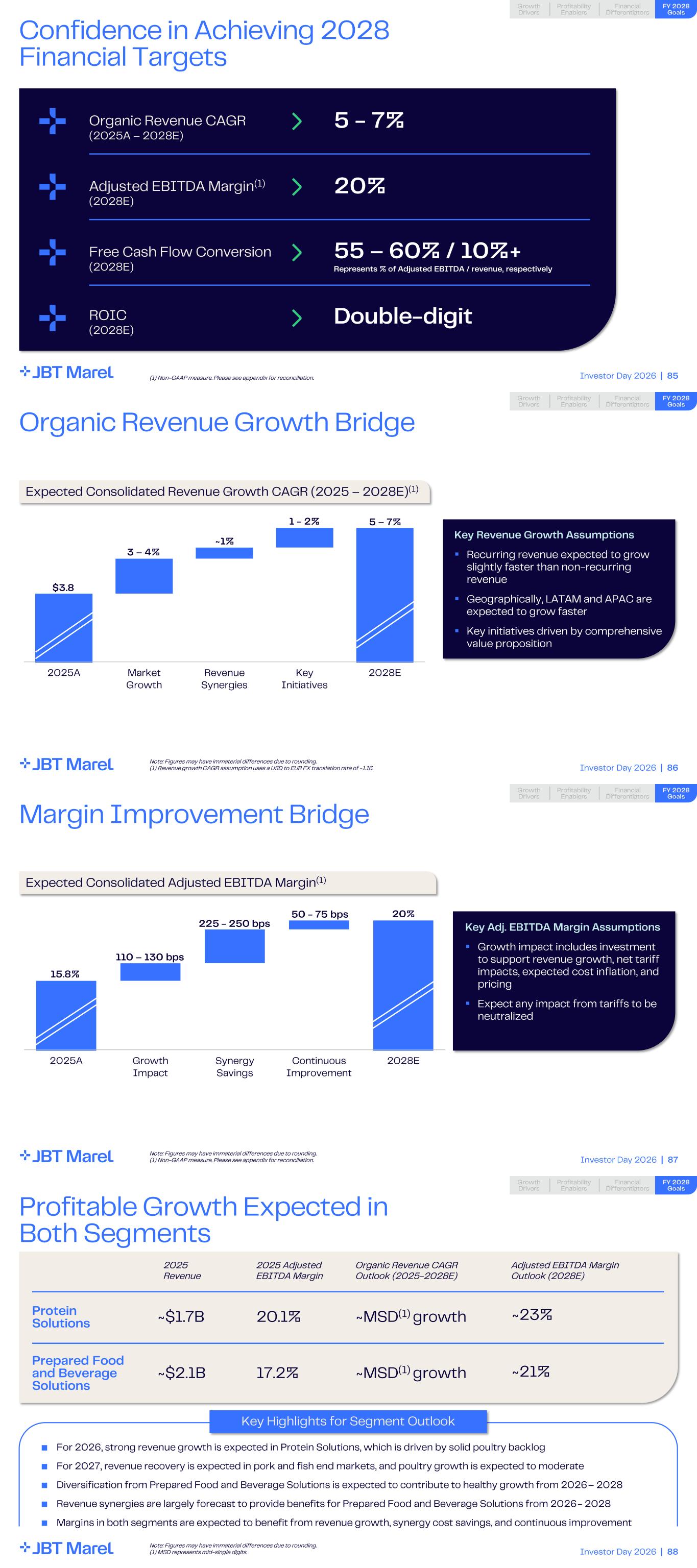 Investor Day 2026 | 85 Confidence in Achieving 2028 Financial Targets 5 - 7% 20% 55 – 60% / 10%+ Represents % of Adjusted EBITDA / revenue, respectively Double - digit Organic Revenue CAGR (2025A – 2028E) Adjusted EBITDA Margin (1) (2028E) Free Cash Flow Conversion (2028E) Financial Differentiators Profitability Enablers FY 2028 Goals Growth Drivers ROIC (2028E) (1) Non-GAAP measure. Please see appendix for reconciliation. Investor Day 2026 | 86 Organic Revenue Growth Bridge 2025A Market Growth Revenue Synergies Key Initiatives 2028E Expected Consolidated Revenue Growth CAGR (2025 – 2028E) (1) FY 2028 Goals Financial Differentiators Profitability Enablers FY 2028 Goals Growth Drivers Key Revenue Growth Assumptions ▪ Recurring revenue expected to grow slightly faster than non - recurring revenue ▪ Geographically, LATAM and APAC are expected to grow faster ▪ Key initiatives driven by comprehensive value proposition 3 – 4% ~1% 1 - 2% 5 – 7% $3.8 Note: Figures may have immaterial differences due to rounding. (1) Revenue growth CAGR assumption uses a USD to EUR FX translation rate of ~1.16. Investor Day 2026 | 87 Margin Improvement Bridge 2025A Growth Impact Synergy Savings Continuous Improvement 2028E Expected Consolidated Adjusted EBITDA Margin (1) FY 2028 Goals Financial Differentiators Profitability Enablers FY 2028 Goals Growth Drivers Key Adj. EBITDA Margin Assumptions ▪ Growth impact includes investment to support revenue growth, net tariff impacts, expected cost inflation, and pricing ▪ Expect any impact from tariffs to be neutralized 15.8% 20%50 - 75 bps 225 - 250 bps 110 – 130 bps Note: Figures may have immaterial differences due to rounding. (1) Non-GAAP measure. Please see appendix for reconciliation. Investor Day 2026 | 88 Profitable Growth Expected in Both Segments Financial Differentiators Profitability Enablers FY 2028 Goals Growth Drivers Protein Solutions Prepared Food and Beverage Solutions 2025 Revenue 2025 Adjusted EBITDA Margin Organic Revenue CAGR Outlook (2025-2028E) Adjusted EBITDA Margin Outlook (2028E) ~$1.7B 20.1% Key Highlights for Segment Outlook ~$2.1B 17.2% ■ For 2026, strong revenue growth is expected in Protein Solutions, which is driven by solid poultry backlog ■ For 2027, revenue recovery is expected in pork and fish end markets, and poultry growth is expected to moderate ■ Diversification from Prepared Food and Beverage Solutions is expected to contribute to healthy growth from 2026 – 2028 ■ Revenue synergies are largely forecast to provide benefits for Prepared Food and Beverage Solutions from 2026 - 2028 ■ Margins in both segments are expected to benefit from revenue growth, synergy cost savings, and continuous improvement ~23% ~21%~MSD (1) growth . ~MSD (1) growth Note: Figures may have immaterial differences due to rounding. (1) MSD represents mid-single digits.