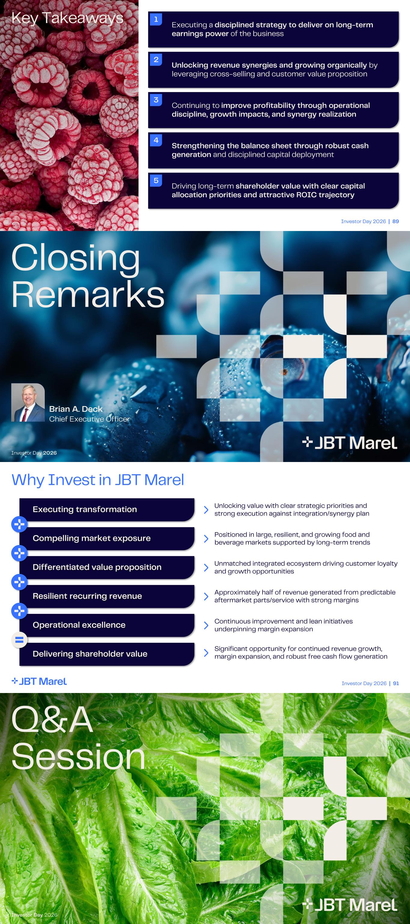 Investor Day 2026 | 89 Key Takeaways 2 Unlocking revenue synergies and growing organically by leveraging cross - selling and customer value proposition 1 Executing a disciplined strategy to deliver on long - term earnings power of the business 3 Continuing to improve profitability through operational discipline, growth impacts, and synergy realization 4 Strengthening the balance sheet through robust cash generation and disciplined capital deployment 5 Driving long - term shareholder value with clear capital allocation priorities and attractive ROIC trajectory Closing Remarks Investor Day 2026 Brian A. Deck Chief Executive Officer Investor Day 2026 | 91 Executing transformation Compelling market exposure Resilient recurring revenue Operational excellence Delivering shareholder value Differentiated value proposition Why Invest in JBT Marel Approximately half of revenue generated from predictable aftermarket parts/service with strong margins Positioned in large, resilient, and growing food and beverage markets supported by long - term trends Continuous improvement and lean initiatives underpinning margin expansion Significant opportunity for continued revenue growth, margin expansion, and robust free cash flow generation Unlocking value with clear strategic priorities and strong execution against integration/synergy plan Unmatched integrated ecosystem driving customer loyalty and growth opportunities Q&A Session Investor Day 2026