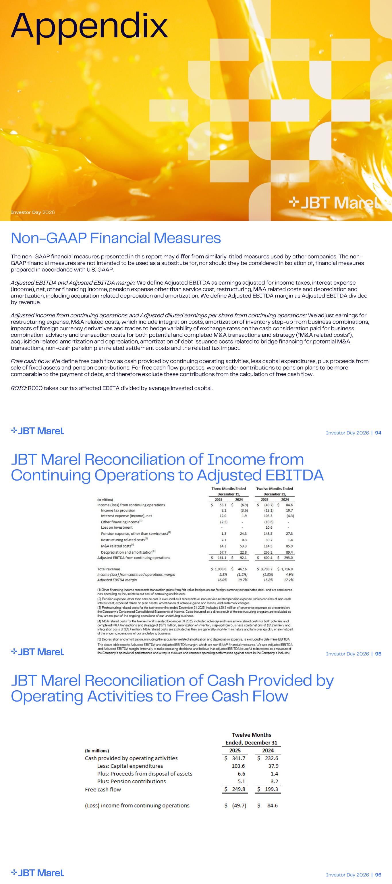 Investor Day 2026 | 93 Appendix Investor Day 2026 Investor Day 2026 | 94 Non - GAAP Financial Measures The non - GAAP financial measures presented in this report may differ from similarly - titled measures used by other companies. The non - GAAP financial measures are not intended to be used as a substitute for, nor should they be considered in isolation of, finan cia l measures prepared in accordance with U.S. GAAP. Adjusted EBITDA and Adjusted EBITDA margin: We define Adjusted EBITDA as earnings adjusted for income taxes, interest expense (income), net, other financing income, pension expense other than service cost, restructuring, M&A related costs and deprecia tion and amortization, including acquisition related depreciation and amortization. We define Adjusted EBITDA margin as Adjusted EBITD A d ivided by revenue. Adjusted income from continuing operations and Adjusted diluted earnings per share from continuing operations: We adjust earnings for restructuring expense, M&A related costs, which include integration costs, amortization of inventory step - up from business combi nations, impacts of foreign currency derivatives and trades to hedge variability of exchange rates on the cash consideration paid for bus iness combination, advisory and transaction costs for both potential and completed M&A transactions and strategy (“M&A related cost s”), acquisition related amortization and depreciation, amortization of debt issuance costs related to bridge financing for potent ial M&A transactions, non - cash pension plan related settlement costs and the related tax impact. Free cash flow: We define free cash flow as cash provided by continuing operating activities, less capital expenditures, plus proceeds from sale of fixed assets and pension contributions. For free cash flow purposes, we consider contributions to pension plans to be mo re comparable to the payment of debt, and therefore exclude these contributions from the calculation of free cash flow. ROIC: ROIC takes our tax affected EBITA divided by average invested capital. Investor Day 2026 | 95 JBT Marel Reconciliation of Income from Continuing Operations to Adjusted EBITDA Investor Day 2026 | 96 JBT Marel Reconciliation of Cash Provided by Operating Activities to Free Cash Flow
