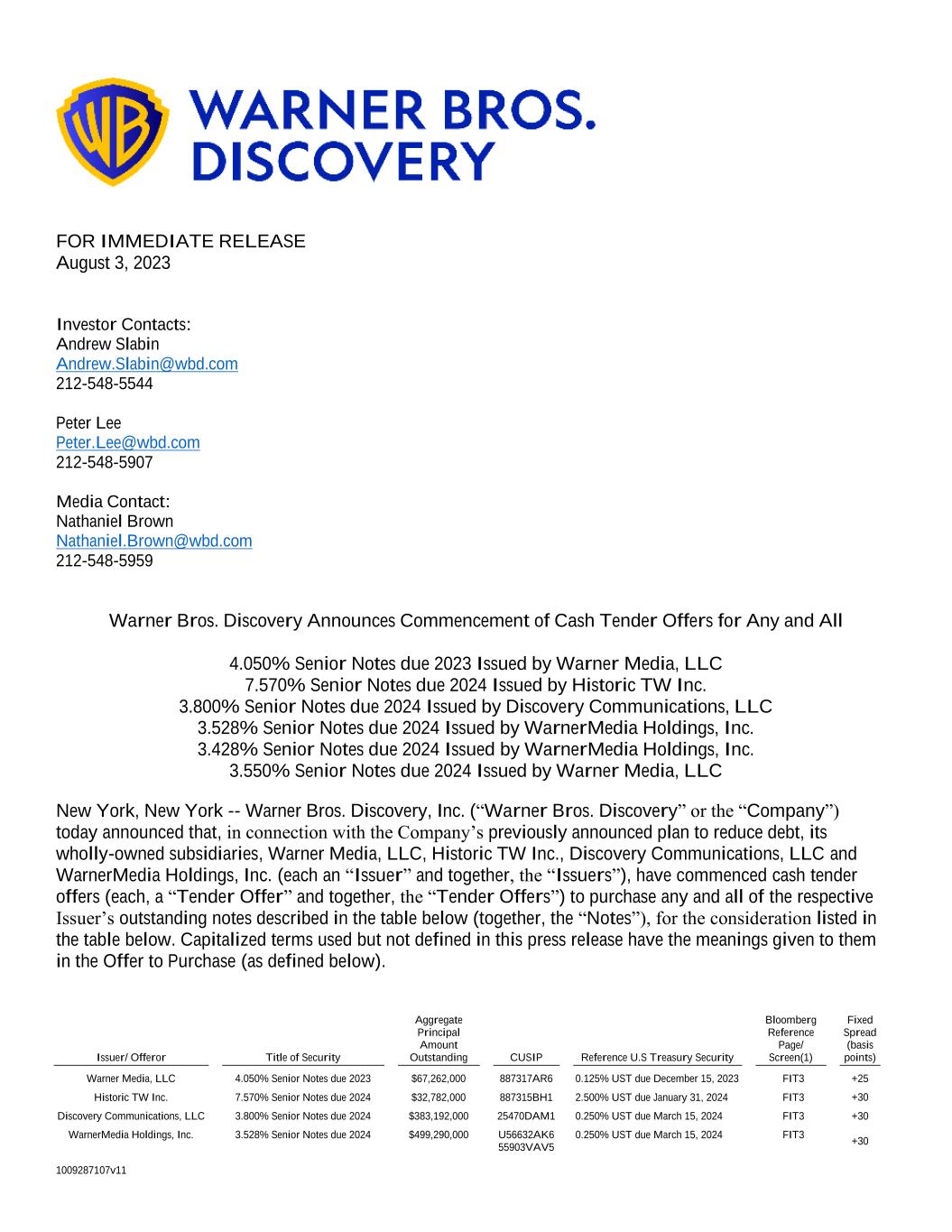 1009287107v11 FOR IMMEDIATE RELEASE August 3, 2023 Investor Contacts: Andrew Slabin Andrew.Slabin@wbd.com 212-548-5544 Peter Lee Peter.Lee@wbd.com 212-548-5907 Media Contact: Nathaniel Brown Nathaniel.Brown@wbd.com 212-548-5959 Warner Bros. Discovery Announces Commencement of Cash Tender Offers for Any and All 4.050% Senior Notes due 2023 Issued by Warner Media, LLC 7.570% Senior Notes due 2024 Issued by Historic TW Inc. 3.800% Senior Notes due 2024 Issued by Discovery Communications, LLC 3.528% Senior Notes due 2024 Issued by WarnerMedia Holdings, Inc. 3.428% Senior Notes due 2024 Issued by WarnerMedia Holdings, Inc. 3.550% Senior Notes due 2024 Issued by Warner Media, LLC New York, New York -- Warner Bros. Discovery, Inc. (“Warner Bros. Discovery” or the “Company”) today announced that, in connection with the Company’s previously announced plan to reduce debt, its wholly-owned subsidiaries, Warner Media, LLC, Historic TW Inc., Discovery Communications, LLC and WarnerMedia Holdings, Inc. (each an “Issuer” and together, the “Issuers”), have commenced cash tender offers (each, a “Tender Offer” and together, the “Tender Offers”) to purchase any and all of the respective Issuer’s outstanding notes described in the table below (together, the “Notes”), for the consideration listed in the table below. Capitalized terms used but not defined in this press release have the meanings given to them in the Offer to Purchase (as defined below). Issuer/ Offeror Title of Security Aggregate Principal Amount Outstanding CUSIP Reference U.S Treasury Security Bloomberg Reference Page/ Screen(1) Fixed Spread (basis points) Warner Media, LLC 4.050% Senior Notes due 2023 $67,262,000 887317AR6 0.125% UST due December 15, 2023 FIT3 +25 Historic TW Inc. 7.570% Senior Notes due 2024 $32,782,000 887315BH1 2.500% UST due January 31, 2024 FIT3 +30 Discovery Communications, LLC 3.800% Senior Notes due 2024 $383,192,000 25470DAM1 0.250% UST due March 15, 2024 FIT3 +30 WarnerMedia Holdings, Inc. 3.528% Senior Notes due 2024 $499,290,000 U56632AK6 55903VAV5 0.250% UST due March 15, 2024 FIT3 +30