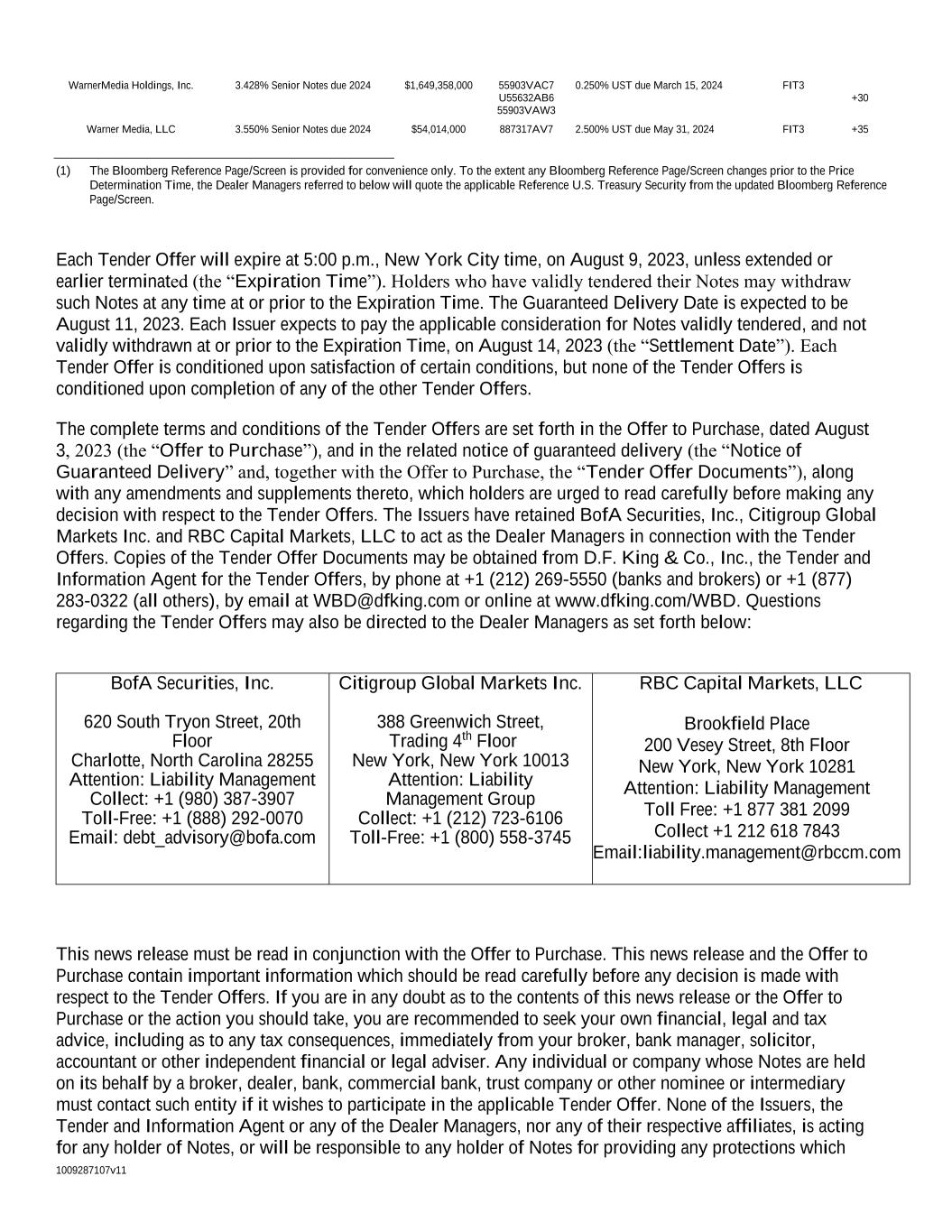 1009287107v11 WarnerMedia Holdings, Inc. 3.428% Senior Notes due 2024 $1,649,358,000 55903VAC7 U55632AB6 55903VAW3 0.250% UST due March 15, 2024 FIT3 +30 Warner Media, LLC 3.550% Senior Notes due 2024 $54,014,000 887317AV7 2.500% UST due May 31, 2024 FIT3 +35 (1) The Bloomberg Reference Page/Screen is provided for convenience only. To the extent any Bloomberg Reference Page/Screen changes prior to the Price Determination Time, the Dealer Managers referred to below will quote the applicable Reference U.S. Treasury Security from the updated Bloomberg Reference Page/Screen. Each Tender Offer will expire at 5:00 p.m., New York City time, on August 9, 2023, unless extended or earlier terminated (the “Expiration Time”). Holders who have validly tendered their Notes may withdraw such Notes at any time at or prior to the Expiration Time. The Guaranteed Delivery Date is expected to be August 11, 2023. Each Issuer expects to pay the applicable consideration for Notes validly tendered, and not validly withdrawn at or prior to the Expiration Time, on August 14, 2023 (the “Settlement Date”). Each Tender Offer is conditioned upon satisfaction of certain conditions, but none of the Tender Offers is conditioned upon completion of any of the other Tender Offers. The complete terms and conditions of the Tender Offers are set forth in the Offer to Purchase, dated August 3, 2023 (the “Offer to Purchase”), and in the related notice of guaranteed delivery (the “Notice of Guaranteed Delivery” and, together with the Offer to Purchase, the “Tender Offer Documents”), along with any amendments and supplements thereto, which holders are urged to read carefully before making any decision with respect to the Tender Offers. The Issuers have retained BofA Securities, Inc., Citigroup Global Markets Inc. and RBC Capital Markets, LLC to act as the Dealer Managers in connection with the Tender Offers. Copies of the Tender Offer Documents may be obtained from D.F. King & Co., Inc., the Tender and Information Agent for the Tender Offers, by phone at +1 (212) 269-5550 (banks and brokers) or +1 (877) 283-0322 (all others), by email at WBD@dfking.com or online at www.dfking.com/WBD. Questions regarding the Tender Offers may also be directed to the Dealer Managers as set forth below: BofA Securities, Inc. 620 South Tryon Street, 20th Floor Charlotte, North Carolina 28255 Attention: Liability Management Collect: +1 (980) 387-3907 Toll-Free: +1 (888) 292-0070 Email: debt_advisory@bofa.com Citigroup Global Markets Inc. 388 Greenwich Street, Trading 4th Floor New York, New York 10013 Attention: Liability Management Group Collect: +1 (212) 723-6106 Toll-Free: +1 (800) 558-3745 RBC Capital Markets, LLC Brookfield Place 200 Vesey Street, 8th Floor New York, New York 10281 Attention: Liability Management Toll Free: +1 877 381 2099 Collect +1 212 618 7843 Email:liability.management@rbccm.com This news release must be read in conjunction with the Offer to Purchase. This news release and the Offer to Purchase contain important information which should be read carefully before any decision is made with respect to the Tender Offers. If you are in any doubt as to the contents of this news release or the Offer to Purchase or the action you should take, you are recommended to seek your own financial, legal and tax advice, including as to any tax consequences, immediately from your broker, bank manager, solicitor, accountant or other independent financial or legal adviser. Any individual or company whose Notes are held on its behalf by a broker, dealer, bank, commercial bank, trust company or other nominee or intermediary must contact such entity if it wishes to participate in the applicable Tender Offer. None of the Issuers, the Tender and Information Agent or any of the Dealer Managers, nor any of their respective affiliates, is acting for any holder of Notes, or will be responsible to any holder of Notes for providing any protections which