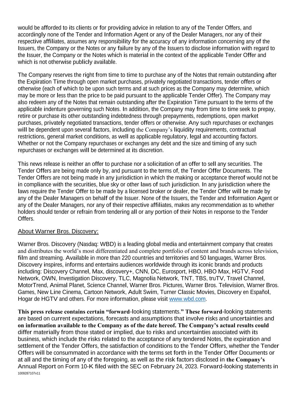 1009287107v11 would be afforded to its clients or for providing advice in relation to any of the Tender Offers, and accordingly none of the Tender and Information Agent or any of the Dealer Managers, nor any of their respective affiliates, assumes any responsibility for the accuracy of any information concerning any of the Issuers, the Company or the Notes or any failure by any of the Issuers to disclose information with regard to the Issuer, the Company or the Notes which is material in the context of the applicable Tender Offer and which is not otherwise publicly available. The Company reserves the right from time to time to purchase any of the Notes that remain outstanding after the Expiration Time through open market purchases, privately negotiated transactions, tender offers or otherwise (each of which to be upon such terms and at such prices as the Company may determine, which may be more or less than the price to be paid pursuant to the applicable Tender Offer). The Company may also redeem any of the Notes that remain outstanding after the Expiration Time pursuant to the terms of the applicable indenture governing such Notes. In addition, the Company may from time to time seek to prepay, retire or purchase its other outstanding indebtedness through prepayments, redemptions, open market purchases, privately negotiated transactions, tender offers or otherwise. Any such repurchases or exchanges will be dependent upon several factors, including the Company’s liquidity requirements, contractual restrictions, general market conditions, as well as applicable regulatory, legal and accounting factors. Whether or not the Company repurchases or exchanges any debt and the size and timing of any such repurchases or exchanges will be determined at its discretion. This news release is neither an offer to purchase nor a solicitation of an offer to sell any securities. The Tender Offers are being made only by, and pursuant to the terms of, the Tender Offer Documents. The Tender Offers are not being made in any jurisdiction in which the making or acceptance thereof would not be in compliance with the securities, blue sky or other laws of such jurisdiction. In any jurisdiction where the laws require the Tender Offer to be made by a licensed broker or dealer, the Tender Offer will be made by any of the Dealer Managers on behalf of the Issuer. None of the Issuers, the Tender and Information Agent or any of the Dealer Managers, nor any of their respective affiliates, makes any recommendation as to whether holders should tender or refrain from tendering all or any portion of their Notes in response to the Tender Offers. About Warner Bros. Discovery: Warner Bros. Discovery (Nasdaq: WBD) is a leading global media and entertainment company that creates and distributes the world’s most differentiated and complete portfolio of content and brands across television, film and streaming. Available in more than 220 countries and territories and 50 languages, Warner Bros. Discovery inspires, informs and entertains audiences worldwide through its iconic brands and products including: Discovery Channel, Max, discovery+, CNN, DC, Eurosport, HBO, HBO Max, HGTV, Food Network, OWN, Investigation Discovery, TLC, Magnolia Network, TNT, TBS, truTV, Travel Channel, MotorTrend, Animal Planet, Science Channel, Warner Bros. Pictures, Warner Bros. Television, Warner Bros. Games, New Line Cinema, Cartoon Network, Adult Swim, Turner Classic Movies, Discovery en Español, Hogar de HGTV and others. For more information, please visit www.wbd.com. This press release contains certain “forward-looking statements.” These forward-looking statements are based on current expectations, forecasts and assumptions that involve risks and uncertainties and on information available to the Company as of the date hereof. The Company’s actual results could differ materially from those stated or implied, due to risks and uncertainties associated with its business, which include the risks related to the acceptance of any tendered Notes, the expiration and settlement of the Tender Offers, the satisfaction of conditions to the Tender Offers, whether the Tender Offers will be consummated in accordance with the terms set forth in the Tender Offer Documents or at all and the timing of any of the foregoing, as well as the risk factors disclosed in the Company’s Annual Report on Form 10-K filed with the SEC on February 24, 2023. Forward-looking statements in