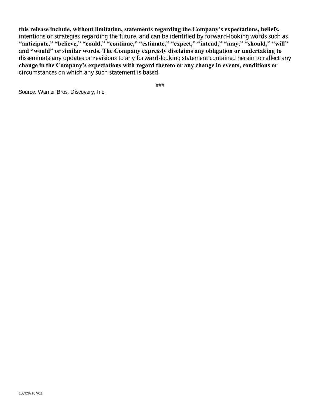 1009287107v11 this release include, without limitation, statements regarding the Company’s expectations, beliefs, intentions or strategies regarding the future, and can be identified by forward-looking words such as “anticipate,” “believe,” “could,” “continue,” “estimate,” “expect,” “intend,” “may,” “should,” “will” and “would” or similar words. The Company expressly disclaims any obligation or undertaking to disseminate any updates or revisions to any forward-looking statement contained herein to reflect any change in the Company’s expectations with regard thereto or any change in events, conditions or circumstances on which any such statement is based. ### Source: Warner Bros. Discovery, Inc.
