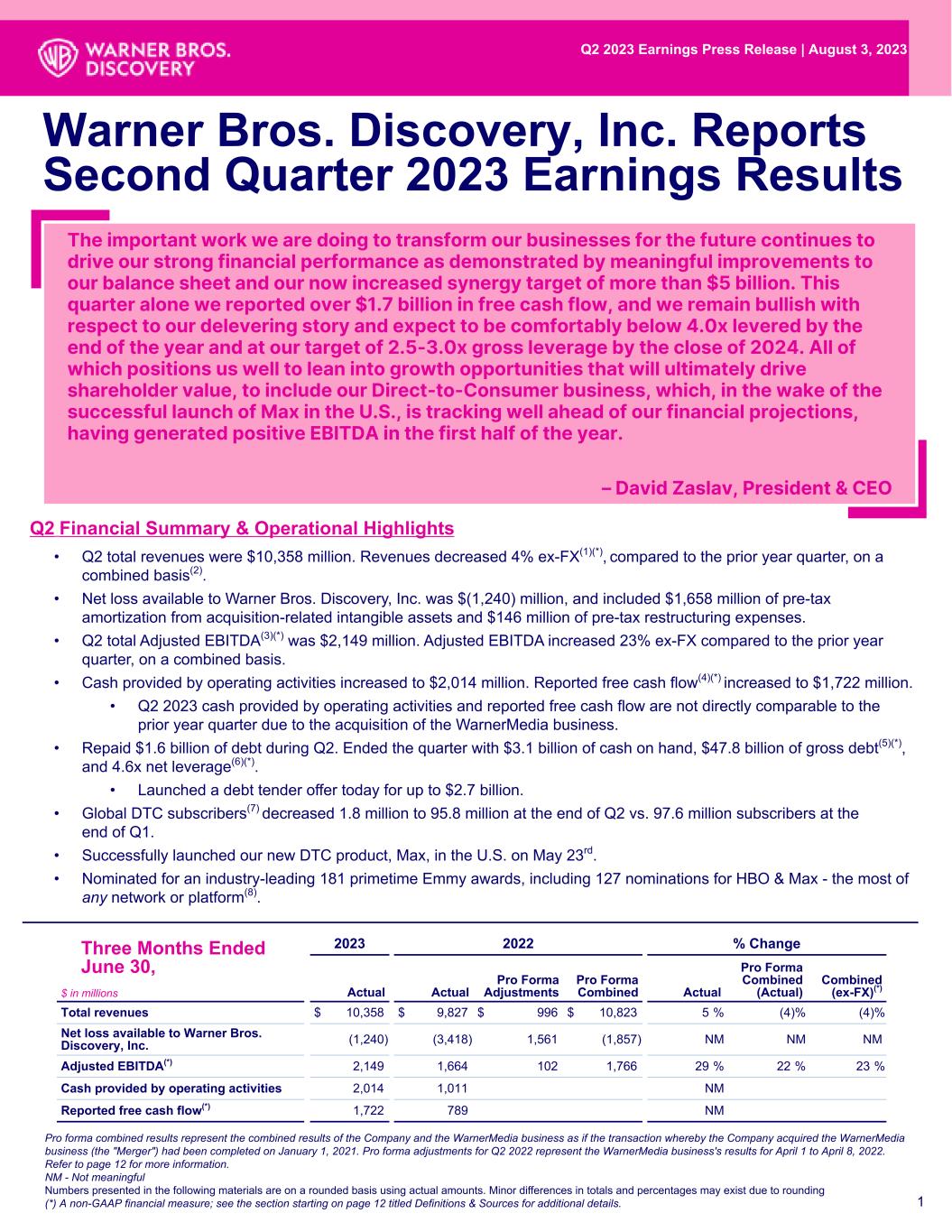 Q2 2023 Earnings Press Release | August 3, 2023 Q2 Financial Summary & Operational Highlights Warner Bros. Discovery, Inc. Reports Second Quarter 2023 Earnings Results 1 2023 2022 % Change $ in millions Actual Actual Pro Forma Adjustments Pro Forma Combined Actual Pro Forma Combined (Actual) Combined (ex-FX)(*) Total revenues $ 10,358 $ 9,827 $ 996 $ 10,823 5 % (4) % (4) % Net loss available to Warner Bros. Discovery, Inc. (1,240) (3,418) 1,561 (1,857) NM NM NM Adjusted EBITDA(*) 2,149 1,664 102 1,766 29 % 22 % 23 % Cash provided by operating activities 2,014 1,011 NM Reported free cash flow(*) 1,722 789 NM Three Months Ended June 30, Pro forma combined results represent the combined results of the Company and the WarnerMedia business as if the transaction whereby the Company acquired the WarnerMedia business (the "Merger") had been completed on January 1, 2021. Pro forma adjustments for Q2 2022 represent the WarnerMedia business's results for April 1 to April 8, 2022. Refer to page 12 for more information. NM - Not meaningful Numbers presented in the following materials are on a rounded basis using actual amounts. Minor differences in totals and percentages may exist due to rounding (*) A non-GAAP financial measure; see the section starting on page 12 titled Definitions & Sources for additional details. • Q2 total revenues were $10,358 million. Revenues decreased 4% ex-FX(1)(*), compared to the prior year quarter, on a combined basis(2). • Net loss available to Warner Bros. Discovery, Inc. was $(1,240) million, and included $1,658 million of pre-tax amortization from acquisition-related intangible assets and $146 million of pre-tax restructuring expenses. • Q2 total Adjusted EBITDA(3)(*) was $2,149 million. Adjusted EBITDA increased 23% ex-FX compared to the prior year quarter, on a combined basis. • Cash provided by operating activities increased to $2,014 million. Reported free cash flow(4)(*) increased to $1,722 million. • Q2 2023 cash provided by operating activities and reported free cash flow are not directly comparable to the prior year quarter due to the acquisition of the WarnerMedia business. • Repaid $1.6 billion of debt during Q2. Ended the quarter with $3.1 billion of cash on hand, $47.8 billion of gross debt(5)(*), and 4.6x net leverage(6)(*). • Launched a debt tender offer today for up to $2.7 billion. • Global DTC subscribers(7) decreased 1.8 million to 95.8 million at the end of Q2 vs. 97.6 million subscribers at the end of Q1. • Successfully launched our new DTC product, Max, in the U.S. on May 23rd. • Nominated for an industry-leading 181 primetime Emmy awards, including 127 nominations for HBO & Max - the most of any network or platform(8). The important work we are doing to transform our businesses for the future continues to drive our strong financial performance as demonstrated by meaningful improvements to our balance sheet and our now increased synergy target of more than $5 billion. This quarter alone we reported over $1.7 billion in free cash flow, and we remain bullish with respect to our delevering story and expect to be comfortably below 4.0x levered by the end of the year and at our target of 2.5-3.0x gross leverage by the close of 2024. All of which positions us well to lean into growth opportunities that will ultimately drive shareholder value, to include our Direct-to-Consumer business, which, in the wake of the successful launch of Max in the U.S., is tracking well ahead of our financial projections, having generated positive EBITDA in the first half of the year. – David Zaslav, President & CEO