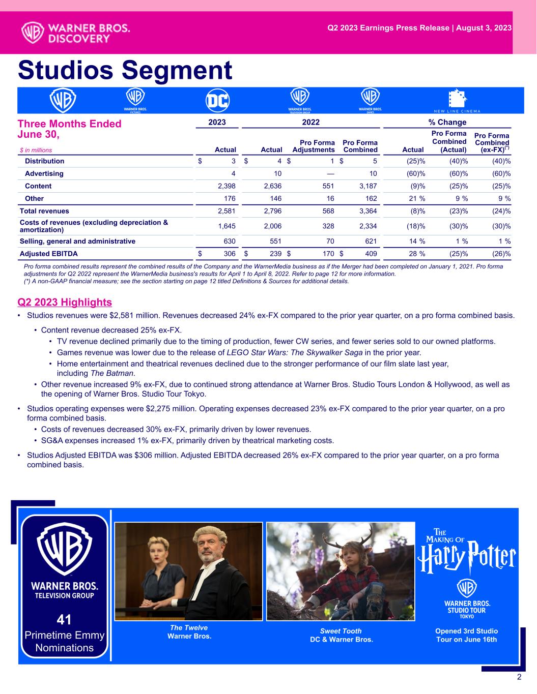 • Studios revenues were $2,581 million. Revenues decreased 24% ex-FX compared to the prior year quarter, on a pro forma combined basis. • Content revenue decreased 25% ex-FX. • TV revenue declined primarily due to the timing of production, fewer CW series, and fewer series sold to our owned platforms. • Games revenue was lower due to the release of LEGO Star Wars: The Skywalker Saga in the prior year. • Home entertainment and theatrical revenues declined due to the stronger performance of our film slate last year, including The Batman. • Other revenue increased 9% ex-FX, due to continued strong attendance at Warner Bros. Studio Tours London & Hollywood, as well as the opening of Warner Bros. Studio Tour Tokyo. • Studios operating expenses were $2,275 million. Operating expenses decreased 23% ex-FX compared to the prior year quarter, on a pro forma combined basis. • Costs of revenues decreased 30% ex-FX, primarily driven by lower revenues. • SG&A expenses increased 1% ex-FX, primarily driven by theatrical marketing costs. • Studios Adjusted EBITDA was $306 million. Adjusted EBITDA decreased 26% ex-FX compared to the prior year quarter, on a pro forma combined basis. 2 2023 2022 % Change $ in millions Actual Actual Pro Forma Adjustments Pro Forma Combined Actual Pro Forma Combined (Actual) Pro Forma Combined (ex-FX)(*) Distribution $ 3 $ 4 $ 1 $ 5 (25) % (40) % (40) % Advertising 4 10 — 10 (60) % (60) % (60) % Content 2,398 2,636 551 3,187 (9) % (25) % (25) % Other 176 146 16 162 21 % 9 % 9 % Total revenues 2,581 2,796 568 3,364 (8) % (23) % (24) % Costs of revenues (excluding depreciation & amortization) 1,645 2,006 328 2,334 (18) % (30) % (30) % Selling, general and administrative 630 551 70 621 14 % 1 % 1 % Adjusted EBITDA $ 306 $ 239 $ 170 $ 409 28 % (25) % (26) % Studios Segment Pro forma combined results represent the combined results of the Company and the WarnerMedia business as if the Merger had been completed on January 1, 2021. Pro forma adjustments for Q2 2022 represent the WarnerMedia business's results for April 1 to April 8, 2022. Refer to page 12 for more information. (*) A non-GAAP financial measure; see the section starting on page 12 titled Definitions & Sources for additional details. Q2 2023 Highlights Opened 3rd Studio Tour on June 16th Three Months Ended June 30, The Twelve Warner Bros. Q2 2023 Earnings Press Release | August 3, 2023 Sweet Tooth DC & Warner Bros. 41 Primetime Emmy Nominations