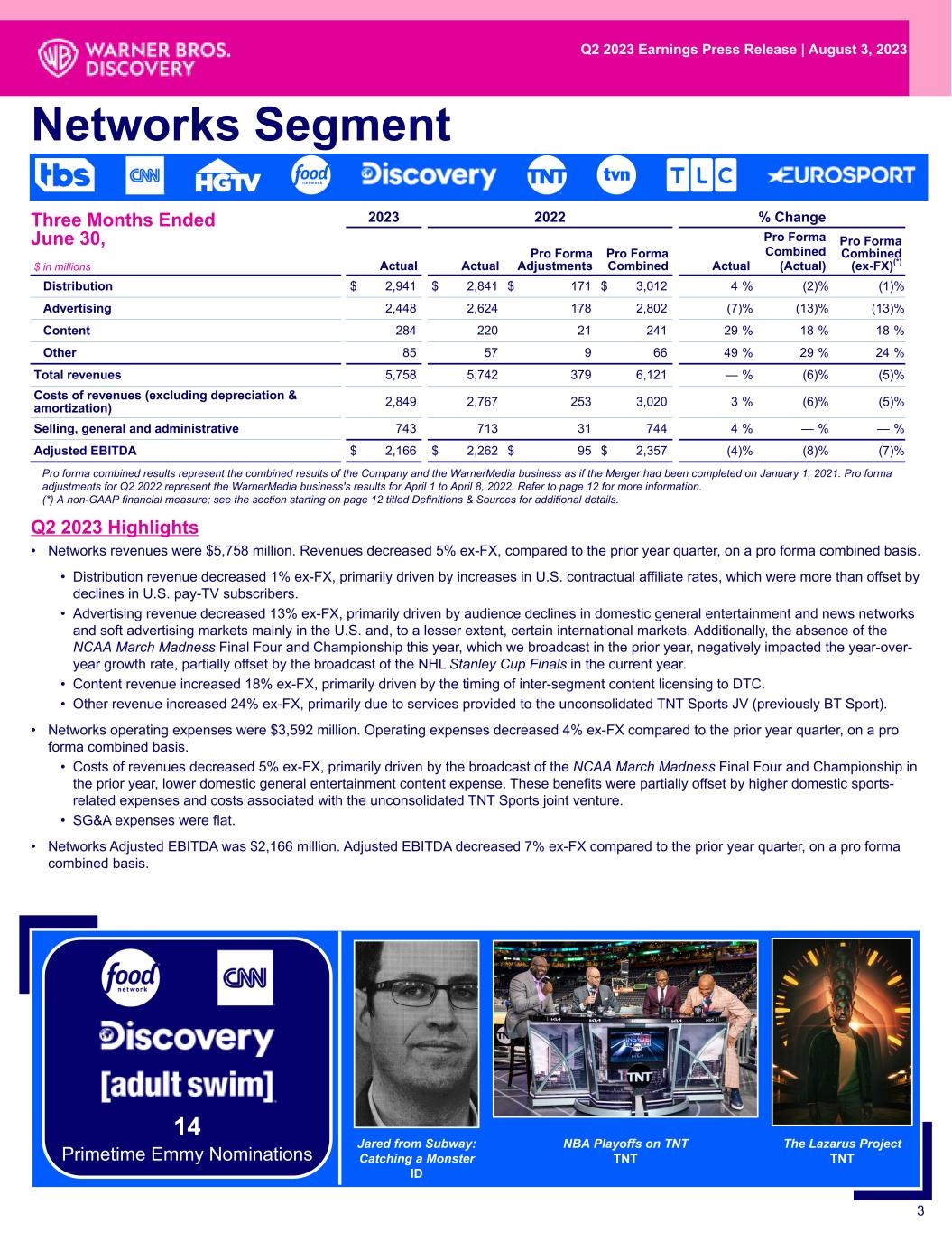 • Networks revenues were $5,758 million. Revenues decreased 5% ex-FX, compared to the prior year quarter, on a pro forma combined basis. • Distribution revenue decreased 1% ex-FX, primarily driven by increases in U.S. contractual affiliate rates, which were more than offset by declines in U.S. pay-TV subscribers. • Advertising revenue decreased 13% ex-FX, primarily driven by audience declines in domestic general entertainment and news networks and soft advertising markets mainly in the U.S. and, to a lesser extent, certain international markets. Additionally, the absence of the NCAA March Madness Final Four and Championship this year, which we broadcast in the prior year, negatively impacted the year-over- year growth rate, partially offset by the broadcast of the NHL Stanley Cup Finals in the current year. • Content revenue increased 18% ex-FX, primarily driven by the timing of inter-segment content licensing to DTC. • Other revenue increased 24% ex-FX, primarily due to services provided to the unconsolidated TNT Sports JV (previously BT Sport). • Networks operating expenses were $3,592 million. Operating expenses decreased 4% ex-FX compared to the prior year quarter, on a pro forma combined basis. • Costs of revenues decreased 5% ex-FX, primarily driven by the broadcast of the NCAA March Madness Final Four and Championship in the prior year, lower domestic general entertainment content expense. These benefits were partially offset by higher domestic sports- related expenses and costs associated with the unconsolidated TNT Sports joint venture. • SG&A expenses were flat. • Networks Adjusted EBITDA was $2,166 million. Adjusted EBITDA decreased 7% ex-FX compared to the prior year quarter, on a pro forma combined basis. Networks Segment 2023 2022 % Change $ in millions Actual Actual Pro Forma Adjustments Pro Forma Combined Actual Pro Forma Combined (Actual) Pro Forma Combined (ex-FX)(*) Distribution $ 2,941 $ 2,841 $ 171 $ 3,012 4 % (2) % (1) % Advertising 2,448 2,624 178 2,802 (7) % (13) % (13) % Content 284 220 21 241 29 % 18 % 18 % Other 85 57 9 66 49 % 29 % 24 % Total revenues 5,758 5,742 379 6,121 — % (6) % (5) % Costs of revenues (excluding depreciation & amortization) 2,849 2,767 253 3,020 3 % (6) % (5) % Selling, general and administrative 743 713 31 744 4 % — % — % Adjusted EBITDA $ 2,166 $ 2,262 $ 95 $ 2,357 (4) % (8) % (7) % 3 Three Months Ended June 30, The Lazarus Project TNT NBA Playoffs on TNT TNT Q2 2023 Highlights Pro forma combined results represent the combined results of the Company and the WarnerMedia business as if the Merger had been completed on January 1, 2021. Pro forma adjustments for Q2 2022 represent the WarnerMedia business's results for April 1 to April 8, 2022. Refer to page 12 for more information. (*) A non-GAAP financial measure; see the section starting on page 12 titled Definitions & Sources for additional details. Q2 2023 Earnings Press Release | August 3, 2023 14 Primetime Emmy Nominations Jared from Subway: Catching a Monster ID