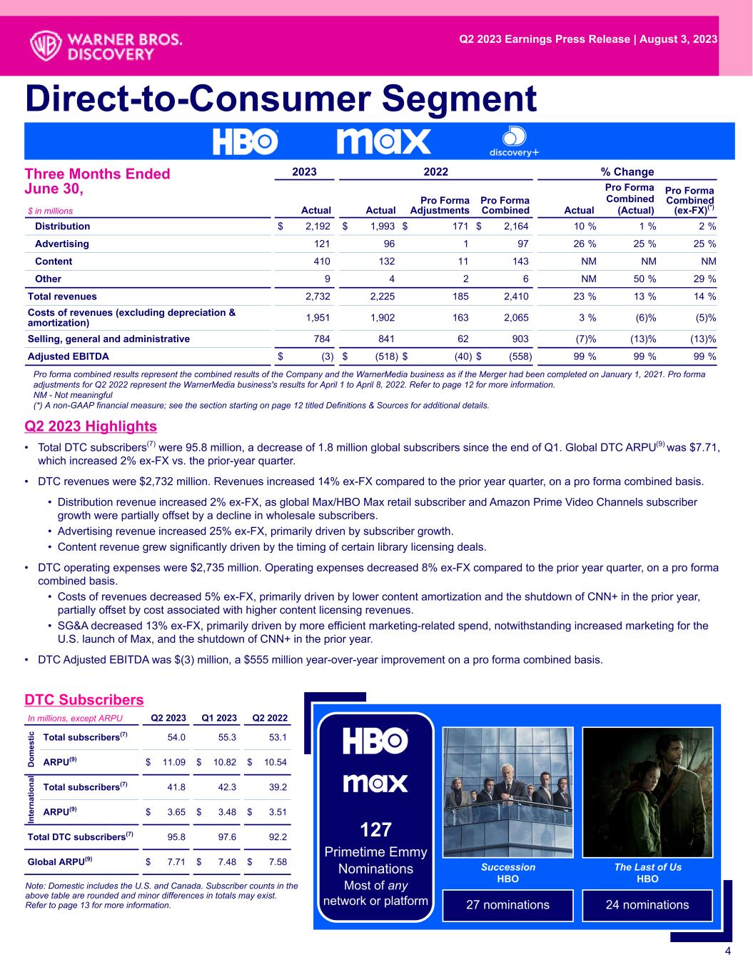 • Total DTC subscribers(7) were 95.8 million, a decrease of 1.8 million global subscribers since the end of Q1. Global DTC ARPU(9) was $7.71, which increased 2% ex-FX vs. the prior-year quarter. • DTC revenues were $2,732 million. Revenues increased 14% ex-FX compared to the prior year quarter, on a pro forma combined basis. • Distribution revenue increased 2% ex-FX, as global Max/HBO Max retail subscriber and Amazon Prime Video Channels subscriber growth were partially offset by a decline in wholesale subscribers. • Advertising revenue increased 25% ex-FX, primarily driven by subscriber growth. • Content revenue grew significantly driven by the timing of certain library licensing deals. • DTC operating expenses were $2,735 million. Operating expenses decreased 8% ex-FX compared to the prior year quarter, on a pro forma combined basis. • Costs of revenues decreased 5% ex-FX, primarily driven by lower content amortization and the shutdown of CNN+ in the prior year, partially offset by cost associated with higher content licensing revenues. • SG&A decreased 13% ex-FX, primarily driven by more efficient marketing-related spend, notwithstanding increased marketing for the U.S. launch of Max, and the shutdown of CNN+ in the prior year. • DTC Adjusted EBITDA was $(3) million, a $555 million year-over-year improvement on a pro forma combined basis. 4 2023 2022 % Change $ in millions Actual Actual Pro Forma Adjustments Pro Forma Combined Actual Pro Forma Combined (Actual) Pro Forma Combined (ex-FX)(*) Distribution $ 2,192 $ 1,993 $ 171 $ 2,164 10 % 1 % 2 % Advertising 121 96 1 97 26 % 25 % 25 % Content 410 132 11 143 NM NM NM Other 9 4 2 6 NM 50 % 29 % Total revenues 2,732 2,225 185 2,410 23 % 13 % 14 % Costs of revenues (excluding depreciation & amortization) 1,951 1,902 163 2,065 3 % (6) % (5) % Selling, general and administrative 784 841 62 903 (7) % (13) % (13) % Adjusted EBITDA $ (3) $ (518) $ (40) $ (558) 99 % 99 % 99 % Three Months Ended June 30, In millions, except ARPU Q2 2023 Q1 2023 Q2 2022 Total subscribers(7) 54.0 55.3 53.1 ARPU(9) $ 11.09 $ 10.82 $ 10.54 Total subscribers(7) 41.8 42.3 39.2 ARPU(9) $ 3.65 $ 3.48 $ 3.51 Total DTC subscribers(7) 95.8 97.6 92.2 Global ARPU(9) $ 7.71 $ 7.48 $ 7.58 DTC Subscribers Direct-to-Consumer Segment In te rn at io na l D om es tic Note: Domestic includes the U.S. and Canada. Subscriber counts in the above table are rounded and minor differences in totals may exist. Refer to page 13 for more information. Q2 2023 Highlights Pro forma combined results represent the combined results of the Company and the WarnerMedia business as if the Merger had been completed on January 1, 2021. Pro forma adjustments for Q2 2022 represent the WarnerMedia business's results for April 1 to April 8, 2022. Refer to page 12 for more information. NM - Not meaningful (*) A non-GAAP financial measure; see the section starting on page 12 titled Definitions & Sources for additional details. Q2 2023 Earnings Press Release | August 3, 2023 127 Primetime Emmy Nominations Most of any network or platform The Last of Us HBO Succession HBO 27 nominations 24 nominations
