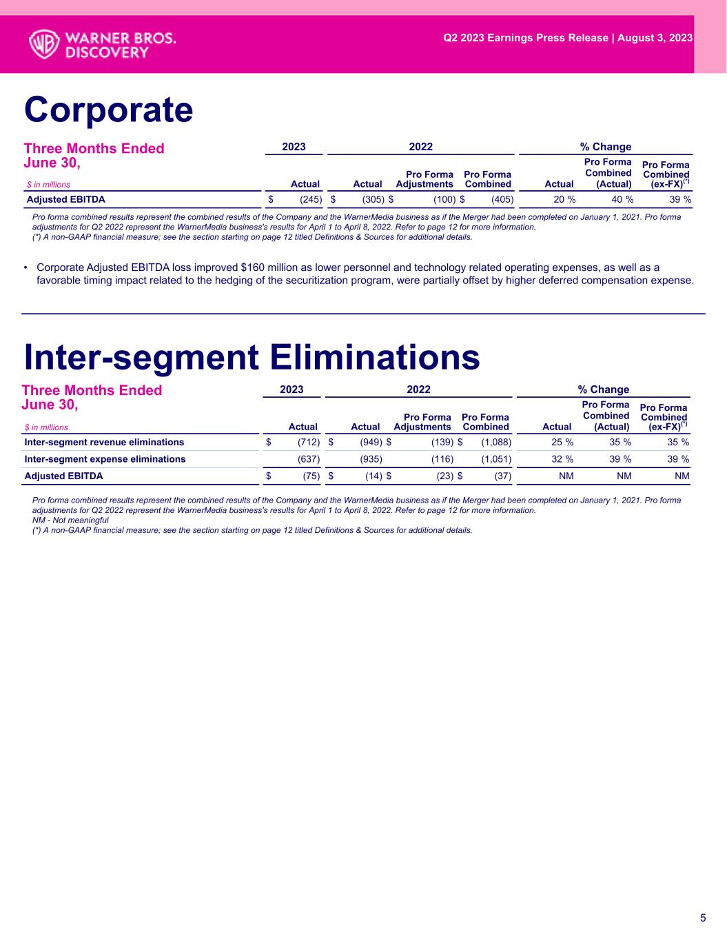 Pro forma combined results represent the combined results of the Company and the WarnerMedia business as if the Merger had been completed on January 1, 2021. Pro forma adjustments for Q2 2022 represent the WarnerMedia business's results for April 1 to April 8, 2022. Refer to page 12 for more information. NM - Not meaningful (*) A non-GAAP financial measure; see the section starting on page 12 titled Definitions & Sources for additional details. 2023 2022 % Change $ in millions Actual Actual Pro Forma Adjustments Pro Forma Combined Actual Pro Forma Combined (Actual) Pro Forma Combined (ex-FX)(*) Adjusted EBITDA $ (245) $ (305) $ (100) $ (405) 20 % 40 % 39 % Three Months Ended June 30, Corporate 5 Inter-segment Eliminations 2023 2022 % Change $ in millions Actual Actual Pro Forma Adjustments Pro Forma Combined Actual Pro Forma Combined (Actual) Pro Forma Combined (ex-FX)(*) Inter-segment revenue eliminations $ (712) $ (949) $ (139) $ (1,088) 25 % 35 % 35 % Inter-segment expense eliminations (637) (935) (116) (1,051) 32 % 39 % 39 % Adjusted EBITDA $ (75) $ (14) $ (23) $ (37) NM NM NM Three Months Ended June 30, Pro forma combined results represent the combined results of the Company and the WarnerMedia business as if the Merger had been completed on January 1, 2021. Pro forma adjustments for Q2 2022 represent the WarnerMedia business's results for April 1 to April 8, 2022. Refer to page 12 for more information. (*) A non-GAAP financial measure; see the section starting on page 12 titled Definitions & Sources for additional details. • Corporate Adjusted EBITDA loss improved $160 million as lower personnel and technology related operating expenses, as well as a favorable timing impact related to the hedging of the securitization program, were partially offset by higher deferred compensation expense. Q2 2023 Earnings Press Release | August 3, 2023