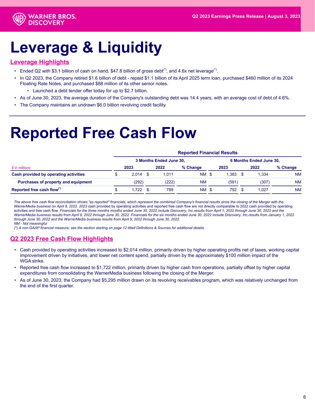 • Cash provided by operating activities increased to $2,014 million, primarily driven by higher operating profits net of taxes, working capital improvement driven by initiatives, and lower net content spend, partially driven by the approximately $100 million impact of the WGA strike. • Reported free cash flow increased to $1,722 million, primarily driven by higher cash from operations, partially offset by higher capital expenditures from consolidating the WarnerMedia business following the closing of the Merger. • As of June 30, 2023, the Company had $5,295 million drawn on its revolving receivables program, which was relatively unchanged from the end of the first quarter. Leverage & Liquidity 6 Reported Free Cash Flow Q2 2023 Free Cash Flow Highlights Leverage Highlights Reported Financial Results 3 Months Ended June 30, 6 Months Ended June 30, $ in millions 2023 2022 % Change 2023 2022 % Change Cash provided by operating activities $ 2,014 $ 1,011 NM $ 1,383 $ 1,334 NM Purchases of property and equipment (292) (222) NM (591) (307) NM Reported free cash flow(*) $ 1,722 $ 789 NM $ 792 $ 1,027 NM The above free cash flow reconciliation shows "as reported" financials, which represent the combined Company's financial results since the closing of the Merger with the WarnerMedia business on April 8, 2022. 2023 cash provided by operating activities and reported free cash flow are not directly comparable to 2022 cash provided by operating activities and free cash flow. Financials for the three months months ended June 30, 2022 include Discovery, Inc.results from April 1, 2022 through June 30, 2022 and the WarnerMedia business results from April 9, 2022 through June 30, 2022. Financials for the six months ended June 30, 2022 include Discovery, Inc.results from January 1, 2022 through June 30, 2022 and the WarnerMedia business results from April 9, 2022 through June 30, 2022. NM - Not meaningful (*) A non-GAAP financial measure; see the section starting on page 12 titled Definitions & Sources for additional details. Q2 2023 Earnings Press Release | August 3, 2023 • Ended Q2 with $3.1 billion of cash on hand, $47.8 billion of gross debt(*), and 4.6x net leverage(*). • In Q2 2023, the Company retired $1.6 billion of debt - repaid $1.1 billion of its April 2025 term loan, purchased $460 million of its 2024 Floating Rate Notes, and purchased $88 million of its other senior notes. • Launched a debt tender offer today for up to $2.7 billion. • As of June 30, 2023, the average duration of the Company's outstanding debt was 14.4 years, with an average cost of debt of 4.6%. • The Company maintains an undrawn $6.0 billion revolving credit facility.