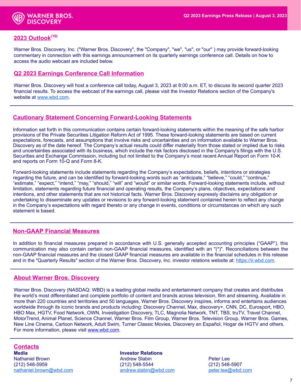 Cautionary Statement Concerning Forward-Looking Statements Information set forth in this communication contains certain forward-looking statements within the meaning of the safe harbor provisions of the Private Securities Litigation Reform Act of 1995. These forward-looking statements are based on current expectations, forecasts, and assumptions that involve risks and uncertainties and on information available to Warner Bros. Discovery as of the date hereof. The Company’s actual results could differ materially from those stated or implied due to risks and uncertainties associated with its business, which include the risk factors disclosed in the Company's filings with the U.S. Securities and Exchange Commission, including but not limited to the Company’s most recent Annual Report on Form 10-K and reports on Form 10-Q and Form 8-K. Forward-looking statements include statements regarding the Company’s expectations, beliefs, intentions or strategies regarding the future, and can be identified by forward-looking words such as “anticipate,” “believe,” “could,” “continue,” “estimate,” “expect,” “intend,” “may,” “should,” “will” and “would” or similar words. Forward-looking statements include, without limitation, statements regarding future financial and operating results, the Company’s plans, objectives, expectations and intentions, and other statements that are not historical facts. Warner Bros. Discovery expressly disclaims any obligation or undertaking to disseminate any updates or revisions to any forward-looking statement contained herein to reflect any change in the Company’s expectations with regard thereto or any change in events, conditions or circumstances on which any such statement is based. 7 2023 Outlook(10) Warner Bros. Discovery, Inc. ("Warner Bros. Discovery", the "Company", "we", "us", or "our" ) may provide forward-looking commentary in connection with this earnings announcement on its quarterly earnings conference call. Details on how to access the audio webcast are included below. Q2 2023 Earnings Conference Call Information Warner Bros. Discovery will host a conference call today, August 3, 2023 at 8:00 a.m. ET, to discuss its second quarter 2023 financial results. To access the webcast of the earnings call, please visit the Investor Relations section of the Company's website at www.wbd.com. About Warner Bros. Discovery Warner Bros. Discovery (NASDAQ: WBD) is a leading global media and entertainment company that creates and distributes the world’s most differentiated and complete portfolio of content and brands across television, film and streaming. Available in more than 220 countries and territories and 50 languages, Warner Bros. Discovery inspires, informs and entertains audiences worldwide through its iconic brands and products including: Discovery Channel, Max, discovery+, CNN, DC, Eurosport, HBO, HBO Max, HGTV, Food Network, OWN, Investigation Discovery, TLC, Magnolia Network, TNT, TBS, truTV, Travel Channel, MotorTrend, Animal Planet, Science Channel, Warner Bros. Film Group, Warner Bros. Television Group, Warner Bros. Games, New Line Cinema, Cartoon Network, Adult Swim, Turner Classic Movies, Discovery en Español, Hogar de HGTV and others. For more information, please visit www.wbd.com. Contacts Media Investor Relations Nathaniel Brown Andrew Slabin Peter Lee (212) 548-5959 (212) 548-5544 (212) 548-5907 nathaniel.brown@wbd.com andrew.slabin@wbd.com peter.lee@wbd.com Non-GAAP Financial Measures In addition to financial measures prepared in accordance with U.S. generally accepted accounting principles (“GAAP”), this communication may also contain certain non-GAAP financial measures, identified with an "(*)". Reconciliations between the non-GAAP financial measures and the closest GAAP financial measures are available in the financial schedules in this release and in the "Quarterly Results" section of the Warner Bros. Discovery, Inc. investor relations website at: https://ir.wbd.com. Q2 2023 Earnings Press Release | August 3, 2023