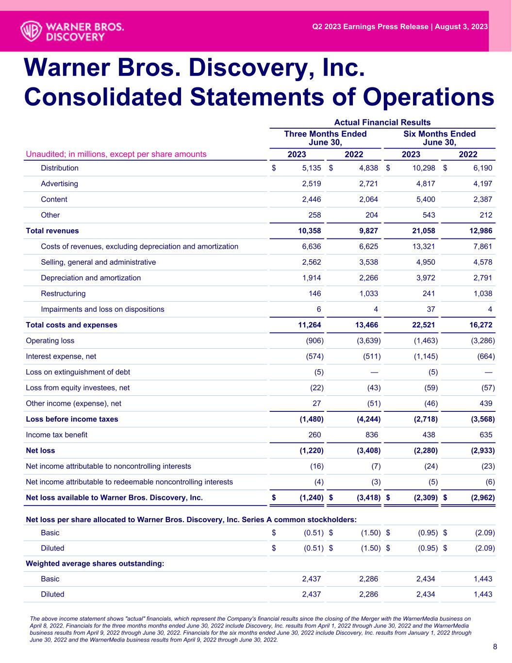 Actual Financial Results Three Months Ended June 30, Six Months Ended June 30, Unaudited; in millions, except per share amounts 2023 2022 2023 2022 Distribution $ 5,135 $ 4,838 $ 10,298 $ 6,190 Advertising 2,519 2,721 4,817 4,197 Content 2,446 2,064 5,400 2,387 Other 258 204 543 212 Total revenues 10,358 9,827 21,058 12,986 Costs of revenues, excluding depreciation and amortization 6,636 6,625 13,321 7,861 Selling, general and administrative 2,562 3,538 4,950 4,578 Depreciation and amortization 1,914 2,266 3,972 2,791 Restructuring 146 1,033 241 1,038 Impairments and loss on dispositions 6 4 37 4 Total costs and expenses 11,264 13,466 22,521 16,272 Operating loss (906) (3,639) (1,463) (3,286) Interest expense, net (574) (511) (1,145) (664) Loss on extinguishment of debt (5) — (5) — Loss from equity investees, net (22) (43) (59) (57) Other income (expense), net 27 (51) (46) 439 Loss before income taxes (1,480) (4,244) (2,718) (3,568) Income tax benefit 260 836 438 635 Net loss (1,220) (3,408) (2,280) (2,933) Net income attributable to noncontrolling interests (16) (7) (24) (23) Net income attributable to redeemable noncontrolling interests (4) (3) (5) (6) Net loss available to Warner Bros. Discovery, Inc. $ (1,240) $ (3,418) $ (2,309) $ (2,962) Net loss per share allocated to Warner Bros. Discovery, Inc. Series A common stockholders: Basic $ (0.51) $ (1.50) $ (0.95) $ (2.09) Diluted $ (0.51) $ (1.50) $ (0.95) $ (2.09) Weighted average shares outstanding: Basic 2,437 2,286 2,434 1,443 Diluted 2,437 2,286 2,434 1,443 8 Warner Bros. Discovery, Inc. Consolidated Statements of Operations The above income statement shows "actual" financials, which represent the Company's financial results since the closing of the Merger with the WarnerMedia business on April 8, 2022. Financials for the three months months ended June 30, 2022 include Discovery, Inc. results from April 1, 2022 through June 30, 2022 and the WarnerMedia business results from April 9, 2022 through June 30, 2022. Financials for the six months ended June 30, 2022 include Discovery, Inc. results from January 1, 2022 through June 30, 2022 and the WarnerMedia business results from April 9, 2022 through June 30, 2022. Q2 2023 Earnings Press Release | August 3, 2023