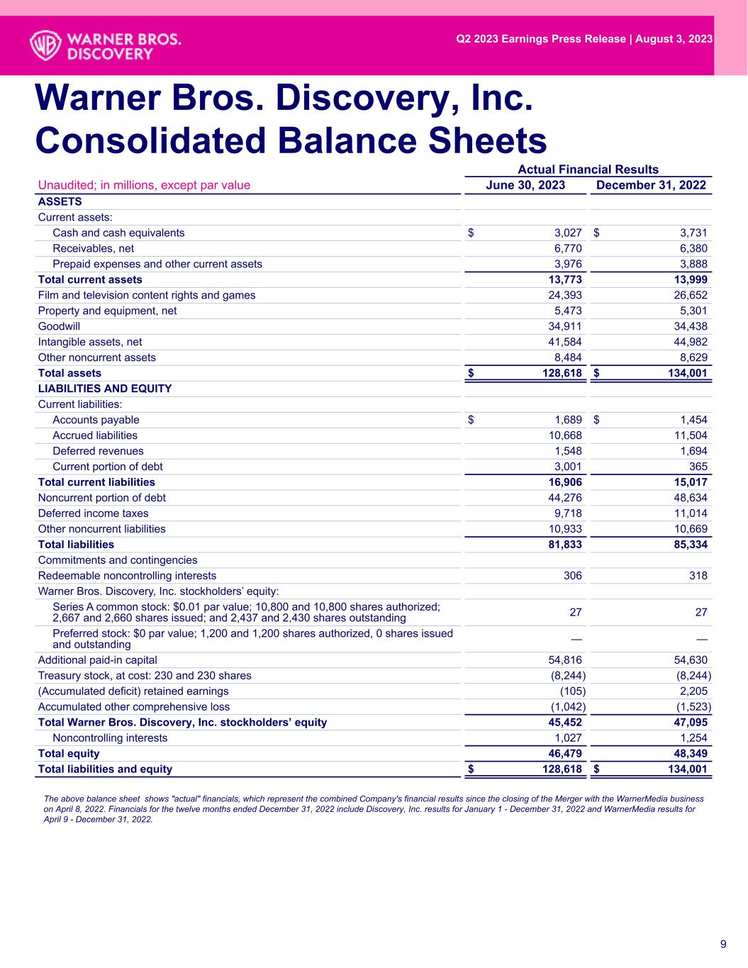 The above balance sheet shows "actual" financials, which represent the combined Company's financial results since the closing of the Merger with the WarnerMedia business on April 8, 2022. Financials for the twelve months ended December 31, 2022 include Discovery, Inc. results for January 1 - December 31, 2022 and WarnerMedia results for April 9 - December 31, 2022. 9 Actual Financial Results Unaudited; in millions, except par value June 30, 2023 December 31, 2022 ASSETS Current assets: Cash and cash equivalents $ 3,027 $ 3,731 Receivables, net 6,770 6,380 Prepaid expenses and other current assets 3,976 3,888 Total current assets 13,773 13,999 Film and television content rights and games 24,393 26,652 Property and equipment, net 5,473 5,301 Goodwill 34,911 34,438 Intangible assets, net 41,584 44,982 Other noncurrent assets 8,484 8,629 Total assets $ 128,618 $ 134,001 LIABILITIES AND EQUITY Current liabilities: Accounts payable $ 1,689 $ 1,454 Accrued liabilities 10,668 11,504 Deferred revenues 1,548 1,694 Current portion of debt 3,001 365 Total current liabilities 16,906 15,017 Noncurrent portion of debt 44,276 48,634 Deferred income taxes 9,718 11,014 Other noncurrent liabilities 10,933 10,669 Total liabilities 81,833 85,334 Commitments and contingencies Redeemable noncontrolling interests 306 318 Warner Bros. Discovery, Inc. stockholders’ equity: Series A common stock: $0.01 par value; 10,800 and 10,800 shares authorized; 2,667 and 2,660 shares issued; and 2,437 and 2,430 shares outstanding 27 27 Preferred stock: $0 par value; 1,200 and 1,200 shares authorized, 0 shares issued and outstanding — — Additional paid-in capital 54,816 54,630 Treasury stock, at cost: 230 and 230 shares (8,244) (8,244) (Accumulated deficit) retained earnings (105) 2,205 Accumulated other comprehensive loss (1,042) (1,523) Total Warner Bros. Discovery, Inc. stockholders’ equity 45,452 47,095 Noncontrolling interests 1,027 1,254 Total equity 46,479 48,349 Total liabilities and equity $ 128,618 $ 134,001 9 Warner Bros. Discovery, Inc. Consolidated Balance Sheets Q2 2023 Earnings Press Release | August 3, 2023
