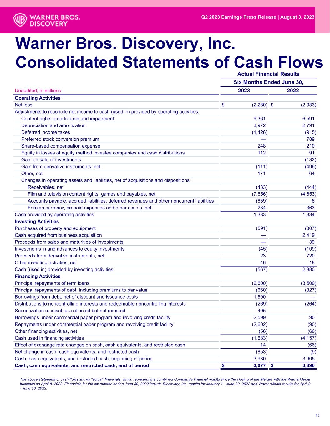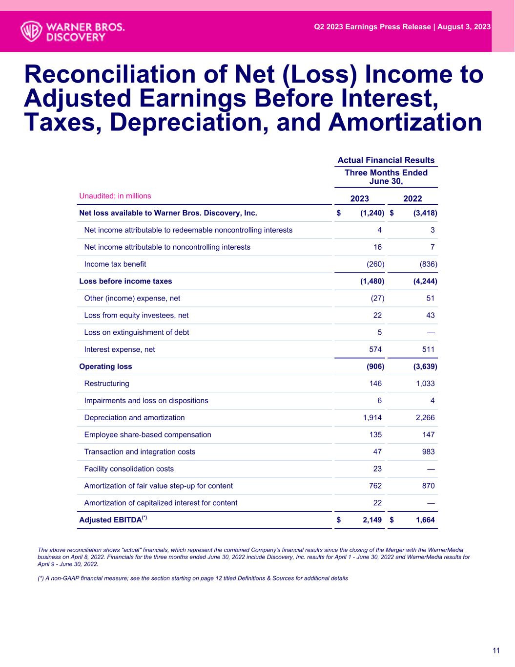 10 Actual Financial Results Six Months Ended June 30, Unaudited; in millions 2023 2022 Operating Activities Net loss $ (2,280) $ (2,933) Adjustments to reconcile net income to cash (used in) provided by operating activities: Content rights amortization and impairment 9,361 6,591 Depreciation and amortization 3,972 2,791 Deferred income taxes (1,426) (915) Preferred stock conversion premium — 789 Share-based compensation expense 248 210 Equity in losses of equity method investee companies and cash distributions 112 91 Gain on sale of investments — (132) Gain from derivative instruments, net (111) (496) Other, net 171 64 Changes in operating assets and liabilities, net of acquisitions and dispositions: Receivables, net (433) (444) Film and television content rights, games and payables, net (7,656) (4,653) Accounts payable, accrued liabilities, deferred revenues and other noncurrent liabilities (859) 8 Foreign currency, prepaid expenses and other assets, net 284 363 Cash provided by operating activities 1,383 1,334 Investing Activities Purchases of property and equipment (591) (307) Cash acquired from business acquisition — 2,419 Proceeds from sales and maturities of investments — 139 Investments in and advances to equity investments (45) (109) Proceeds from derivative instruments, net 23 720 Other investing activities, net 46 18 Cash (used in) provided by investing activities (567) 2,880 Financing Activities Principal repayments of term loans (2,600) (3,500) Principal repayments of debt, including premiums to par value (660) (327) Borrowings from debt, net of discount and issuance costs 1,500 — Distributions to noncontrolling interests and redeemable noncontrolling interests (269) (264) Securitization receivables collected but not remitted 405 — Borrowings under commercial paper program and revolving credit facility 2,599 90 Repayments under commercial paper program and revolving credit facility (2,602) (90) Other financing activities, net (56) (66) Cash used in financing activities (1,683) (4,157) Effect of exchange rate changes on cash, cash equivalents, and restricted cash 14 (66) Net change in cash, cash equivalents, and restricted cash (853) (9) Cash, cash equivalents, and restricted cash, beginning of period 3,930 3,905 Cash, cash equivalents, and restricted cash, end of period $ 3,077 $ 3,896 10 Warner Bros. Discovery, Inc. Consolidated Statements of Cash Flows The above statement of cash flows shows "actual" financials, which represent the combined Company's financial results since the closing of the Merger with the WarnerMedia business on April 8, 2022. Financials for the six months ended June 30, 2022 include Discovery, Inc. results for January 1 - June 30, 2022 and WarnerMedia results for April 9 - June 30, 2022. Q2 2023 Earnings Press Release | August 3, 2023