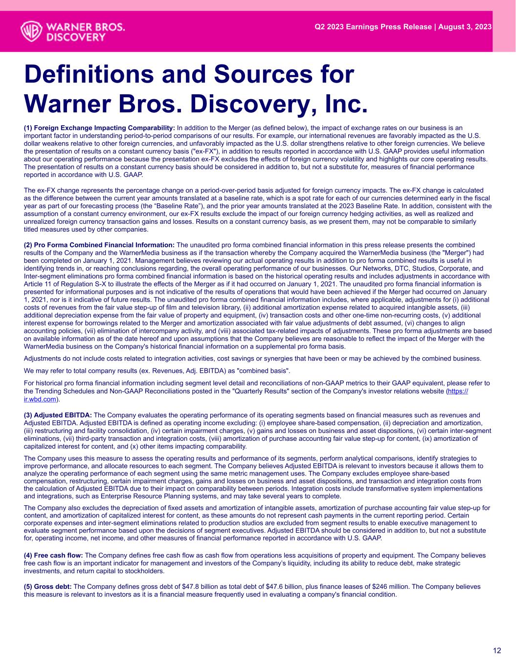 12 Definitions and Sources for Warner Bros. Discovery, Inc. (1) Foreign Exchange Impacting Comparability: In addition to the Merger (as defined below), the impact of exchange rates on our business is an important factor in understanding period-to-period comparisons of our results. For example, our international revenues are favorably impacted as the U.S. dollar weakens relative to other foreign currencies, and unfavorably impacted as the U.S. dollar strengthens relative to other foreign currencies. We believe the presentation of results on a constant currency basis ("ex-FX"), in addition to results reported in accordance with U.S. GAAP provides useful information about our operating performance because the presentation ex-FX excludes the effects of foreign currency volatility and highlights our core operating results. The presentation of results on a constant currency basis should be considered in addition to, but not a substitute for, measures of financial performance reported in accordance with U.S. GAAP. The ex-FX change represents the percentage change on a period-over-period basis adjusted for foreign currency impacts. The ex-FX change is calculated as the difference between the current year amounts translated at a baseline rate, which is a spot rate for each of our currencies determined early in the fiscal year as part of our forecasting process (the “Baseline Rate”), and the prior year amounts translated at the 2023 Baseline Rate. In addition, consistent with the assumption of a constant currency environment, our ex-FX results exclude the impact of our foreign currency hedging activities, as well as realized and unrealized foreign currency transaction gains and losses. Results on a constant currency basis, as we present them, may not be comparable to similarly titled measures used by other companies. (2) Pro Forma Combined Financial Information: The unaudited pro forma combined financial information in this press release presents the combined results of the Company and the WarnerMedia business as if the transaction whereby the Company acquired the WarnerMedia business (the "Merger") had been completed on January 1, 2021. Management believes reviewing our actual operating results in addition to pro forma combined results is useful in identifying trends in, or reaching conclusions regarding, the overall operating performance of our businesses. Our Networks, DTC, Studios, Corporate, and Inter-segment eliminations pro forma combined financial information is based on the historical operating results and includes adjustments in accordance with Article 11 of Regulation S-X to illustrate the effects of the Merger as if it had occurred on January 1, 2021. The unaudited pro forma financial information is presented for informational purposes and is not indicative of the results of operations that would have been achieved if the Merger had occurred on January 1, 2021, nor is it indicative of future results. The unaudited pro forma combined financial information includes, where applicable, adjustments for (i) additional costs of revenues from the fair value step-up of film and television library, (ii) additional amortization expense related to acquired intangible assets, (iii) additional depreciation expense from the fair value of property and equipment, (iv) transaction costs and other one-time non-recurring costs, (v) additional interest expense for borrowings related to the Merger and amortization associated with fair value adjustments of debt assumed, (vi) changes to align accounting policies, (vii) elimination of intercompany activity, and (viii) associated tax-related impacts of adjustments. These pro forma adjustments are based on available information as of the date hereof and upon assumptions that the Company believes are reasonable to reflect the impact of the Merger with the WarnerMedia business on the Company's historical financial information on a supplemental pro forma basis. Adjustments do not include costs related to integration activities, cost savings or synergies that have been or may be achieved by the combined business. We may refer to total company results (ex. Revenues, Adj. EBITDA) as "combined basis". For historical pro forma financial information including segment level detail and reconciliations of non-GAAP metrics to their GAAP equivalent, please refer to the Trending Schedules and Non-GAAP Reconciliations posted in the "Quarterly Results" section of the Company's investor relations website (https:// ir.wbd.com). (3) Adjusted EBITDA: The Company evaluates the operating performance of its operating segments based on financial measures such as revenues and Adjusted EBITDA. Adjusted EBITDA is defined as operating income excluding: (i) employee share-based compensation, (ii) depreciation and amortization, (iii) restructuring and facility consolidation, (iv) certain impairment charges, (v) gains and losses on business and asset dispositions, (vi) certain inter-segment eliminations, (vii) third-party transaction and integration costs, (viii) amortization of purchase accounting fair value step-up for content, (ix) amortization of capitalized interest for content, and (x) other items impacting comparability. The Company uses this measure to assess the operating results and performance of its segments, perform analytical comparisons, identify strategies to improve performance, and allocate resources to each segment. The Company believes Adjusted EBITDA is relevant to investors because it allows them to analyze the operating performance of each segment using the same metric management uses. The Company excludes employee share-based compensation, restructuring, certain impairment charges, gains and losses on business and asset dispositions, and transaction and integration costs from the calculation of Adjusted EBITDA due to their impact on comparability between periods. Integration costs include transformative system implementations and integrations, such as Enterprise Res