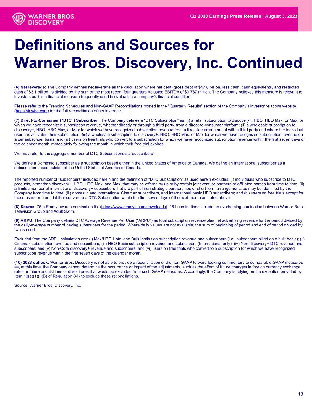 (6) Net leverage: The Company defines net leverage as the calculation where net debt (gross debt of $47.8 billion, less cash, cash equivalents, and restricted cash of $3.1 billion) is divided by the sum of the most recent four quarters Adjusted EBITDA of $9,787 million. The Company believes this measure is relevant to investors as it is a financial measure frequently used in evaluating a company's financial condition. Please refer to the Trending Schedules and Non-GAAP Reconciliations posted in the "Quarterly Results" section of the Company's investor relations website (https://ir.wbd.com) for the full reconciliation of net leverage. (7) Direct-to-Consumer ("DTC") Subscriber: The Company defines a “DTC Subscription” as: (i) a retail subscription to discovery+, HBO, HBO Max, or Max for which we have recognized subscription revenue, whether directly or through a third party, from a direct-to-consumer platform; (ii) a wholesale subscription to discovery+, HBO, HBO Max, or Max for which we have recognized subscription revenue from a fixed-fee arrangement with a third party and where the individual user has activated their subscription; (iii) a wholesale subscription to discovery+, HBO, HBO Max, or Max for which we have recognized subscription revenue on a per subscriber basis; and (iv) users on free trials who convert to a subscription for which we have recognized subscription revenue within the first seven days of the calendar month immediately following the month in which their free trial expires. We may refer to the aggregate number of DTC Subscriptions as “subscribers". We define a Domestic subscriber as a subscription based either in the United States of America or Canada. We define an International subscriber as a subscription based outside of the United States of America or Canada. The reported number of “subscribers” included herein and the definition of “DTC Subscription” as used herein excludes: (i) individuals who subscribe to DTC products, other than discovery+, HBO, HBO Max, and Max, that may be offered by us or by certain joint venture partners or affiliated parties from time to time; (ii) a limited number of international discovery+ subscribers that are part of non-strategic partnerships or short-term arrangements as may be identified by the Company from time to time; (iii) domestic and international Cinemax subscribers, and international basic HBO subscribers; and (iv) users on free trials except for those users on free trial that convert to a DTC Subscription within the first seven days of the next month as noted above. (8) Source: 75th Emmy awards nomination list (https://www.emmys.com/downloads). 181 nominations include an overlapping nomination between Warner Bros. Television Group and Adult Swim. (9) ARPU: The Company defines DTC Average Revenue Per User ("ARPU") as total subscription revenue plus net advertising revenue for the period divided by the daily-average number of paying subscribers for the period. Where daily values are not available, the sum of beginning of period and end of period divided by two is used. Excluded from the ARPU calculation are: (i) Max/HBO Hotel and Bulk Institution subscription revenue and subscribers (i.e., subscribers billed on a bulk basis); (ii) Cinemax subscription revenue and subscribers; (iii) HBO Basic subscription revenue and subscribers (International-only); (iv) Non-discovery+ DTC revenue and subscribers; and (v) Non-Core discovery+ revenue and subscribers, and (vi) users on free trials who convert to a subscription for which we have recognized subscription revenue within the first seven days of the calendar month. (10) 2023 outlook: Warner Bros. Discovery is not able to provide a reconciliation of the non-GAAP forward-looking commentary to comparable GAAP measures as, at this time, the Company cannot determine the occurrence or impact of the adjustments, such as the effect of future changes in foreign currency exchange rates or future acquisitions or divestitures that would be excluded from such GAAP measures. Accordingly, the Company is relying on the exception provided by Item 10(e)(1)(i)(B) of Regulation S-K to exclude these reconciliations. Source: Warner Bros. Discovery, Inc. 13 Definitions and Sources for Warner Bros. Discovery, Inc. Continued Q2 2023 Earnings Press Release | August 3, 2023