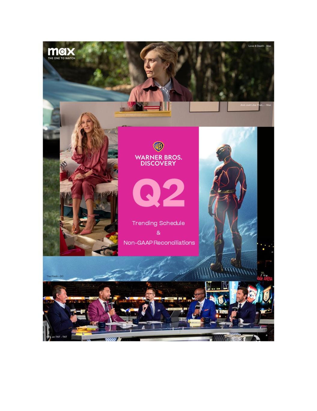 Merger with the WarnerMedia Business of AT&T On April 8, 2022, Discovery, Inc. (“Discovery”) completed its merger (the “Merger”) with the WarnerMedia business of AT&T Inc. (the “WarnerMedia Business”) and changed its name to “Warner Bros. Discovery, Inc.” (“Warner Bros. Discovery”, “WBD”, the “Company”, “we”, “us” or “our”). Purpose of Trending Schedules The trending schedules summarize unaudited pro forma combined financial information to facilitate your review and understanding of the Company’s operating results. The trending schedules set forth important financial measures utilized by the Company defined by U.S. generally accepted accounting principles (“GAAP”). The Company uses non-GAAP financial measures, among other measures, to evaluate the operating performance of our business. These non-GAAP financial measures are in addition to, not a substitute for, or superior to, measures of financial performance prepared in accordance with U.S. GAAP. Pro Forma Combined Financial Information The unaudited pro forma combined financial information in the trending schedules presents the combined results of the Company and the WarnerMedia Business as if the Merger had been completed on January 1, 2021. Our Networks, DTC (as defined below), Studios and Corporate and Intersegment-eliminations pro forma financial information is based on the historical operating results and includes adjustments in accordance with Article 11 of Regulation S-X to illustrate the effects of the Merger as if it had occurred on January 1, 2021. The unaudited pro forma combined financial information is presented for informational purposes and is not indicative of the results of operations that would have been achieved if the Merger had occurred on January 1, 2021, nor is it indicative of future results. The unaudited pro forma financial information includes, where applicable, adjustments for (i) additional costs of revenues from the fair value step-up of film and television library, (ii) additional amortization expense related to acquired intangible assets, (iii) additional depreciation expense from the fair value of property and equipment, (iv) transaction costs and other one-time non-recurring costs, (v) additional interest expense for borrowings related to the Merger and amortization associated with fair value adjustments of debt assumed, (vi) changes to align accounting policies, (vii) elimination of intercompany activity, and (viii) associated tax-related impacts of adjustments.These pro forma adjustments are based on available information as of the date hereof and upon assumptions that the Company believes are reasonable to reflect the impact of the Merger with the WarnerMedia Business on the Company's historical financial information on a supplemental pro forma basis. Adjustments do not include costs related to integration activities, cost savings or synergies that have been or may be achieved by the combined business. Reporting Segments In connection with the Merger, the Company reevaluated and changed its segment presentation during the quarter ended June 30, 2022. Accordingly, beginning in the quarter ended June 30, 2022, and for all periods presented, we are reporting results based on the following segments: Networks, consisting primarily of our domestic and international television networks Direct-to-Consumer ("DTC"), consisting primarily of our premium pay TV and digital content services Studios, consisting primarily of the production and release of feature films for initial exhibition in theaters and/or on our DTC services, production and initial licensing of television programs to third party and our networks/DTC services, distribution of our films and television programs to various third party and internal television and streaming services, distribution through the home entertainment market (physical and digital), related consumer products and themed experience licensing, and interactive gaming. Financial Measures Warner Bros. Discovery previously used the non-GAAP measure of Adjusted OIBDA as an important financial measure, among other measures, to evaluate the operating performance of our business. Adjusted OIBDA was defined as operating income excluding: (i) employee share-based compensation, (ii) depreciation and amortization, (iii) restructuring and other charges, (iv) certain impairment charges, (v) gains and losses on business and asset dispositions, (vi) certain inter-segment eliminations related to production studios, (vii) third-party transaction and integration costs, and (viii) other items impacting comparability. Beginning with the period ended June 30, 2022, and for all periods presented, Warner Bros. Discovery will utilize the non-GAAP measure of Adjusted EBITDA, as defined below and in the Notes & Definitions section as an important financial measure, among other measures, to evaluate the operating performance of our business. The Company defines Adjusted EBITDA as operating income excluding: (i) employee share-based compensation, (ii) depreciation and amortization, (iii) restructuring and facility consolidation, (iv) certain impairment charges, (v) gains and losses on business and asset dispositions, (vi) certain inter-segment eliminations, (vii) third-party transaction and integration costs, (viii) amortization of purchase accounting fair value step-up for content, (ix) amortization of capitalized interest for content, and (x) other items impacting comparability. Adjusted EBITDA should be considered in addition to, but not a substitute for, operating income, net income and other measures of financial performance reported in accordance with U.S. GAAP. Non-GAAP Financial Measures In addition to financial measures prepared in accordance with U.S. GAAP, this communication may also contain certain non-GAAP financial measures, identified with an "(*)". Reconciliations between the non-GAAP financial measures and the closest GAAP financial measures are