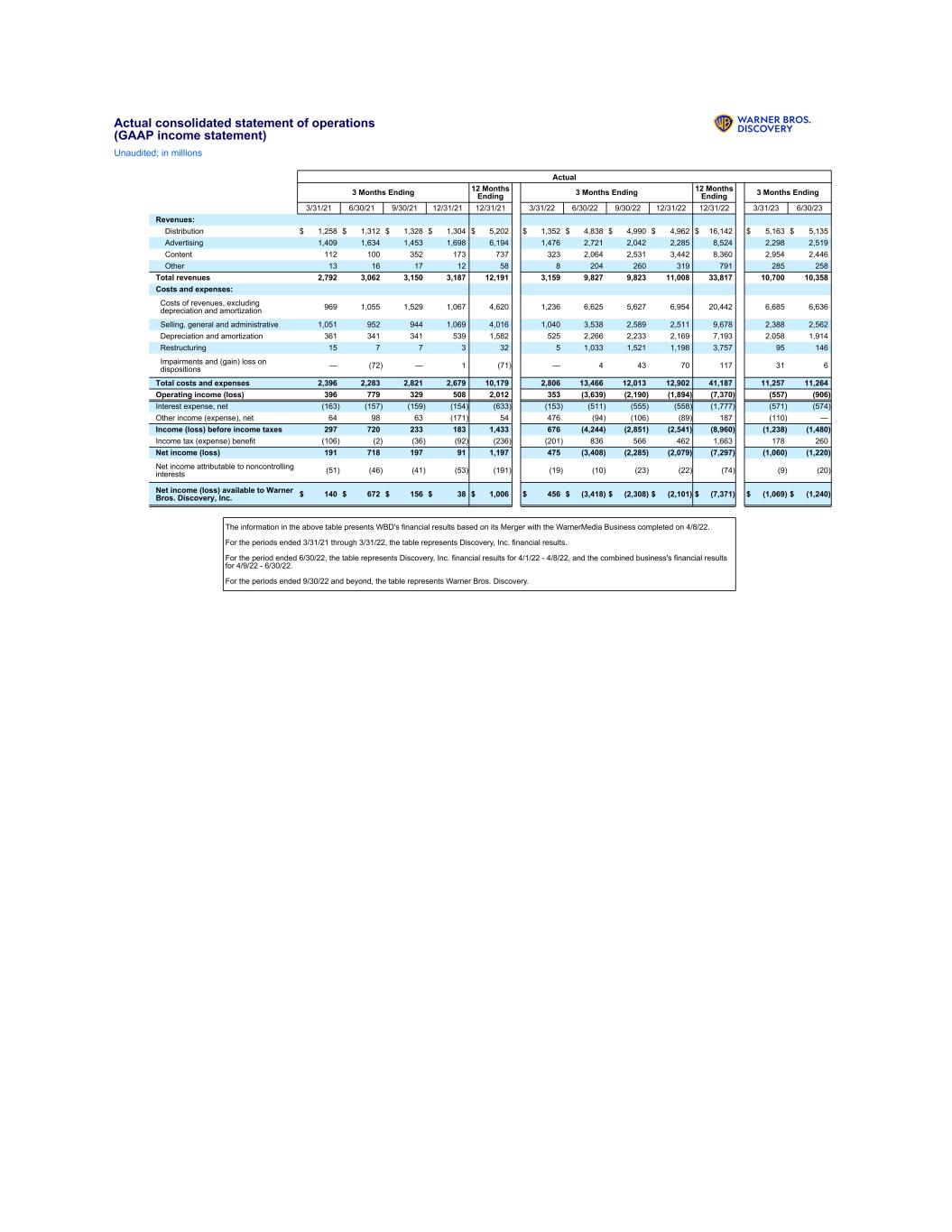 Actual consolidated statement of operations (GAAP income statement) Unaudited; in millions Actual 3 Months Ending 12 Months Ending 3 Months Ending 12 Months Ending 3 Months Ending 3/31/21 6/30/21 9/30/21 12/31/21 12/31/21 3/31/22 6/30/22 9/30/22 12/31/22 12/31/22 3/31/23 6/30/23 Revenues: Distribution $ 1,258 $ 1,312 $ 1,328 $ 1,304 $ 5,202 $ 1,352 $ 4,838 $ 4,990 $ 4,962 $ 16,142 $ 5,163 $ 5,135 Advertising 1,409 1,634 1,453 1,698 6,194 1,476 2,721 2,042 2,285 8,524 2,298 2,519 Content 112 100 352 173 737 323 2,064 2,531 3,442 8,360 2,954 2,446 Other 13 16 17 12 58 8 204 260 319 791 285 258 Total revenues 2,792 3,062 3,150 3,187 12,191 3,159 9,827 9,823 11,008 33,817 10,700 10,358 Costs and expenses: Costs of revenues, excluding depreciation and amortization 969 1,055 1,529 1,067 4,620 1,236 6,625 5,627 6,954 20,442 6,685 6,636 Selling, general and administrative 1,051 952 944 1,069 4,016 1,040 3,538 2,589 2,511 9,678 2,388 2,562 Depreciation and amortization 361 341 341 539 1,582 525 2,266 2,233 2,169 7,193 2,058 1,914 Restructuring 15 7 7 3 32 5 1,033 1,521 1,198 3,757 95 146 Impairments and (gain) loss on dispositions — (72) — 1 (71) — 4 43 70 117 31 6 Total costs and expenses 2,396 2,283 2,821 2,679 10,179 2,806 13,466 12,013 12,902 41,187 11,257 11,264 Operating income (loss) 396 779 329 508 2,012 353 (3,639) (2,190) (1,894) (7,370) (557) (906) Interest expense, net (163) (157) (159) (154) (633) (153) (511) (555) (558) (1,777) (571) (574) Other income (expense), net 64 98 63 (171) 54 476 (94) (106) (89) 187 (110) — Income (loss) before income taxes 297 720 233 183 1,433 676 (4,244) (2,851) (2,541) (8,960) (1,238) (1,480) Income tax (expense) benefit (106) (2) (36) (92) (236) (201) 836 566 462 1,663 178 260 Net income (loss) 191 718 197 91 1,197 475 (3,408) (2,285) (2,079) (7,297) (1,060) (1,220) Net income attributable to noncontrolling interests (51) (46) (41) (53) (191) (19) (10) (23) (22) (74) (9) (20) Net income (loss) available to Warner Bros. Discovery, Inc. $ 140 $ 672 $ 156 $ 38 $ 1,006 $ 456 $ (3,418) $ (2,308) $ (2,101) $ (7,371) $ (1,069) $ (1,240) The information in the above table presents WBD's financial results based on its Merger with the WarnerMedia Business completed on 4/8/22. For the periods ended 3/31/21 through 3/31/22, the table represents Discovery, Inc. financial results. For the period ended 6/30/22, the table represents Discovery, Inc. financial results for 4/1/22 - 4/8/22, and the combined business's financial results for 4/9/22 - 6/30/22. For the periods ended 9/30/22 and beyond, the table represents Warner Bros. Discovery.
