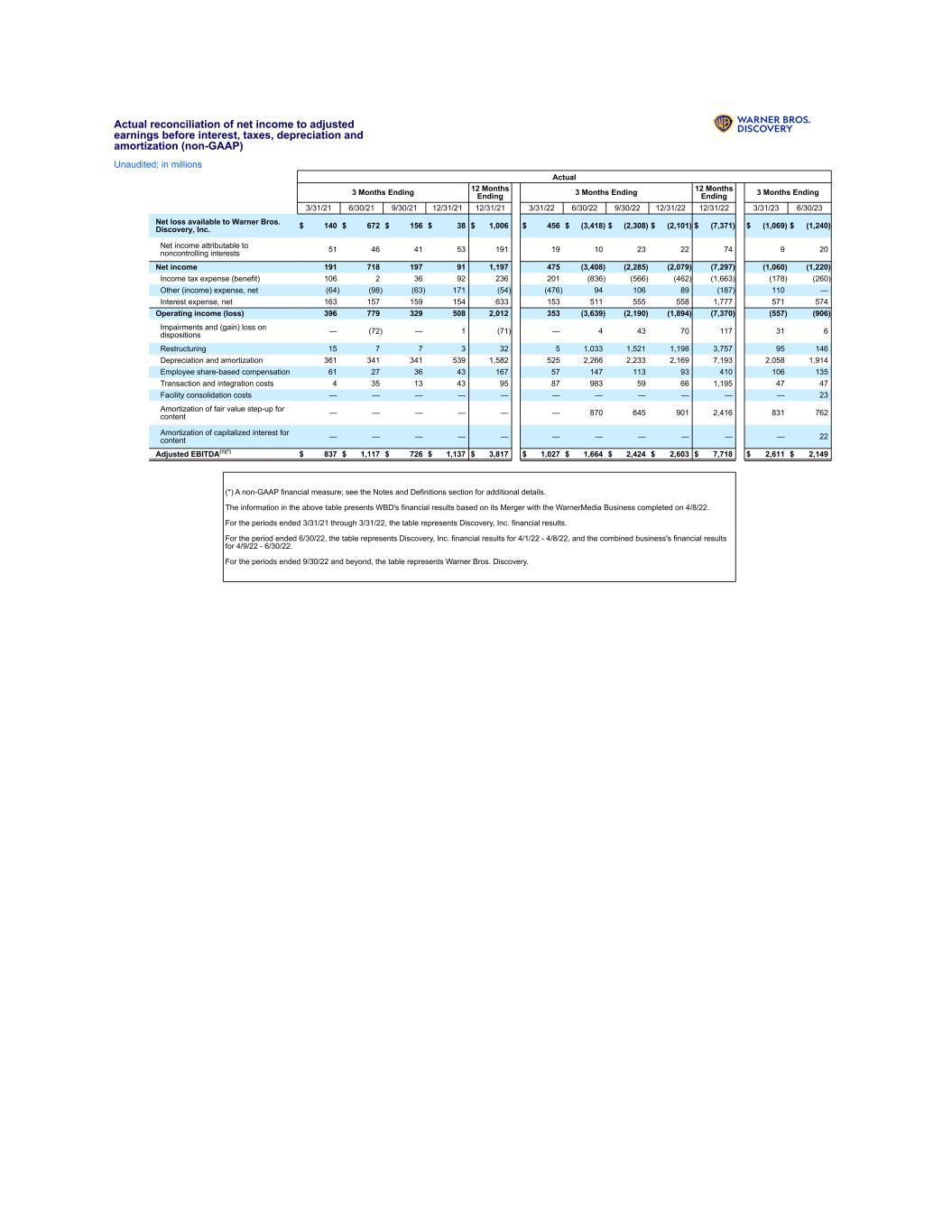 Actual reconciliation of net income to adjusted earnings before interest, taxes, depreciation and amortization (non-GAAP) Unaudited; in millions Actual 3 Months Ending 12 Months Ending 3 Months Ending 12 Months Ending 3 Months Ending 3/31/21 6/30/21 9/30/21 12/31/21 12/31/21 3/31/22 6/30/22 9/30/22 12/31/22 12/31/22 3/31/23 6/30/23 Net loss available to Warner Bros. Discovery, Inc. $ 140 $ 672 $ 156 $ 38 $ 1,006 $ 456 $ (3,418) $ (2,308) $ (2,101) $ (7,371) $ (1,069) $ (1,240) Net income attributable to noncontrolling interests 51 46 41 53 191 19 10 23 22 74 9 20 Net income 191 718 197 91 1,197 475 (3,408) (2,285) (2,079) (7,297) (1,060) (1,220) Income tax expense (benefit) 106 2 36 92 236 201 (836) (566) (462) (1,663) (178) (260) Other (income) expense, net (64) (98) (63) 171 (54) (476) 94 106 89 (187) 110 — Interest expense, net 163 157 159 154 633 153 511 555 558 1,777 571 574 Operating income (loss) 396 779 329 508 2,012 353 (3,639) (2,190) (1,894) (7,370) (557) (906) Impairments and (gain) loss on dispositions — (72) — 1 (71) — 4 43 70 117 31 6 Restructuring 15 7 7 3 32 5 1,033 1,521 1,198 3,757 95 146 Depreciation and amortization 361 341 341 539 1,582 525 2,266 2,233 2,169 7,193 2,058 1,914 Employee share-based compensation 61 27 36 43 167 57 147 113 93 410 106 135 Transaction and integration costs 4 35 13 43 95 87 983 59 66 1,195 47 47 Facility consolidation costs — — — — — — — — — — — 23 Amortization of fair value step-up for content — — — — — — 870 645 901 2,416 831 762 Amortization of capitalized interest for content — — — — — — — — — — — 22 Adjusted EBITDA(1)(*) $ 837 $ 1,117 $ 726 $ 1,137 $ 3,817 $ 1,027 $ 1,664 $ 2,424 $ 2,603 $ 7,718 $ 2,611 $ 2,149 (*) A non-GAAP financial measure; see the Notes and Definitions section for additional details. The information in the above table presents WBD's financial results based on its Merger with the WarnerMedia Business completed on 4/8/22. For the periods ended 3/31/21 through 3/31/22, the table represents Discovery, Inc. financial results. For the period ended 6/30/22, the table represents Discovery, Inc. financial results for 4/1/22 - 4/8/22, and the combined business's financial results for 4/9/22 - 6/30/22. For the periods ended 9/30/22 and beyond, the table represents Warner Bros. Discovery.