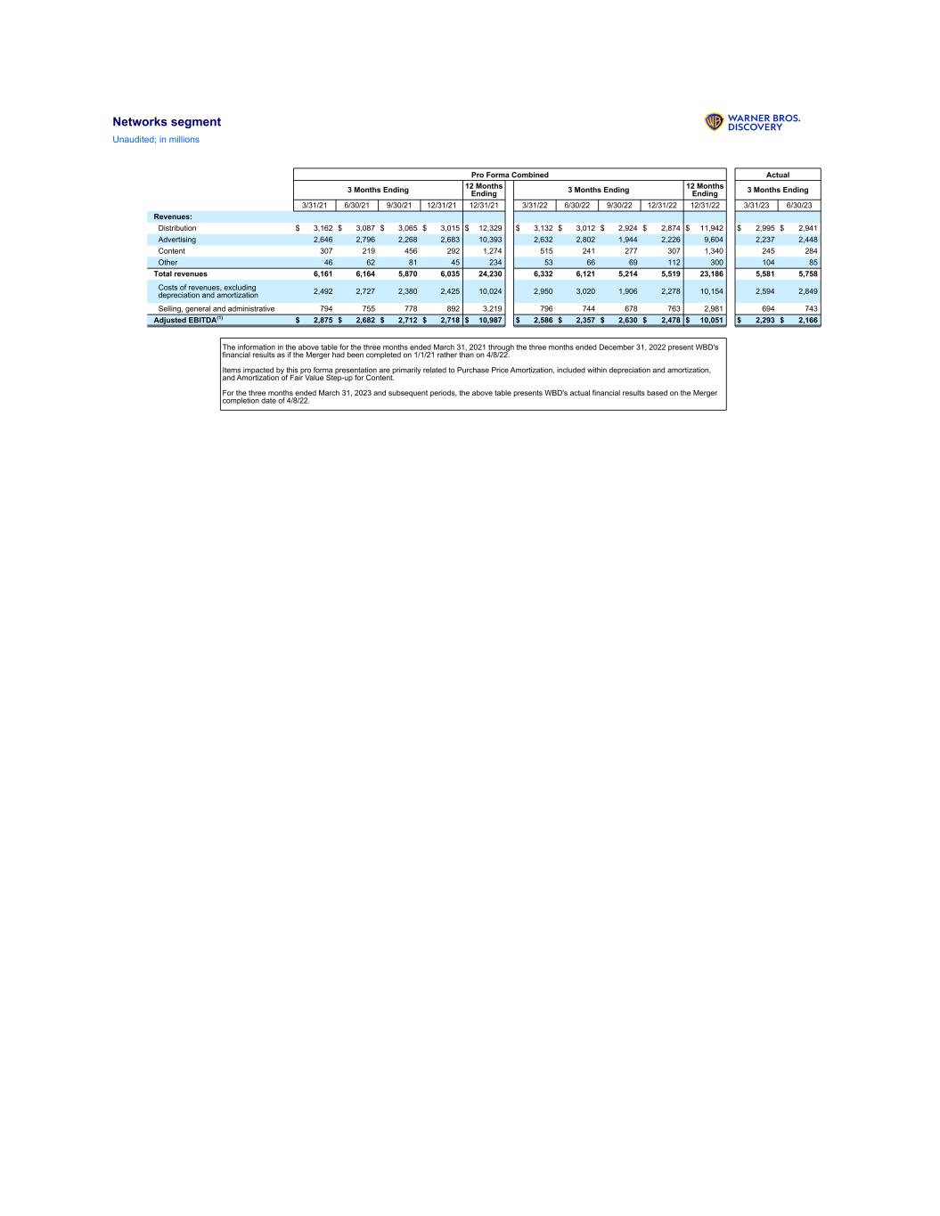 Networks segment Unaudited; in millions Pro Forma Combined Actual 3 Months Ending 12 Months Ending 3 Months Ending 12 Months Ending 3 Months Ending 3/31/21 6/30/21 9/30/21 12/31/21 12/31/21 3/31/22 6/30/22 9/30/22 12/31/22 12/31/22 3/31/23 6/30/23 Revenues: Distribution $ 3,162 $ 3,087 $ 3,065 $ 3,015 $ 12,329 $ 3,132 $ 3,012 $ 2,924 $ 2,874 $ 11,942 $ 2,995 $ 2,941 Advertising 2,646 2,796 2,268 2,683 10,393 2,632 2,802 1,944 2,226 9,604 2,237 2,448 Content 307 219 456 292 1,274 515 241 277 307 1,340 245 284 Other 46 62 81 45 234 53 66 69 112 300 104 85 Total revenues 6,161 6,164 5,870 6,035 24,230 6,332 6,121 5,214 5,519 23,186 5,581 5,758 Costs of revenues, excluding depreciation and amortization 2,492 2,727 2,380 2,425 10,024 2,950 3,020 1,906 2,278 10,154 2,594 2,849 Selling, general and administrative 794 755 778 892 3,219 796 744 678 763 2,981 694 743 Adjusted EBITDA(1) $ 2,875 $ 2,682 $ 2,712 $ 2,718 $ 10,987 $ 2,586 $ 2,357 $ 2,630 $ 2,478 $ 10,051 $ 2,293 $ 2,166 The information in the above table for the three months ended March 31, 2021 through the three months ended December 31, 2022 present WBD's financial results as if the Merger had been completed on 1/1/21 rather than on 4/8/22. Items impacted by this pro forma presentation are primarily related to Purchase Price Amortization, included within depreciation and amortization, and Amortization of Fair Value Step-up for Content. For the three months ended March 31, 2023 and subsequent periods, the above table presents WBD's actual financial results based on the Merger completion date of 4/8/22.