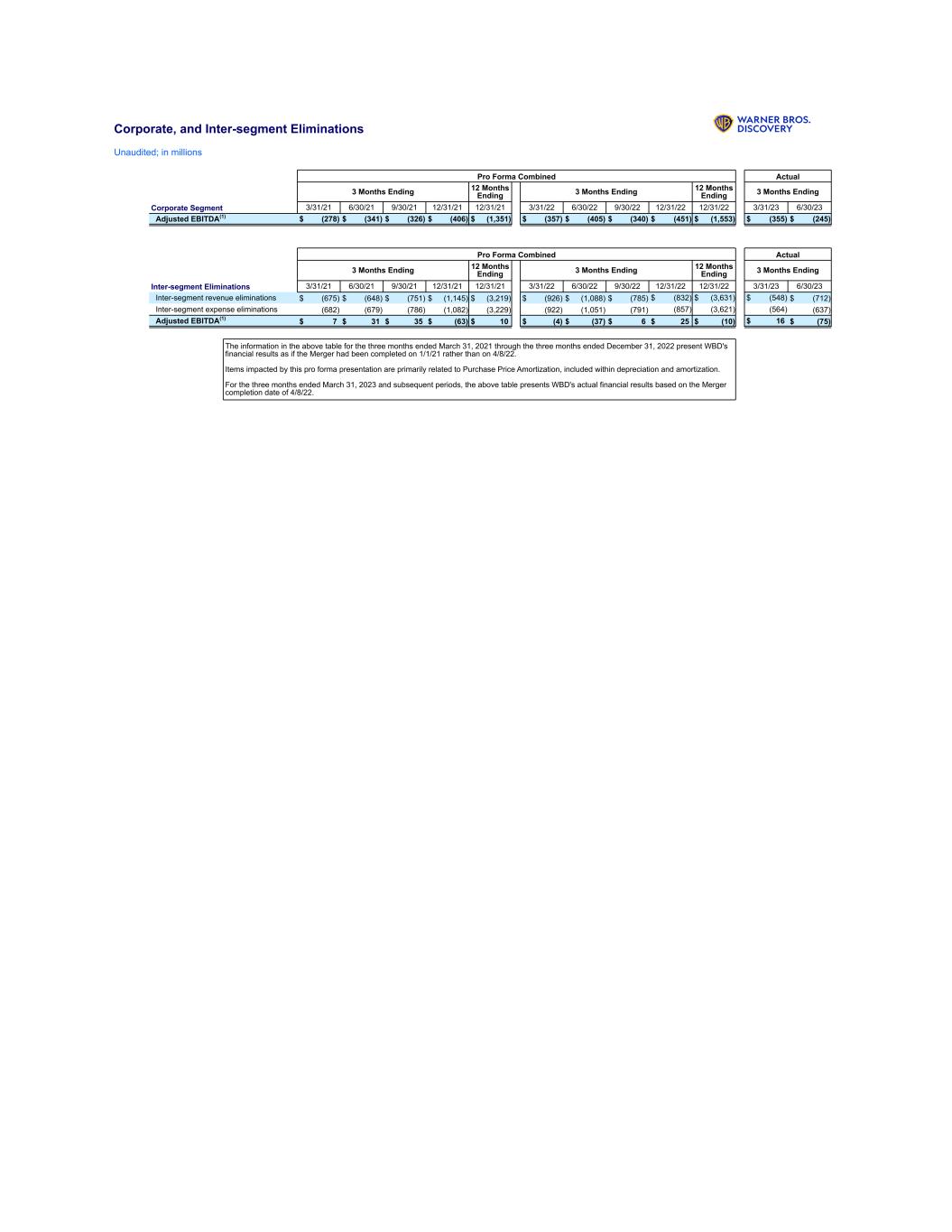 Corporate, and Inter-segment Eliminations Unaudited; in millions Pro Forma Combined Actual 3 Months Ending 12 Months Ending 3 Months Ending 12 Months Ending 3 Months Ending Corporate Segment 3/31/21 6/30/21 9/30/21 12/31/21 12/31/21 3/31/22 6/30/22 9/30/22 12/31/22 12/31/22 3/31/23 6/30/23 Adjusted EBITDA(1) $ (278) $ (341) $ (326) $ (406) $ (1,351) $ (357) $ (405) $ (340) $ (451) $ (1,553) $ (355) $ (245) Pro Forma Combined Actual 3 Months Ending 12 Months Ending 3 Months Ending 12 Months Ending 3 Months Ending Inter-segment Eliminations 3/31/21 6/30/21 9/30/21 12/31/21 12/31/21 3/31/22 6/30/22 9/30/22 12/31/22 12/31/22 3/31/23 6/30/23 Inter-segment revenue eliminations $ (675) $ (648) $ (751) $ (1,145) $ (3,219) $ (926) $ (1,088) $ (785) $ (832) $ (3,631) $ (548) $ (712) Inter-segment expense eliminations (682) (679) (786) (1,082) (3,229) (922) (1,051) (791) (857) (3,621) (564) (637) Adjusted EBITDA(1) $ 7 $ 31 $ 35 $ (63) $ 10 $ (4) $ (37) $ 6 $ 25 $ (10) $ 16 $ (75) The information in the above table for the three months ended March 31, 2021 through the three months ended December 31, 2022 present WBD's financial results as if the Merger had been completed on 1/1/21 rather than on 4/8/22. Items impacted by this pro forma presentation are primarily related to Purchase Price Amortization, included within depreciation and amortization. For the three months ended March 31, 2023 and subsequent periods, the above table presents WBD's actual financial results based on the Merger completion date of 4/8/22.