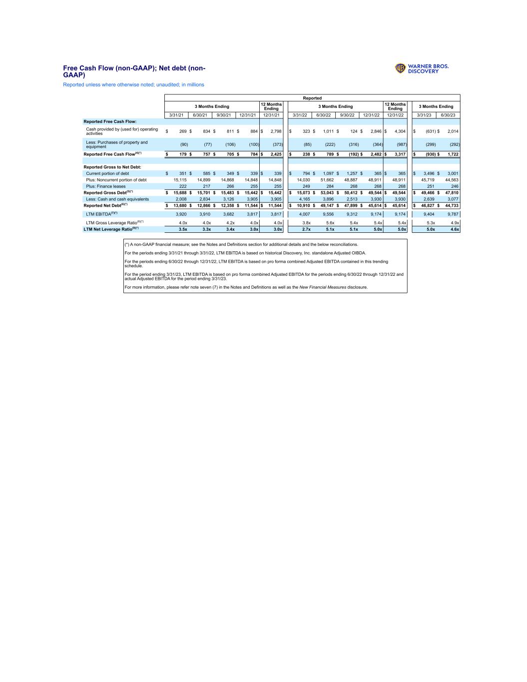 Free Cash Flow (non-GAAP); Net debt (non- GAAP) Reported unless where otherwise noted; unaudited; in millions Reported 3 Months Ending 12 Months Ending 3 Months Ending 12 Months Ending 3 Months Ending 3/31/21 6/30/21 9/30/21 12/31/21 12/31/21 3/31/22 6/30/22 9/30/22 12/31/22 12/31/22 3/31/23 6/30/23 Reported Free Cash Flow: Cash provided by (used for) operating activities $ 269 $ 834 $ 811 $ 884 $ 2,798 $ 323 $ 1,011 $ 124 $ 2,846 $ 4,304 $ (631) $ 2,014 Less: Purchases of property and equipment (90) (77) (106) (100) (373) (85) (222) (316) (364) (987) (299) (292) Reported Free Cash Flow(4)(*) $ 179 $ 757 $ 705 $ 784 $ 2,425 $ 238 $ 789 $ (192) $ 2,482 $ 3,317 $ (930) $ 1,722 Reported Gross to Net Debt: Current portion of debt $ 351 $ 585 $ 349 $ 339 $ 339 $ 794 $ 1,097 $ 1,257 $ 365 $ 365 $ 3,496 $ 3,001 Plus: Noncurrent portion of debt 15,115 14,899 14,868 14,848 14,848 14,030 51,662 48,887 48,911 48,911 45,719 44,563 Plus: Finance leases 222 217 266 255 255 249 284 268 268 268 251 246 Reported Gross Debt(5)(*) $ 15,688 $ 15,701 $ 15,483 $ 15,442 $ 15,442 $ 15,073 $ 53,043 $ 50,412 $ 49,544 $ 49,544 $ 49,466 $ 47,810 Less: Cash and cash equivalents 2,008 2,834 3,126 3,905 3,905 4,165 3,896 2,513 3,930 3,930 2,639 3,077 Reported Net Debt(6)(*) $ 13,680 $ 12,866 $ 12,358 $ 11,544 $ 11,544 $ 10,910 $ 49,147 $ 47,899 $ 45,614 $ 45,614 $ 46,827 $ 44,733 LTM EBITDA(7)(*) 3,920 3,910 3,682 3,817 3,817 4,007 9,556 9,312 9,174 9,174 9,404 9,787 LTM Gross Leverage Ratio(8)(*) 4.0x 4.0x 4.2x 4.0x 4.0x 3.8x 5.6x 5.4x 5.4x 5.4x 5.3x 4.9x LTM Net Leverage Ratio(9)(*) 3.5x 3.3x 3.4x 3.0x 3.0x 2.7x 5.1x 5.1x 5.0x 5.0x 5.0x 4.6x (*) A non-GAAP financial measure; see the Notes and Definitions section for additional details and the below reconciliations. For the periods ending 3/31/21 through 3/31/22, LTM EBITDA is based on historical Discovery, Inc. standalone Adjusted OIBDA. For the periods ending 6/30/22 through 12/31/22, LTM EBITDA is based on pro forma combined Adjusted EBITDA contained in this trending schedule. For the period ending 3/31/23, LTM EBITDA is based on pro forma combined Adjusted EBITDA for the periods ending 6/30/22 through 12/31/22 and actual Adjusted EBITDA for the period ending 3/31/23. For more information, please refer note seven (7) in the Notes and Definitions as well as the New Financial Measures disclosure.