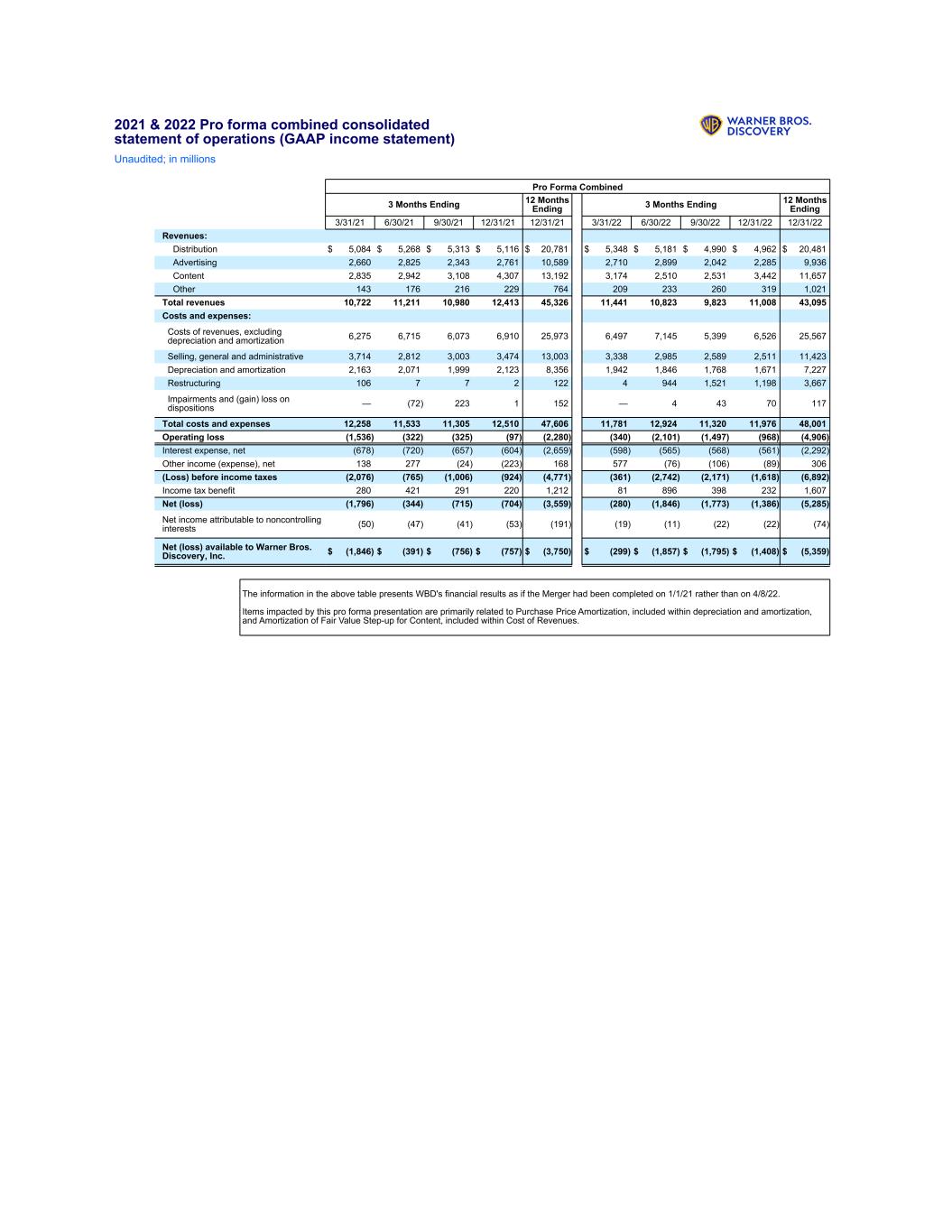 2021 & 2022 Pro forma combined consolidated statement of operations (GAAP income statement) Unaudited; in millions Pro Forma Combined 3 Months Ending 12 Months Ending 3 Months Ending 12 Months Ending 3/31/21 6/30/21 9/30/21 12/31/21 12/31/21 3/31/22 6/30/22 9/30/22 12/31/22 12/31/22 Revenues: Distribution $ 5,084 $ 5,268 $ 5,313 $ 5,116 $ 20,781 $ 5,348 $ 5,181 $ 4,990 $ 4,962 $ 20,481 Advertising 2,660 2,825 2,343 2,761 10,589 2,710 2,899 2,042 2,285 9,936 Content 2,835 2,942 3,108 4,307 13,192 3,174 2,510 2,531 3,442 11,657 Other 143 176 216 229 764 209 233 260 319 1,021 Total revenues 10,722 11,211 10,980 12,413 45,326 11,441 10,823 9,823 11,008 43,095 Costs and expenses: Costs of revenues, excluding depreciation and amortization 6,275 6,715 6,073 6,910 25,973 6,497 7,145 5,399 6,526 25,567 Selling, general and administrative 3,714 2,812 3,003 3,474 13,003 3,338 2,985 2,589 2,511 11,423 Depreciation and amortization 2,163 2,071 1,999 2,123 8,356 1,942 1,846 1,768 1,671 7,227 Restructuring 106 7 7 2 122 4 944 1,521 1,198 3,667 Impairments and (gain) loss on dispositions — (72) 223 1 152 — 4 43 70 117 Total costs and expenses 12,258 11,533 11,305 12,510 47,606 11,781 12,924 11,320 11,976 48,001 Operating loss (1,536) (322) (325) (97) (2,280) (340) (2,101) (1,497) (968) (4,906) Interest expense, net (678) (720) (657) (604) (2,659) (598) (565) (568) (561) (2,292) Other income (expense), net 138 277 (24) (223) 168 577 (76) (106) (89) 306 (Loss) before income taxes (2,076) (765) (1,006) (924) (4,771) (361) (2,742) (2,171) (1,618) (6,892) Income tax benefit 280 421 291 220 1,212 81 896 398 232 1,607 Net (loss) (1,796) (344) (715) (704) (3,559) (280) (1,846) (1,773) (1,386) (5,285) Net income attributable to noncontrolling interests (50) (47) (41) (53) (191) (19) (11) (22) (22) (74) Net (loss) available to Warner Bros. Discovery, Inc. $ (1,846) $ (391) $ (756) $ (757) $ (3,750) $ (299) $ (1,857) $ (1,795) $ (1,408) $ (5,359) The information in the above table presents WBD's financial results as if the Merger had been completed on 1/1/21 rather than on 4/8/22. Items impacted by this pro forma presentation are primarily related to Purchase Price Amortization, included within depreciation and amortization, and Amortization of Fair Value Step-up for Content, included within Cost of Revenues.