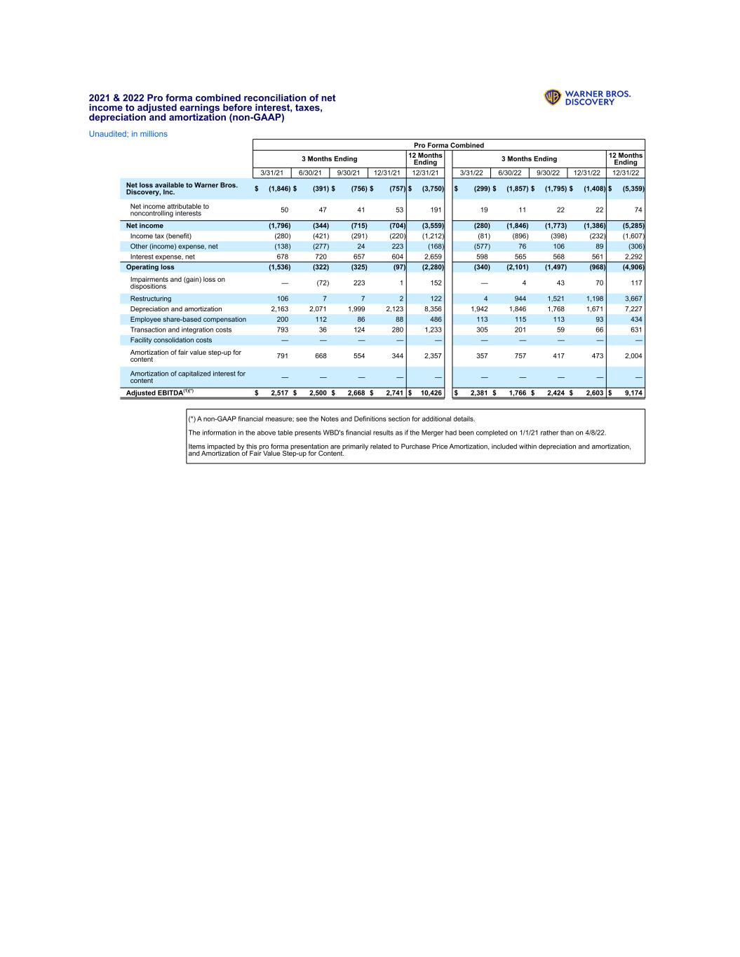 2021 & 2022 Pro forma combined reconciliation of net income to adjusted earnings before interest, taxes, depreciation and amortization (non-GAAP) Unaudited; in millions Pro Forma Combined 3 Months Ending 12 Months Ending 3 Months Ending 12 Months Ending 3/31/21 6/30/21 9/30/21 12/31/21 12/31/21 3/31/22 6/30/22 9/30/22 12/31/22 12/31/22 Net loss available to Warner Bros. Discovery, Inc. $ (1,846) $ (391) $ (756) $ (757) $ (3,750) $ (299) $ (1,857) $ (1,795) $ (1,408) $ (5,359) Net income attributable to noncontrolling interests 50 47 41 53 191 19 11 22 22 74 Net income (1,796) (344) (715) (704) (3,559) (280) (1,846) (1,773) (1,386) (5,285) Income tax (benefit) (280) (421) (291) (220) (1,212) (81) (896) (398) (232) (1,607) Other (income) expense, net (138) (277) 24 223 (168) (577) 76 106 89 (306) Interest expense, net 678 720 657 604 2,659 598 565 568 561 2,292 Operating loss (1,536) (322) (325) (97) (2,280) (340) (2,101) (1,497) (968) (4,906) Impairments and (gain) loss on dispositions — (72) 223 1 152 — 4 43 70 117 Restructuring 106 7 7 2 122 4 944 1,521 1,198 3,667 Depreciation and amortization 2,163 2,071 1,999 2,123 8,356 1,942 1,846 1,768 1,671 7,227 Employee share-based compensation 200 112 86 88 486 113 115 113 93 434 Transaction and integration costs 793 36 124 280 1,233 305 201 59 66 631 Facility consolidation costs — — — — — — — — — — Amortization of fair value step-up for content 791 668 554 344 2,357 357 757 417 473 2,004 Amortization of capitalized interest for content — — — — — — — — — — Adjusted EBITDA(1)(*) $ 2,517 $ 2,500 $ 2,668 $ 2,741 $ 10,426 $ 2,381 $ 1,766 $ 2,424 $ 2,603 $ 9,174 (*) A non-GAAP financial measure; see the Notes and Definitions section for additional details. The information in the above table presents WBD's financial results as if the Merger had been completed on 1/1/21 rather than on 4/8/22. Items impacted by this pro forma presentation are primarily related to Purchase Price Amortization, included within depreciation and amortization, and Amortization of Fair Value Step-up for Content.