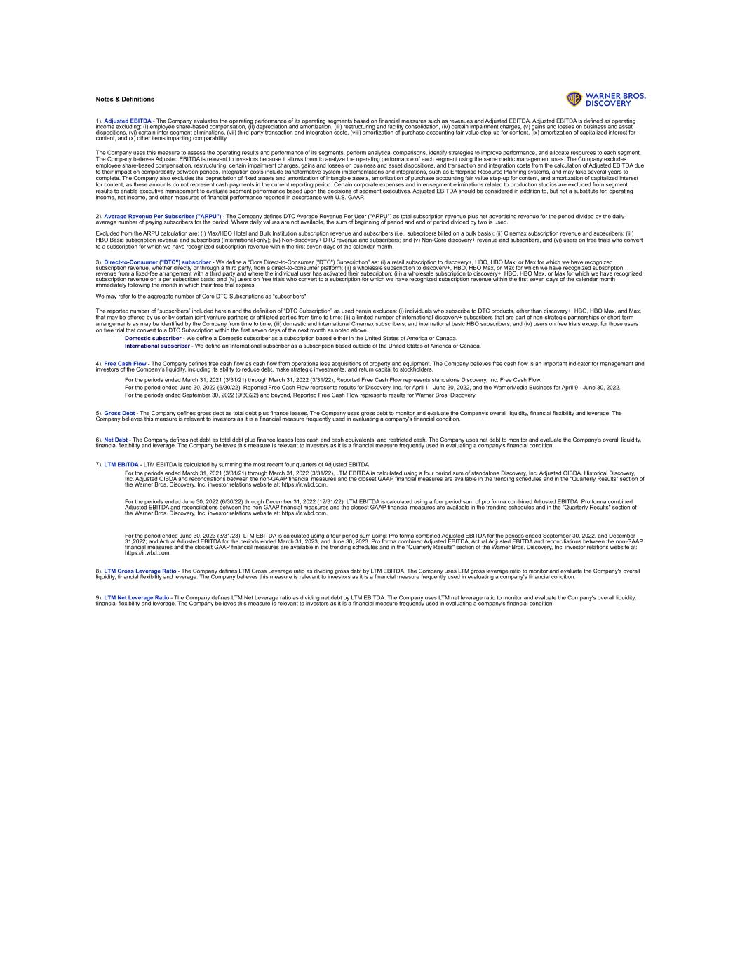 Notes & Definitions 1). Adjusted EBITDA - The Company evaluates the operating performance of its operating segments based on financial measures such as revenues and Adjusted EBITDA. Adjusted EBITDA is defined as operating income excluding: (i) employee share-based compensation, (ii) depreciation and amortization, (iii) restructuring and facility consolidation, (iv) certain impairment charges, (v) gains and losses on business and asset dispositions, (vi) certain inter-segment eliminations, (vii) third-party transaction and integration costs, (viii) amortization of purchase accounting fair value step-up for content, (ix) amortization of capitalized interest for content, and (x) other items impacting comparability. The Company uses this measure to assess the operating results and performance of its segments, perform analytical comparisons, identify strategies to improve performance, and allocate resources to each segment. The Company believes Adjusted EBITDA is relevant to investors because it allows them to analyze the operating performance of each segment using the same metric management uses. The Company excludes employee share-based compensation, restructuring, certain impairment charges, gains and losses on business and asset dispositions, and transaction and integration costs from the calculation of Adjusted EBITDA due to their impact on comparability between periods. Integration costs include transformative system implementations and integrations, such as Enterprise Resource Planning systems, and may take several years to complete. The Company also excludes the depreciation of fixed assets and amortization of intangible assets, amortization of purchase accounting fair value step-up for content, and amortization of capitalized interest for content, as these amounts do not represent cash payments in the current reporting period. Certain corporate expenses and inter-segment eliminations related to production studios are excluded from segment results to enable executive management to evaluate segment performance based upon the decisions of segment executives. Adjusted EBITDA should be considered in addition to, but not a substitute for, operating income, net income, and other measures of financial performance reported in accordance with U.S. GAAP. 2). Average Revenue Per Subscriber ("ARPU") - The Company defines DTC Average Revenue Per User ("ARPU") as total subscription revenue plus net advertising revenue for the period divided by the daily- average number of paying subscribers for the period. Where daily values are not available, the sum of beginning of period and end of period divided by two is used. Excluded from the ARPU calculation are: (i) Max/HBO Hotel and Bulk Institution subscription revenue and subscribers (i.e., subscribers billed on a bulk basis); (ii) Cinemax subscription revenue and subscribers; (iii) HBO Basic subscription revenue and subscribers (International-only); (iv) Non-discovery+ DTC revenue and subscribers; and (v) Non-Core discovery+ revenue and subscribers, and (vi) users on free trials who convert to a subscription for which we have recognized subscription revenue within the first seven days of the calendar month. 3). Direct-to-Consumer ("DTC") subscriber - We define a “Core Direct-to-Consumer ("DTC") Subscription” as: (i) a retail subscription to discovery+, HBO, HBO Max, or Max for which we have recognized subscription revenue, whether directly or through a third party, from a direct-to-consumer platform; (ii) a wholesale subscription to discovery+, HBO, HBO Max, or Max for which we have recognized subscription revenue from a fixed-fee arrangement with a third party and where the individual user has activated their subscription; (iii) a wholesale subscription to discovery+, HBO, HBO Max, or Max for which we have recognized subscription revenue on a per subscriber basis; and (iv) users on free trials who convert to a subscription for which we have recognized subscription revenue within the first seven days of the calendar month immediately following the month in which their free trial expires. We may refer to the aggregate number of Core DTC Subscriptions as “subscribers". The reported number of “subscribers” included herein and the definition of “DTC Subscription” as used herein excludes: (i) individuals who subscribe to DTC products, other than discovery+, HBO, HBO Max, and Max, that may be offered by us or by certain joint venture partners or affiliated parties from time to time; (ii) a limited number of international discovery+ subscribers that are part of non-strategic partnerships or short-term arrangements as may be identified by the Company from time to time; (iii) domestic and international Cinemax subscribers, and international basic HBO subscribers; and (iv) users on free trials except for those users on free trial that convert to a DTC Subscription within the first seven days of the next month as noted above. Domestic subscriber - We define a Domestic subscriber as a subscription based either in the United States of America or Canada. International subscriber - We define an International subscriber as a subscription based outside of the United States of America or Canada. 4). Free Cash Flow - The Company defines free cash flow as cash flow from operations less acquisitions of property and equipment. The Company believes free cash flow is an important indicator for management and investors of the Company’s liquidity, including its ability to reduce debt, make strategic investments, and return capital to stockholders. For the periods ended March 31, 2021 (3/31/21) through March 31, 2022 (3/31/22), Reported Free Cash Flow represents standalone Discovery, Inc. Free Cash Flow. For the period ended June 30, 2022 (6/30/22), Reported Free Cash Flow represents results for Discovery, Inc. for April 1 - June 30, 2022, and the WarnerMedia Business for April 9 - June 30, 2022. For the periods ended September 30, 2022 (9/30/22) and beyond, Repo