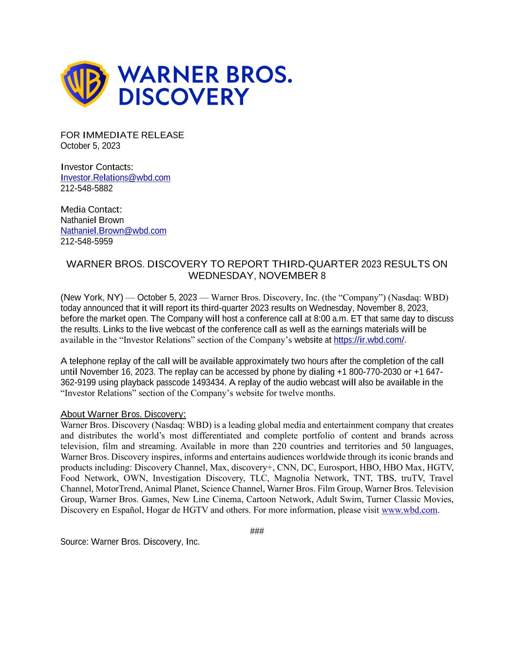 FOR IMMEDIATE RELEASE October 5, 2023 Investor Contacts: Investor.Relations@wbd.com 212-548-5882 Media Contact: Nathaniel Brown Nathaniel.Brown@wbd.com 212-548-5959 WARNER BROS. DISCOVERY TO REPORT THIRD-QUARTER 2023 RESULTS ON WEDNESDAY, NOVEMBER 8 (New York, NY) — October 5, 2023 — Warner Bros. Discovery, Inc. (the “Company”) (Nasdaq: WBD) today announced that it will report its third-quarter 2023 results on Wednesday, November 8, 2023, before the market open. The Company will host a conference call at 8:00 a.m. ET that same day to discuss the results. Links to the live webcast of the conference call as well as the earnings materials will be available in the “Investor Relations” section of the Company’s website at https://ir.wbd.com/. A telephone replay of the call will be available approximately two hours after the completion of the call until November 16, 2023. The replay can be accessed by phone by dialing +1 800-770-2030 or +1 647- 362-9199 using playback passcode 1493434. A replay of the audio webcast will also be available in the “Investor Relations” section of the Company’s website for twelve months. About Warner Bros. Discovery: Warner Bros. Discovery (Nasdaq: WBD) is a leading global media and entertainment company that creates and distributes the world’s most differentiated and complete portfolio of content and brands across television, film and streaming. Available in more than 220 countries and territories and 50 languages, Warner Bros. Discovery inspires, informs and entertains audiences worldwide through its iconic brands and products including: Discovery Channel, Max, discovery+, CNN, DC, Eurosport, HBO, HBO Max, HGTV, Food Network, OWN, Investigation Discovery, TLC, Magnolia Network, TNT, TBS, truTV, Travel Channel, MotorTrend, Animal Planet, Science Channel, Warner Bros. Film Group, Warner Bros. Television Group, Warner Bros. Games, New Line Cinema, Cartoon Network, Adult Swim, Turner Classic Movies, Discovery en Español, Hogar de HGTV and others. For more information, please visit www.wbd.com. ### Source: Warner Bros. Discovery, Inc.