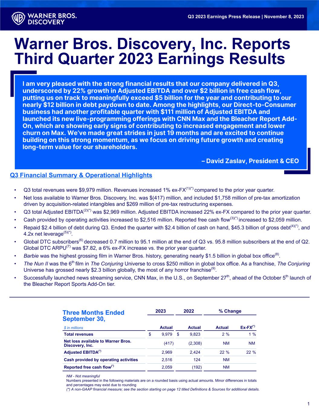 • Q3 total revenues were $9,979 million. Revenues increased 1% ex-FX(1)(*) compared to the prior year quarter. • Net loss available to Warner Bros. Discovery, Inc. was $(417) million, and included $1,758 million of pre-tax amortization driven by acquisition-related intangibles and $269 million of pre-tax restructuring expenses. • Q3 total Adjusted EBITDA(2)(*) was $2,969 million. Adjusted EBITDA increased 22% ex-FX compared to the prior year quarter. • Cash provided by operating activities increased to $2,516 million. Reported free cash flow(3)(*) increased to $2,059 million. • Repaid $2.4 billion of debt during Q3. Ended the quarter with $2.4 billion of cash on hand, $45.3 billion of gross debt(4)(*), and 4.2x net leverage(5)(*). • Global DTC subscribers(6) decreased 0.7 million to 95.1 million at the end of Q3 vs. 95.8 million subscribers at the end of Q2. Global DTC ARPU(7) was $7.82, a 6% ex-FX increase vs. the prior year quarter. • Barbie was the highest grossing film in Warner Bros. history, generating nearly $1.5 billion in global box office(8). • The Nun II was the 6th film in The Conjuring Universe to cross $250 million in global box office. As a franchise, The Conjuring Universe has grossed nearly $2.3 billion globally, the most of any horror franchise(9). • Successfully launched news streaming service, CNN Max, in the U.S., on September 27th, ahead of the October 5th launch of the Bleacher Report Sports Add-On tier. Q3 2023 Earnings Press Release | November 8, 2023 Q3 Financial Summary & Operational Highlights Warner Bros. Discovery, Inc. Reports Third Quarter 2023 Earnings Results 1 2023 2022 % Change $ in millions Actual Actual Actual Ex-FX(*) Total revenues $ 9,979 $ 9,823 2 % 1 % Net loss available to Warner Bros. Discovery, Inc. (417) (2,308) NM NM Adjusted EBITDA(*) 2,969 2,424 22 % 22 % Cash provided by operating activities 2,516 124 NM Reported free cash flow(*) 2,059 (192) NM Three Months Ended September 30, NM - Not meaningful Numbers presented in the following materials are on a rounded basis using actual amounts. Minor differences in totals and percentages may exist due to rounding (*) A non-GAAP financial measure; see the section starting on page 12 titled Definitions & Sources for additional details. I am very pleased with the strong financial results that our company delivered in Q3, underscored by 22% growth in Adjusted EBITDA and over $2 billion in free cash flow, putting us on track to meaningfully exceed $5 billion for the year and contributing to our nearly $12 billion in debt paydown to date. Among the highlights, our Direct-to-Consumer business had another profitable quarter with $111 million of Adjusted EBITDA and launched its new live-programming offerings with CNN Max and the Bleacher Report Add- On, which are showing early signs of contributing to increased engagement and lower churn on Max. We’ve made great strides in just 19 months and are excited to continue building on this strong momentum, as we focus on driving future growth and creating long-term value for our shareholders. – David Zaslav, President & CEO