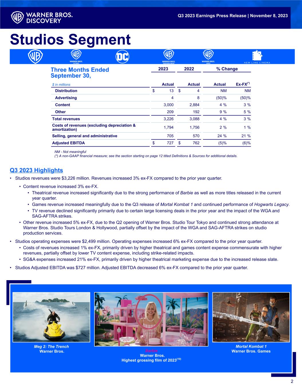• Studios revenues were $3,226 million. Revenues increased 3% ex-FX compared to the prior year quarter. • Content revenue increased 3% ex-FX. • Theatrical revenue increased significantly due to the strong performance of Barbie as well as more titles released in the current year quarter. • Games revenue increased meaningfully due to the Q3 release of Mortal Kombat 1 and continued performance of Hogwarts Legacy. • TV revenue declined significantly primarily due to certain large licensing deals in the prior year and the impact of the WGA and SAG-AFTRA strikes. • Other revenue increased 5% ex-FX, due to the Q2 opening of Warner Bros. Studio Tour Tokyo and continued strong attendance at Warner Bros. Studio Tours London & Hollywood, partially offset by the impact of the WGA and SAG-AFTRA strikes on studio production services. • Studios operating expenses were $2,499 million. Operating expenses increased 6% ex-FX compared to the prior year quarter. • Costs of revenues increased 1% ex-FX, primarily driven by higher theatrical and games content expense commensurate with higher revenues, partially offset by lower TV content expense, including strike-related impacts. • SG&A expenses increased 21% ex-FX, primarily driven by higher theatrical marketing expense due to the increased release slate. • Studios Adjusted EBITDA was $727 million. Adjusted EBITDA decreased 6% ex-FX compared to the prior year quarter. 2 Studios Segment NM - Not meaningful (*) A non-GAAP financial measure; see the section starting on page 12 titled Definitions & Sources for additional details. Q3 2023 Highlights Mortal Kombat 1 Warner Bros. Games Three Months Ended September 30, Meg 2: The Trench Warner Bros. Q3 2023 Earnings Press Release | November 8, 2023 Barbie Warner Bros. Highest grossing film of 2023(10) 2023 2022 % Change $ in millions Actual Actual Actual Ex-FX(*) Distribution $ 13 $ 4 NM NM Advertising 4 8 (50) % (50) % Content 3,000 2,884 4 % 3 % Other 209 192 9 % 5 % Total revenues 3,226 3,088 4 % 3 % Costs of revenues (excluding depreciation & amortization) 1,794 1,756 2 % 1 % Selling, general and administrative 705 570 24 % 21 % Adjusted EBITDA $ 727 $ 762 (5) % (6) %