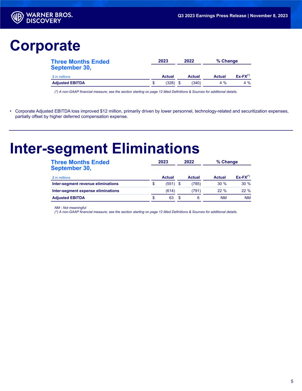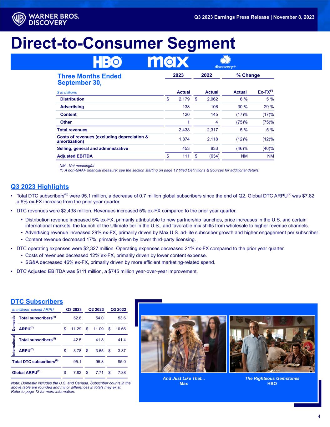4 2023 2022 % Change $ in millions Actual Actual Actual Ex-FX(*) Distribution $ 2,179 $ 2,062 6 % 5 % Advertising 138 106 30 % 29 % Content 120 145 (17) % (17) % Other 1 4 (75) % (75) % Total revenues 2,438 2,317 5 % 5 % Costs of revenues (excluding depreciation & amortization) 1,874 2,118 (12) % (12) % Selling, general and administrative 453 833 (46) % (46) % Adjusted EBITDA $ 111 $ (634) NM NM Three Months Ended September 30, In millions, except ARPU Q3 2023 Q2 2023 Q3 2022 Total subscribers(6) 52.6 54.0 53.6 ARPU(7) $ 11.29 $ 11.09 $ 10.66 Total subscribers(6) 42.5 41.8 41.4 ARPU(7) $ 3.78 $ 3.65 $ 3.37 Total DTC subscribers(6) 95.1 95.8 95.0 Global ARPU(7) $ 7.82 $ 7.71 $ 7.38 DTC Subscribers Direct-to-Consumer Segment In te rn at io na l D om es tic Note: Domestic includes the U.S. and Canada. Subscriber counts in the above table are rounded and minor differences in totals may exist. Refer to page 12 for more information. Q3 2023 Highlights Q3 2023 Earnings Press Release | November 8, 2023 The Righteous Gemstones HBO And Just Like That... Max NM - Not meaningful (*) A non-GAAP financial measure; see the section starting on page 12 titled Definitions & Sources for additional details. • Total DTC subscribers(6) were 95.1 million, a decrease of 0.7 million global subscribers since the end of Q2. Global DTC ARPU(7) was $7.82, a 6% ex-FX increase from the prior year quarter. • DTC revenues were $2,438 million. Revenues increased 5% ex-FX compared to the prior year quarter. • Distribution revenue increased 5% ex-FX, primarily attributable to new partnership launches, price increases in the U.S. and certain international markets, the launch of the Ultimate tier in the U.S., and favorable mix shifts from wholesale to higher revenue channels. • Advertising revenue increased 29% ex-FX, primarily driven by Max U.S. ad-lite subscriber growth and higher engagement per subscriber. • Content revenue decreased 17%, primarily driven by lower third-party licensing. • DTC operating expenses were $2,327 million. Operating expenses decreased 21% ex-FX compared to the prior year quarter. • Costs of revenues decreased 12% ex-FX, primarily driven by lower content expense. • SG&A decreased 46% ex-FX, primarily driven by more efficient marketing-related spend. • DTC Adjusted EBITDA was $111 million, a $745 million year-over-year improvement.