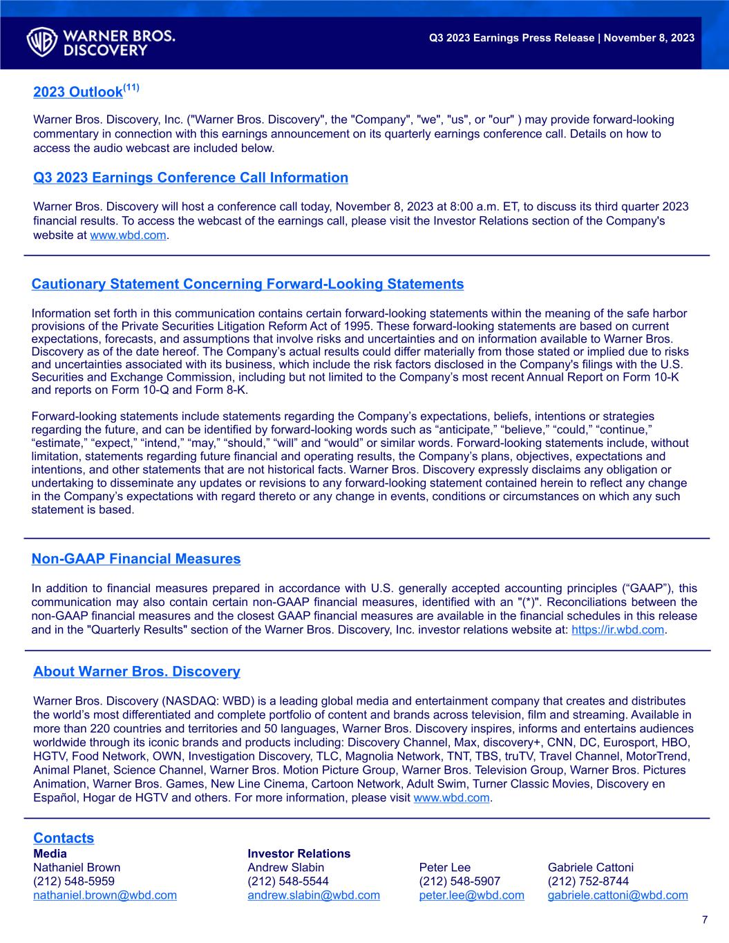 Cautionary Statement Concerning Forward-Looking Statements Information set forth in this communication contains certain forward-looking statements within the meaning of the safe harbor provisions of the Private Securities Litigation Reform Act of 1995. These forward-looking statements are based on current expectations, forecasts, and assumptions that involve risks and uncertainties and on information available to Warner Bros. Discovery as of the date hereof. The Company’s actual results could differ materially from those stated or implied due to risks and uncertainties associated with its business, which include the risk factors disclosed in the Company's filings with the U.S. Securities and Exchange Commission, including but not limited to the Company’s most recent Annual Report on Form 10-K and reports on Form 10-Q and Form 8-K. Forward-looking statements include statements regarding the Company’s expectations, beliefs, intentions or strategies regarding the future, and can be identified by forward-looking words such as “anticipate,” “believe,” “could,” “continue,” “estimate,” “expect,” “intend,” “may,” “should,” “will” and “would” or similar words. Forward-looking statements include, without limitation, statements regarding future financial and operating results, the Company’s plans, objectives, expectations and intentions, and other statements that are not historical facts. Warner Bros. Discovery expressly disclaims any obligation or undertaking to disseminate any updates or revisions to any forward-looking statement contained herein to reflect any change in the Company’s expectations with regard thereto or any change in events, conditions or circumstances on which any such statement is based. 7 2023 Outlook(11) Warner Bros. Discovery, Inc. ("Warner Bros. Discovery", the "Company", "we", "us", or "our" ) may provide forward-looking commentary in connection with this earnings announcement on its quarterly earnings conference call. Details on how to access the audio webcast are included below. Q3 2023 Earnings Conference Call Information Warner Bros. Discovery will host a conference call today, November 8, 2023 at 8:00 a.m. ET, to discuss its third quarter 2023 financial results. To access the webcast of the earnings call, please visit the Investor Relations section of the Company's website at www.wbd.com. About Warner Bros. Discovery Warner Bros. Discovery (NASDAQ: WBD) is a leading global media and entertainment company that creates and distributes the world’s most differentiated and complete portfolio of content and brands across television, film and streaming. Available in more than 220 countries and territories and 50 languages, Warner Bros. Discovery inspires, informs and entertains audiences worldwide through its iconic brands and products including: Discovery Channel, Max, discovery+, CNN, DC, Eurosport, HBO, HGTV, Food Network, OWN, Investigation Discovery, TLC, Magnolia Network, TNT, TBS, truTV, Travel Channel, MotorTrend, Animal Planet, Science Channel, Warner Bros. Motion Picture Group, Warner Bros. Television Group, Warner Bros. Pictures Animation, Warner Bros. Games, New Line Cinema, Cartoon Network, Adult Swim, Turner Classic Movies, Discovery en Español, Hogar de HGTV and others. For more information, please visit www.wbd.com. Non-GAAP Financial Measures In addition to financial measures prepared in accordance with U.S. generally accepted accounting principles (“GAAP”), this communication may also contain certain non-GAAP financial measures, identified with an "(*)". Reconciliations between the non-GAAP financial measures and the closest GAAP financial measures are available in the financial schedules in this release and in the "Quarterly Results" section of the Warner Bros. Discovery, Inc. investor relations website at: https://ir.wbd.com. Q3 2023 Earnings Press Release | November 8, 2023 Contacts Media Investor Relations Nathaniel Brown Andrew Slabin Peter Lee Gabriele Cattoni (212) 548-5959 (212) 548-5544 (212) 548-5907 (212) 752-8744 nathaniel.brown@wbd.com andrew.slabin@wbd.com peter.lee@wbd.com gabriele.cattoni@wbd.com