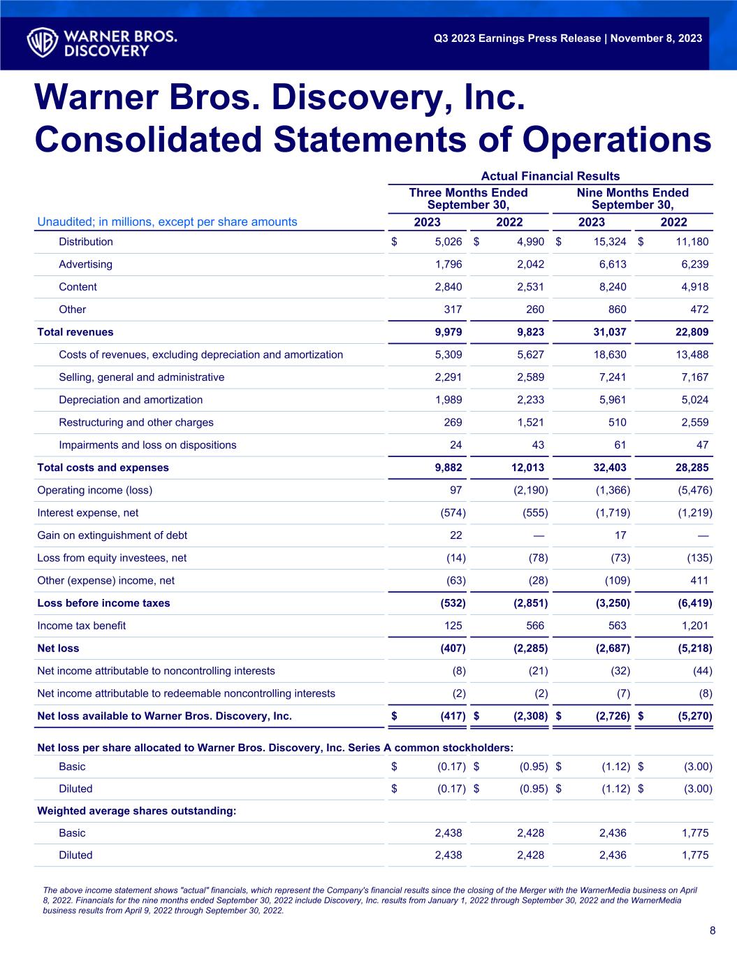 Actual Financial Results Three Months Ended September 30, Nine Months Ended September 30, Unaudited; in millions, except per share amounts 2023 2022 2023 2022 Distribution $ 5,026 $ 4,990 $ 15,324 $ 11,180 Advertising 1,796 2,042 6,613 6,239 Content 2,840 2,531 8,240 4,918 Other 317 260 860 472 Total revenues 9,979 9,823 31,037 22,809 Costs of revenues, excluding depreciation and amortization 5,309 5,627 18,630 13,488 Selling, general and administrative 2,291 2,589 7,241 7,167 Depreciation and amortization 1,989 2,233 5,961 5,024 Restructuring and other charges 269 1,521 510 2,559 Impairments and loss on dispositions 24 43 61 47 Total costs and expenses 9,882 12,013 32,403 28,285 Operating income (loss) 97 (2,190) (1,366) (5,476) Interest expense, net (574) (555) (1,719) (1,219) Gain on extinguishment of debt 22 — 17 — Loss from equity investees, net (14) (78) (73) (135) Other (expense) income, net (63) (28) (109) 411 Loss before income taxes (532) (2,851) (3,250) (6,419) Income tax benefit 125 566 563 1,201 Net loss (407) (2,285) (2,687) (5,218) Net income attributable to noncontrolling interests (8) (21) (32) (44) Net income attributable to redeemable noncontrolling interests (2) (2) (7) (8) Net loss available to Warner Bros. Discovery, Inc. $ (417) $ (2,308) $ (2,726) $ (5,270) Net loss per share allocated to Warner Bros. Discovery, Inc. Series A common stockholders: Basic $ (0.17) $ (0.95) $ (1.12) $ (3.00) Diluted $ (0.17) $ (0.95) $ (1.12) $ (3.00) Weighted average shares outstanding: Basic 2,438 2,428 2,436 1,775 Diluted 2,438 2,428 2,436 1,775 8 Warner Bros. Discovery, Inc. Consolidated Statements of Operations The above income statement shows "actual" financials, which represent the Company's financial results since the closing of the Merger with the WarnerMedia business on April 8, 2022. Financials for the nine months ended September 30, 2022 include Discovery, Inc. results from January 1, 2022 through September 30, 2022 and the WarnerMedia business results from April 9, 2022 through September 30, 2022. Q3 2023 Earnings Press Release | November 8, 2023