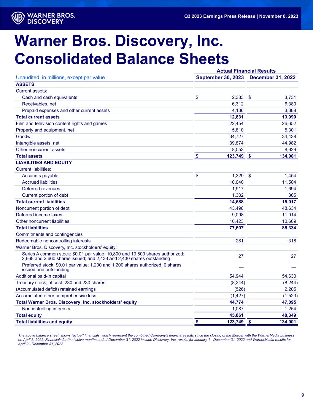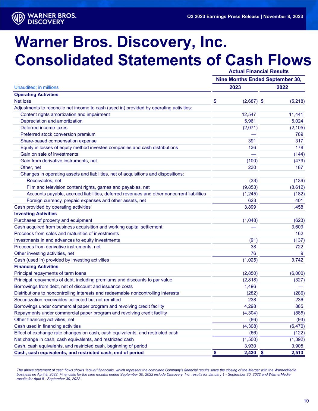 The above balance sheet shows "actual" financials, which represent the combined Company's financial results since the closing of the Merger with the WarnerMedia business on April 8, 2022. Financials for the twelve months ended December 31, 2022 include Discovery, Inc. results for January 1 - December 31, 2022 and WarnerMedia results for April 9 - December 31, 2022. 9 Actual Financial Results Unaudited; in millions, except par value September 30, 2023 December 31, 2022 ASSETS Current assets: Cash and cash equivalents $ 2,383 $ 3,731 Receivables, net 6,312 6,380 Prepaid expenses and other current assets 4,136 3,888 Total current assets 12,831 13,999 Film and television content rights and games 22,454 26,652 Property and equipment, net 5,810 5,301 Goodwill 34,727 34,438 Intangible assets, net 39,874 44,982 Other noncurrent assets 8,053 8,629 Total assets $ 123,749 $ 134,001 LIABILITIES AND EQUITY Current liabilities: Accounts payable $ 1,329 $ 1,454 Accrued liabilities 10,040 11,504 Deferred revenues 1,917 1,694 Current portion of debt 1,302 365 Total current liabilities 14,588 15,017 Noncurrent portion of debt 43,498 48,634 Deferred income taxes 9,098 11,014 Other noncurrent liabilities 10,423 10,669 Total liabilities 77,607 85,334 Commitments and contingencies Redeemable noncontrolling interests 281 318 Warner Bros. Discovery, Inc. stockholders’ equity: Series A common stock: $0.01 par value; 10,800 and 10,800 shares authorized; 2,668 and 2,660 shares issued; and 2,438 and 2,430 shares outstanding 27 27 Preferred stock: $0.01 par value; 1,200 and 1,200 shares authorized, 0 shares issued and outstanding — — Additional paid-in capital 54,944 54,630 Treasury stock, at cost: 230 and 230 shares (8,244) (8,244) (Accumulated deficit) retained earnings (526) 2,205 Accumulated other comprehensive loss (1,427) (1,523) Total Warner Bros. Discovery, Inc. stockholders’ equity 44,774 47,095 Noncontrolling interests 1,087 1,254 Total equity 45,861 48,349 Total liabilities and equity $ 123,749 $ 134,001 9 Warner Bros. Discovery, Inc. Consolidated Balance Sheets Q3 2023 Earnings Press Release | November 8, 2023