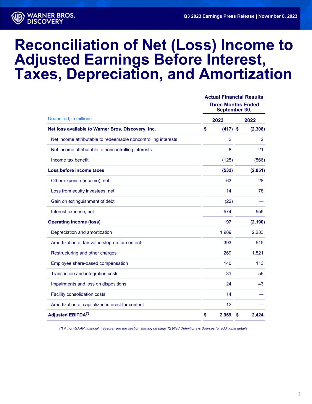 10 Actual Financial Results Nine Months Ended September 30, Unaudited; in millions 2023 2022 Operating Activities Net loss $ (2,687) $ (5,218) Adjustments to reconcile net income to cash (used in) provided by operating activities: Content rights amortization and impairment 12,547 11,441 Depreciation and amortization 5,961 5,024 Deferred income taxes (2,071) (2,105) Preferred stock conversion premium — 789 Share-based compensation expense 391 317 Equity in losses of equity method investee companies and cash distributions 136 178 Gain on sale of investments — (144) Gain from derivative instruments, net (100) (479) Other, net 230 187 Changes in operating assets and liabilities, net of acquisitions and dispositions: Receivables, net (33) (139) Film and television content rights, games and payables, net (9,853) (8,612) Accounts payable, accrued liabilities, deferred revenues and other noncurrent liabilities (1,245) (182) Foreign currency, prepaid expenses and other assets, net 623 401 Cash provided by operating activities 3,899 1,458 Investing Activities Purchases of property and equipment (1,048) (623) Cash acquired from business acquisition and working capital settlement — 3,609 Proceeds from sales and maturities of investments — 162 Investments in and advances to equity investments (91) (137) Proceeds from derivative instruments, net 38 722 Other investing activities, net 76 9 Cash (used in) provided by investing activities (1,025) 3,742 Financing Activities Principal repayments of term loans (2,850) (6,000) Principal repayments of debt, including premiums and discounts to par value (2,818) (327) Borrowings from debt, net of discount and issuance costs 1,496 — Distributions to noncontrolling interests and redeemable noncontrolling interests (282) (286) Securitization receivables collected but not remitted 238 236 Borrowings under commercial paper program and revolving credit facility 4,298 885 Repayments under commercial paper program and revolving credit facility (4,304) (885) Other financing activities, net (86) (93) Cash used in financing activities (4,308) (6,470) Effect of exchange rate changes on cash, cash equivalents, and restricted cash (66) (122) Net change in cash, cash equivalents, and restricted cash (1,500) (1,392) Cash, cash equivalents, and restricted cash, beginning of period 3,930 3,905 Cash, cash equivalents, and restricted cash, end of period $ 2,430 $ 2,513 10 Warner Bros. Discovery, Inc. Consolidated Statements of Cash Flows The above statement of cash flows shows "actual" financials, which represent the combined Company's financial results since the closing of the Merger with the WarnerMedia business on April 8, 2022. Financials for the nine months ended September 30, 2022 include Discovery, Inc. results for January 1 - September 30, 2022 and WarnerMedia results for April 9 - September 30, 2022. Q3 2023 Earnings Press Release | November 8, 2023