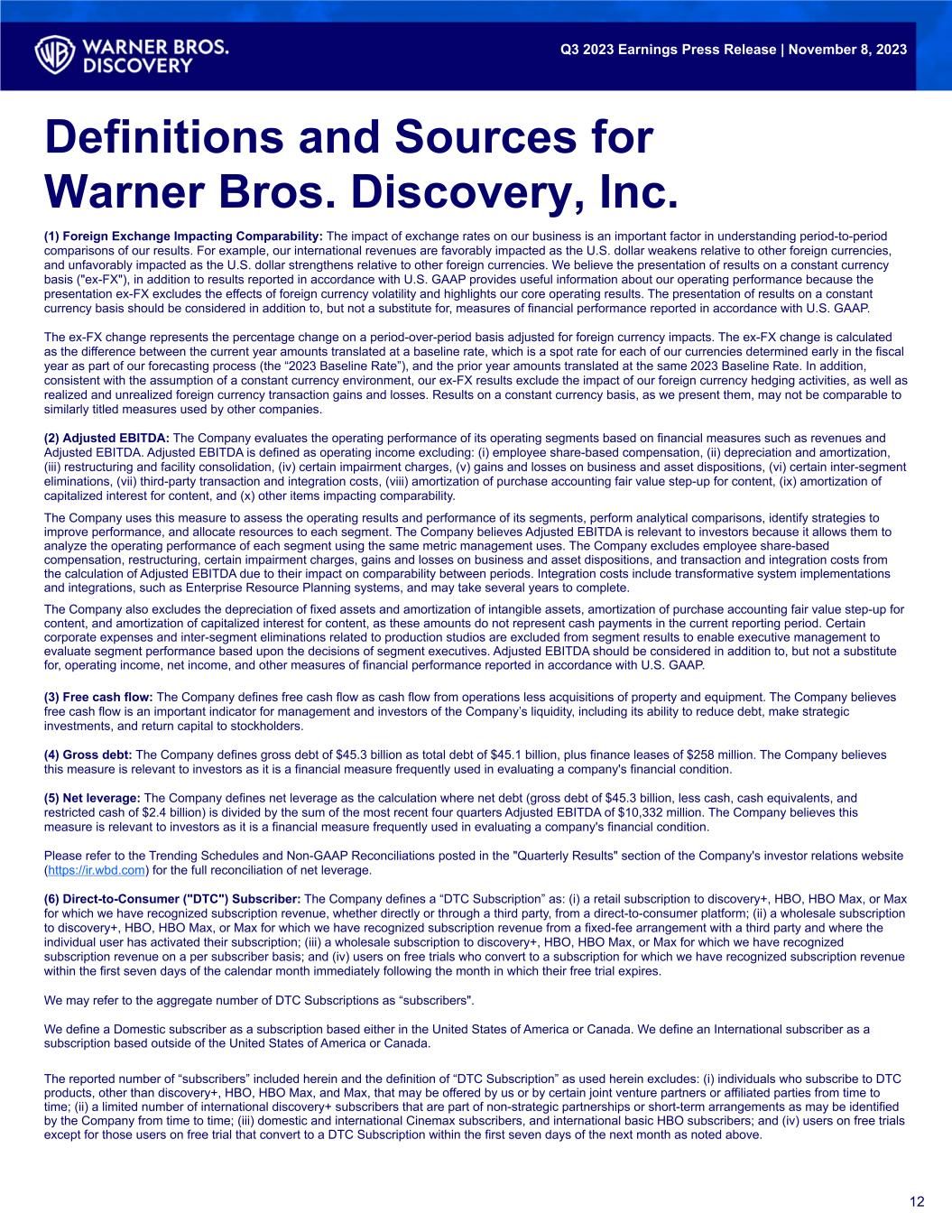 (1) Foreign Exchange Impacting Comparability: The impact of exchange rates on our business is an important factor in understanding period-to-period comparisons of our results. For example, our international revenues are favorably impacted as the U.S. dollar weakens relative to other foreign currencies, and unfavorably impacted as the U.S. dollar strengthens relative to other foreign currencies. We believe the presentation of results on a constant currency basis ("ex-FX"), in addition to results reported in accordance with U.S. GAAP provides useful information about our operating performance because the presentation ex-FX excludes the effects of foreign currency volatility and highlights our core operating results. The presentation of results on a constant currency basis should be considered in addition to, but not a substitute for, measures of financial performance reported in accordance with U.S. GAAP. The ex-FX change represents the percentage change on a period-over-period basis adjusted for foreign currency impacts. The ex-FX change is calculated as the difference between the current year amounts translated at a baseline rate, which is a spot rate for each of our currencies determined early in the fiscal year as part of our forecasting process (the “2023 Baseline Rate”), and the prior year amounts translated at the same 2023 Baseline Rate. In addition, consistent with the assumption of a constant currency environment, our ex-FX results exclude the impact of our foreign currency hedging activities, as well as realized and unrealized foreign currency transaction gains and losses. Results on a constant currency basis, as we present them, may not be comparable to similarly titled measures used by other companies. (2) Adjusted EBITDA: The Company evaluates the operating performance of its operating segments based on financial measures such as revenues and Adjusted EBITDA. Adjusted EBITDA is defined as operating income excluding: (i) employee share-based compensation, (ii) depreciation and amortization, (iii) restructuring and facility consolidation, (iv) certain impairment charges, (v) gains and losses on business and asset dispositions, (vi) certain inter-segment eliminations, (vii) third-party transaction and integration costs, (viii) amortization of purchase accounting fair value step-up for content, (ix) amortization of capitalized interest for content, and (x) other items impacting comparability. The Company uses this measure to assess the operating results and performance of its segments, perform analytical comparisons, identify strategies to improve performance, and allocate resources to each segment. The Company believes Adjusted EBITDA is relevant to investors because it allows them to analyze the operating performance of each segment using the same metric management uses. The Company excludes employee share-based compensation, restructuring, certain impairment charges, gains and losses on business and asset dispositions, and transaction and integration costs from the calculation of Adjusted EBITDA due to their impact on comparability between periods. Integration costs include transformative system implementations and integrations, such as Enterprise Resource Planning systems, and may take several years to complete. The Company also excludes the depreciation of fixed assets and amortization of intangible assets, amortization of purchase accounting fair value step-up for content, and amortization of capitalized interest for content, as these amounts do not represent cash payments in the current reporting period. Certain corporate expenses and inter-segment eliminations related to production studios are excluded from segment results to enable executive management to evaluate segment performance based upon the decisions of segment executives. Adjusted EBITDA should be considered in addition to, but not a substitute for, operating income, net income, and other measures of financial performance reported in accordance with U.S. GAAP. (3) Free cash flow: The Company defines free cash flow as cash flow from operations less acquisitions of property and equipment. The Company believes free cash flow is an important indicator for management and investors of the Company’s liquidity, including its ability to reduce debt, make strategic investments, and return capital to stockholders. (4) Gross debt: The Company defines gross debt of $45.3 billion as total debt of $45.1 billion, plus finance leases of $258 million. The Company believes this measure is relevant to investors as it is a financial measure frequently used in evaluating a company's financial condition. (5) Net leverage: The Company defines net leverage as the calculation where net debt (gross debt of $45.3 billion, less cash, cash equivalents, and restricted cash of $2.4 billion) is divided by the sum of the most recent four quarters Adjusted EBITDA of $10,332 million. The Company believes this measure is relevant to investors as it is a financial measure frequently used in evaluating a company's financial condition. Please refer to the Trending Schedules and Non-GAAP Reconciliations posted in the "Quarterly Results" section of the Company's investor relations website (https://ir.wbd.com) for the full reconciliation of net leverage. (6) Direct-to-Consumer ("DTC") Subscriber: The Company defines a “DTC Subscription” as: (i) a retail subscription to discovery+, HBO, HBO Max, or Max for which we have recognized subscription revenue, whether directly or through a third party, from a direct-to-consumer platform; (ii) a wholesale subscription to discovery+, HBO, HBO Max, or Max for which we have recognized subscription revenue from a fixed-fee arrangement with a third party and where the individual user has activated their subscription; (iii) a wholesale subscription to discovery+, HBO, HBO Max, or Max for which we have recognized subscription revenue on a per subscriber basis; and (iv) users on free trials who convert to a subs