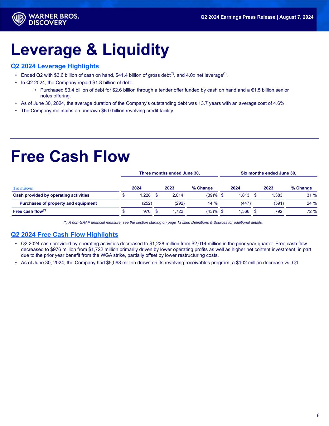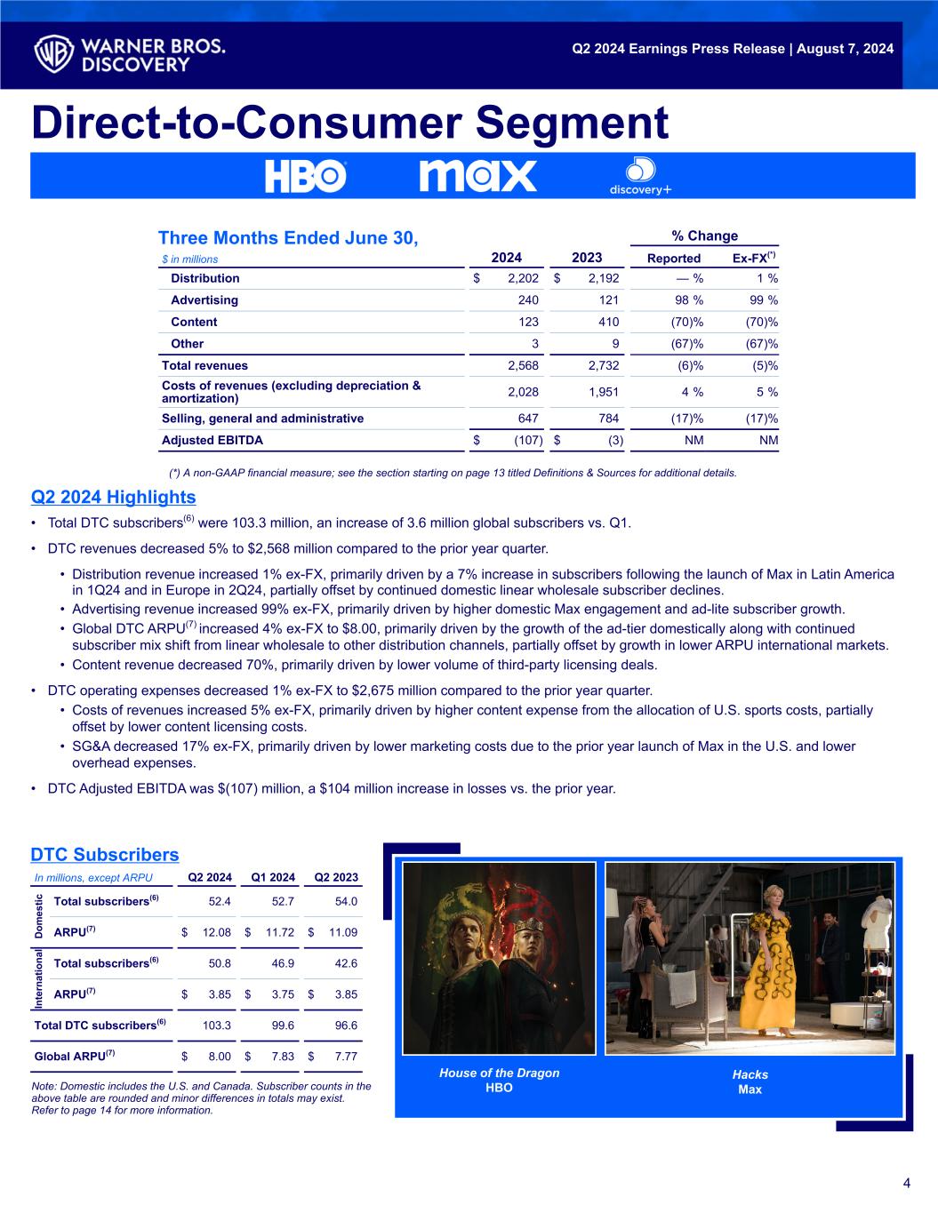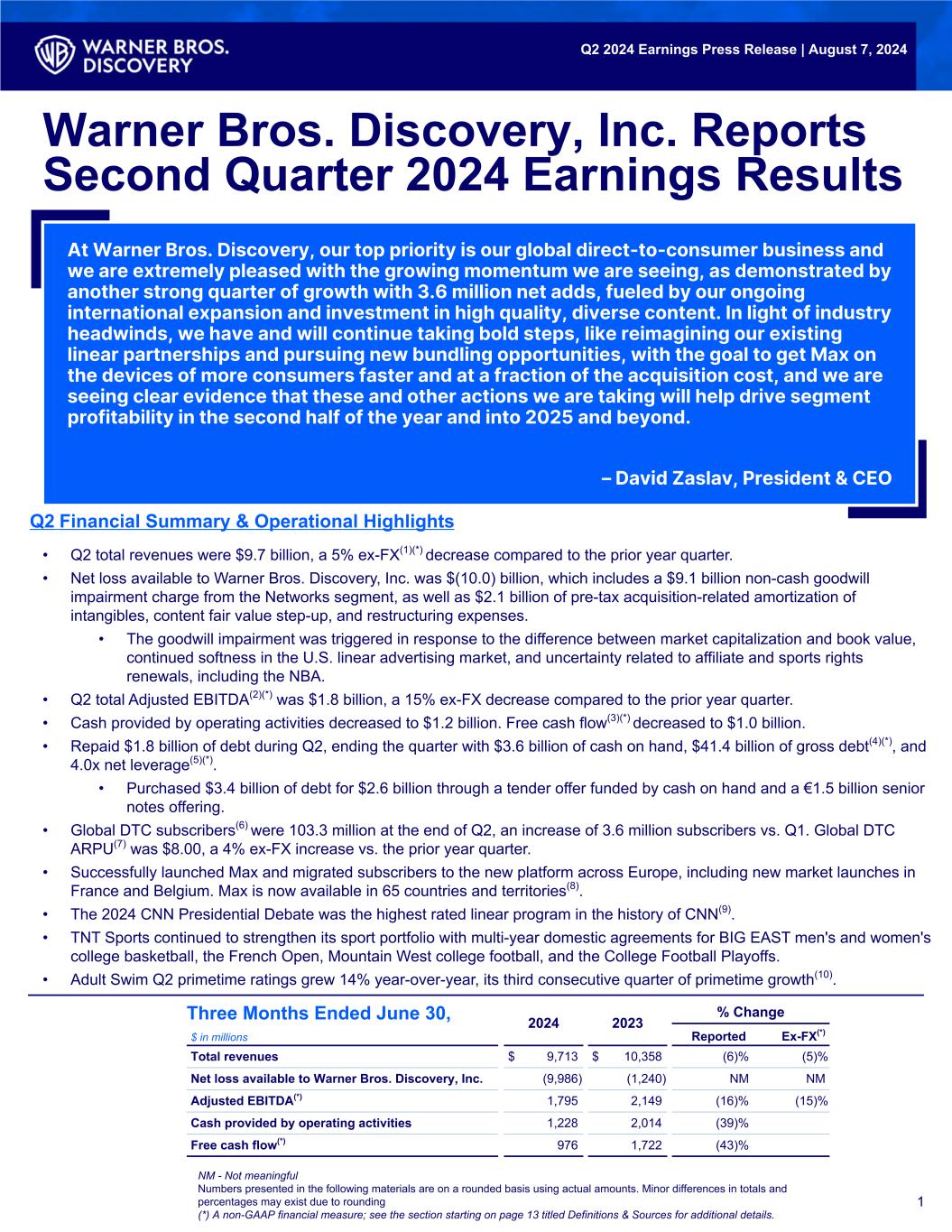 Q2 2024 Earnings Press Release | August 7, 2024 Q2 Financial Summary & Operational Highlights Warner Bros. Discovery, Inc. Reports Second Quarter 2024 Earnings Results 1 2024 2023 % Change $ in millions Reported Ex-FX(*) Total revenues $ 9,713 $ 10,358 (6) % (5) % Net loss available to Warner Bros. Discovery, Inc. (9,986) (1,240) NM NM Adjusted EBITDA(*) 1,795 2,149 (16) % (15) % Cash provided by operating activities 1,228 2,014 (39) % Free cash flow(*) 976 1,722 (43) % Three Months Ended June 30, NM - Not meaningful Numbers presented in the following materials are on a rounded basis using actual amounts. Minor differences in totals and percentages may exist due to rounding (*) A non-GAAP financial measure; see the section starting on page 13 titled Definitions & Sources for additional details. • Q2 total revenues were $9.7 billion, a 5% ex-FX(1)(*) decrease compared to the prior year quarter. • Net loss available to Warner Bros. Discovery, Inc. was $(10.0) billion, which includes a $9.1 billion non-cash goodwill impairment charge from the Networks segment, as well as $2.1 billion of pre-tax acquisition-related amortization of intangibles, content fair value step-up, and restructuring expenses. • The goodwill impairment was triggered in response to the difference between market capitalization and book value, continued softness in the U.S. linear advertising market, and uncertainty related to affiliate and sports rights renewals, including the NBA. • Q2 total Adjusted EBITDA(2)(*) was $1.8 billion, a 15% ex-FX decrease compared to the prior year quarter. • Cash provided by operating activities decreased to $1.2 billion. Free cash flow(3)(*) decreased to $1.0 billion. • Repaid $1.8 billion of debt during Q2, ending the quarter with $3.6 billion of cash on hand, $41.4 billion of gross debt(4)(*), and 4.0x net leverage(5)(*). • Purchased $3.4 billion of debt for $2.6 billion through a tender offer funded by cash on hand and a €1.5 billion senior notes offering. • Global DTC subscribers(6) were 103.3 million at the end of Q2, an increase of 3.6 million subscribers vs. Q1. Global DTC ARPU(7) was $8.00, a 4% ex-FX increase vs. the prior year quarter. • Successfully launched Max and migrated subscribers to the new platform across Europe, including new market launches in France and Belgium. Max is now available in 65 countries and territories(8). • The 2024 CNN Presidential Debate was the highest rated linear program in the history of CNN(9). • TNT Sports continued to strengthen its sport portfolio with multi-year domestic agreements for BIG EAST men's and women's college basketball, the French Open, Mountain West college football, and the College Football Playoffs. • Adult Swim Q2 primetime ratings grew 14% year-over-year, its third consecutive quarter of primetime growth(10). At Warner Bros. Discovery, our top priority is our global direct-to-consumer business and we are extremely pleased with the growing momentum we are seeing, as demonstrated by another strong quarter of growth with 3.6 million net adds, fueled by our ongoing international expansion and investment in high quality, diverse content. In light of industry headwinds, we have and will continue taking bold steps, like reimagining our existing linear partnerships and pursuing new bundling opportunities, with the goal to get Max on the devices of more consumers faster and at a fraction of the acquisition cost, and we are seeing clear evidence that these and other actions we are taking will help drive segment profitability in the second half of the year and into 2025 and beyond. – David Zaslav, President & CEO