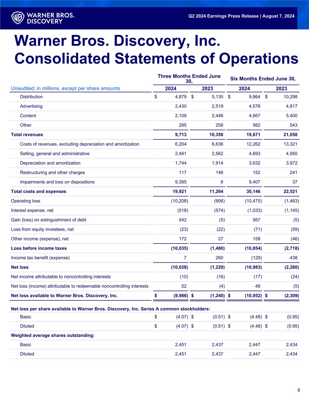 Three Months Ended June 30, Six Months Ended June 30, Unaudited; in millions, except per share amounts 2024 2023 2024 2023 Distribution $ 4,879 $ 5,135 $ 9,864 $ 10,298 Advertising 2,430 2,519 4,578 4,817 Content 2,109 2,446 4,667 5,400 Other 295 258 562 543 Total revenues 9,713 10,358 19,671 21,058 Costs of revenues, excluding depreciation and amortization 6,204 6,636 12,262 13,321 Selling, general and administrative 2,461 2,562 4,693 4,950 Depreciation and amortization 1,744 1,914 3,632 3,972 Restructuring and other charges 117 146 152 241 Impairments and loss on dispositions 9,395 6 9,407 37 Total costs and expenses 19,921 11,264 30,146 22,521 Operating loss (10,208) (906) (10,475) (1,463) Interest expense, net (518) (574) (1,033) (1,145) Gain (loss) on extinguishment of debt 542 (5) 567 (5) Loss from equity investees, net (23) (22) (71) (59) Other income (expense), net 172 27 158 (46) Loss before income taxes (10,035) (1,480) (10,854) (2,718) Income tax benefit (expense) 7 260 (129) 438 Net loss (10,028) (1,220) (10,983) (2,280) Net income attributable to noncontrolling interests (10) (16) (17) (24) Net loss (income) attributable to redeemable noncontrolling interests 52 (4) 48 (5) Net loss available to Warner Bros. Discovery, Inc. $ (9,986) $ (1,240) $ (10,952) $ (2,309) Net loss per share available to Warner Bros. Discovery, Inc. Series A common stockholders: Basic $ (4.07) $ (0.51) $ (4.48) $ (0.95) Diluted $ (4.07) $ (0.51) $ (4.48) $ (0.95) Weighted average shares outstanding: Basic 2,451 2,437 2,447 2,434 Diluted 2,451 2,437 2,447 2,434 8 Warner Bros. Discovery, Inc. Consolidated Statements of Operations Q2 2024 Earnings Press Release | August 7, 2024