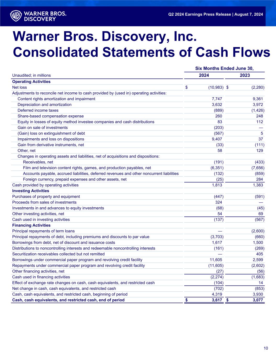9 Unaudited; in millions, except par value June 30, 2024 December 31, 2023 ASSETS Current assets: Cash and cash equivalents $ 3,613 $ 3,780 Receivables, net 6,166 6,047 Prepaid expenses and other current assets 3,651 4,391 Total current assets 13,430 14,218 Film and television content rights and games 20,010 21,229 Property and equipment, net 6,043 5,957 Goodwill 25,740 34,969 Intangible assets, net 35,157 38,285 Other noncurrent assets 7,649 8,099 Total assets $ 108,029 $ 122,757 LIABILITIES AND EQUITY Current liabilities: Accounts payable $ 1,151 $ 1,260 Accrued liabilities 10,926 10,368 Deferred revenues 2,022 1,924 Current portion of debt 3,669 1,780 Total current liabilities 17,768 15,332 Noncurrent portion of debt 37,289 41,889 Deferred income taxes 7,806 8,736 Other noncurrent liabilities 9,751 10,328 Total liabilities 72,614 76,285 Commitments and contingencies Redeemable noncontrolling interests 118 165 Warner Bros. Discovery, Inc. stockholders’ equity: Series A common stock: $0.01 par value; 10,800 and 10,800 shares authorized; 2,681 and 2,669 shares issued; and 2,451 and 2,439 shares outstanding 27 27 Preferred stock: $0.01 par value; 1,200 and 1,200 shares authorized, 0 shares issued and outstanding — — Additional paid-in capital 55,332 55,112 Treasury stock, at cost: 230 and 230 shares (8,244) (8,244) Accumulated deficit (11,880) (928) Accumulated other comprehensive loss (890) (741) Total Warner Bros. Discovery, Inc. stockholders’ equity 34,345 45,226 Noncontrolling interests 952 1,081 Total equity 35,297 46,307 Total liabilities and equity $ 108,029 $ 122,757 9 Warner Bros. Discovery, Inc. Consolidated Balance Sheets Q2 2024 Earnings Press Release | August 7, 2024